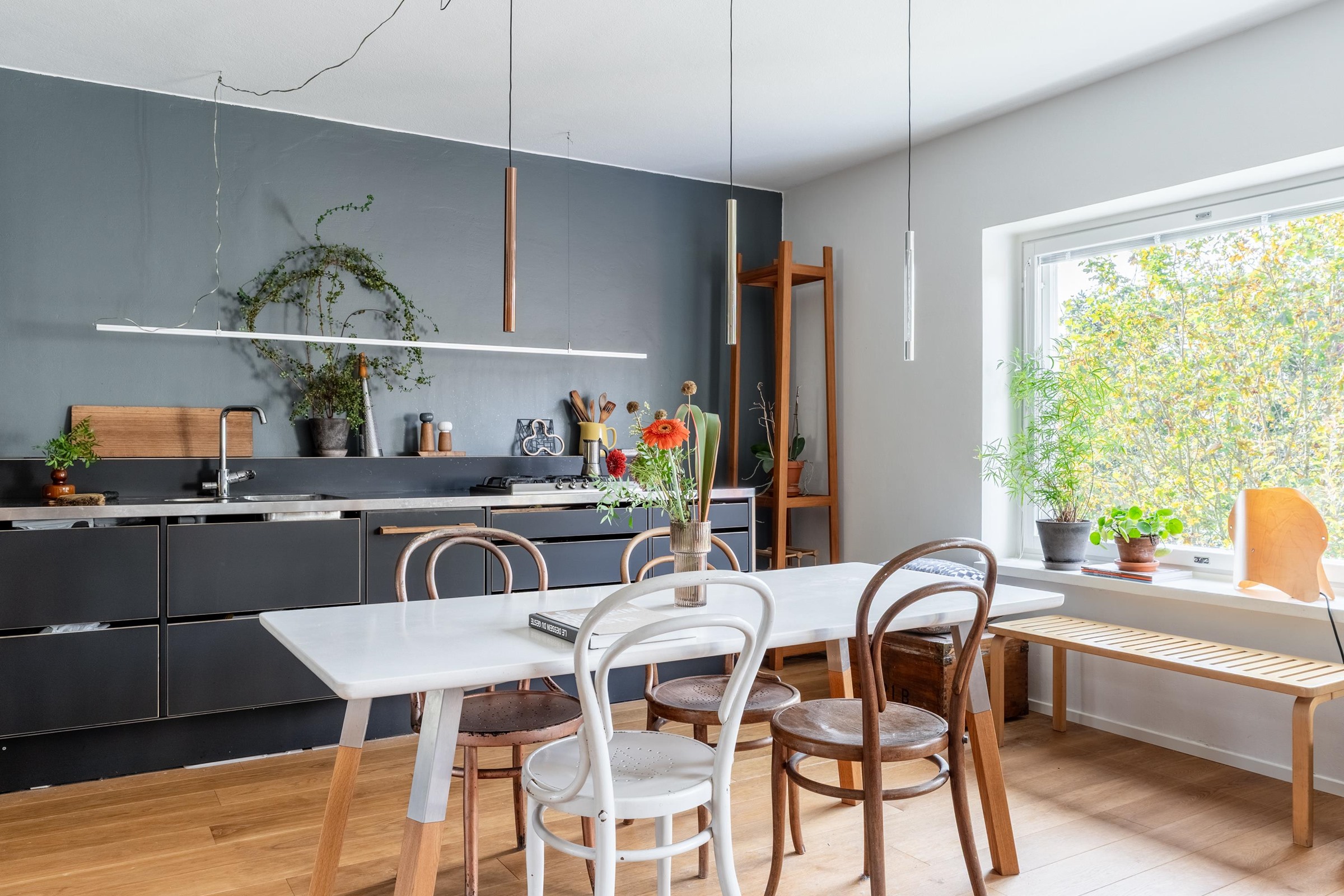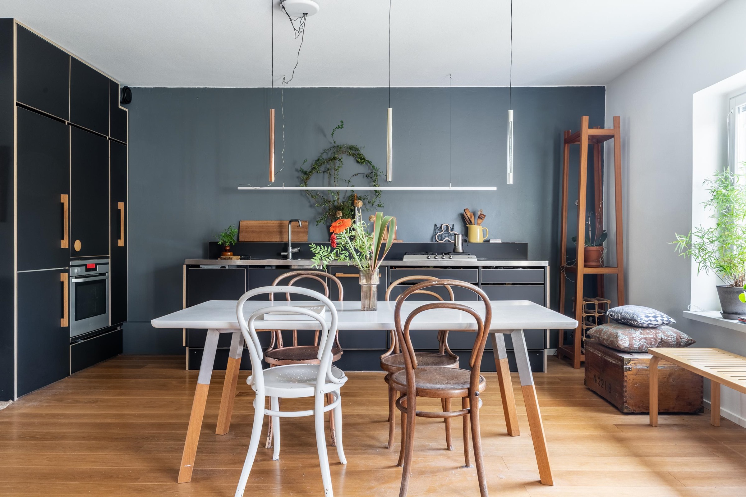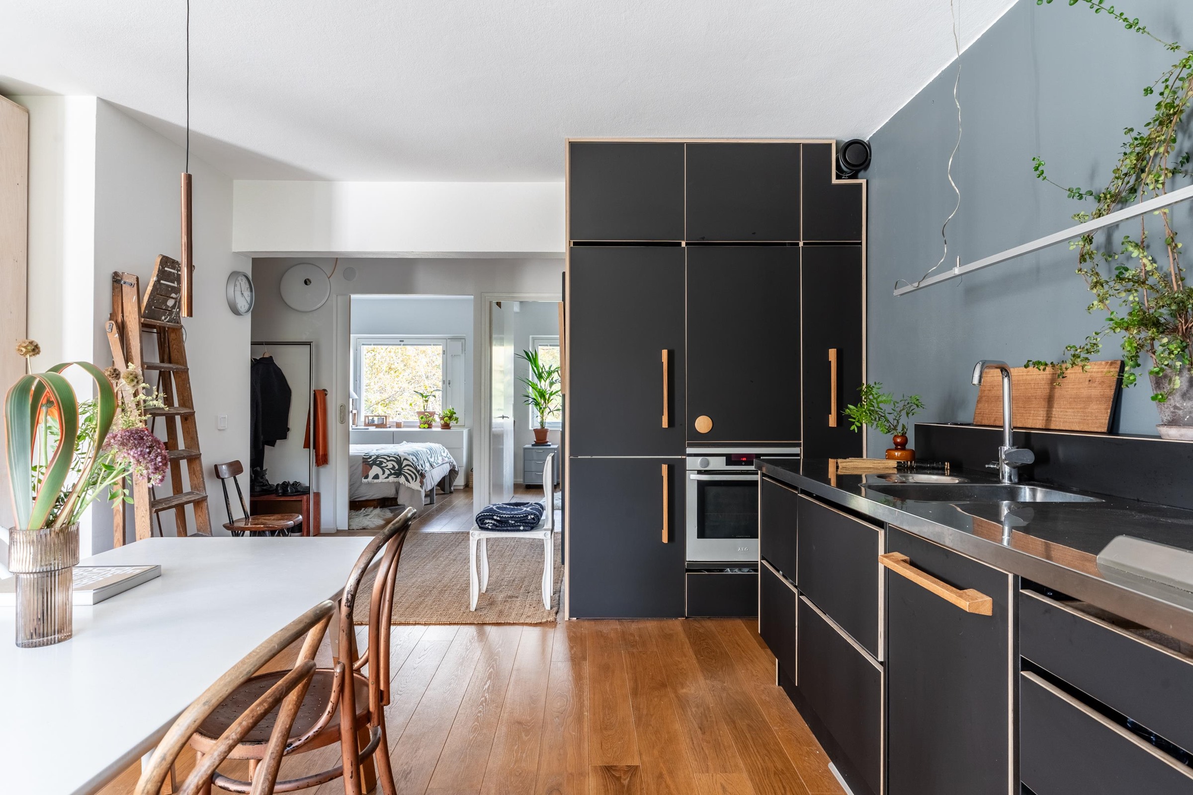 Keittiö on siirretty olohuoneen yhteyteen, mikä tekee kodista yhtenäisen ja valoisan. Ratkaisu antaa valon virrata esteettä läpi huoneiston, ja itse keittiö on kuin sisustuksellinen teos - kaunis, elegantti ja käytännöllinen. Se liittyy saumattomasti oleskelutilaan, muodostaen kodin sydämen, jossa viihtyy helposti niin arjessa kuin juhlassa.