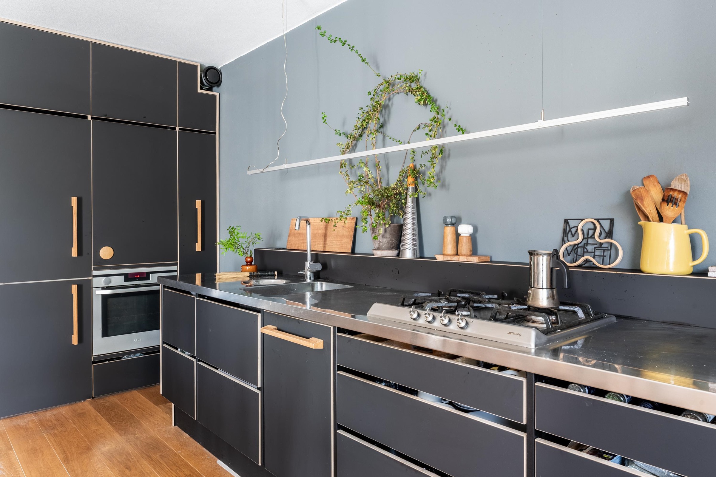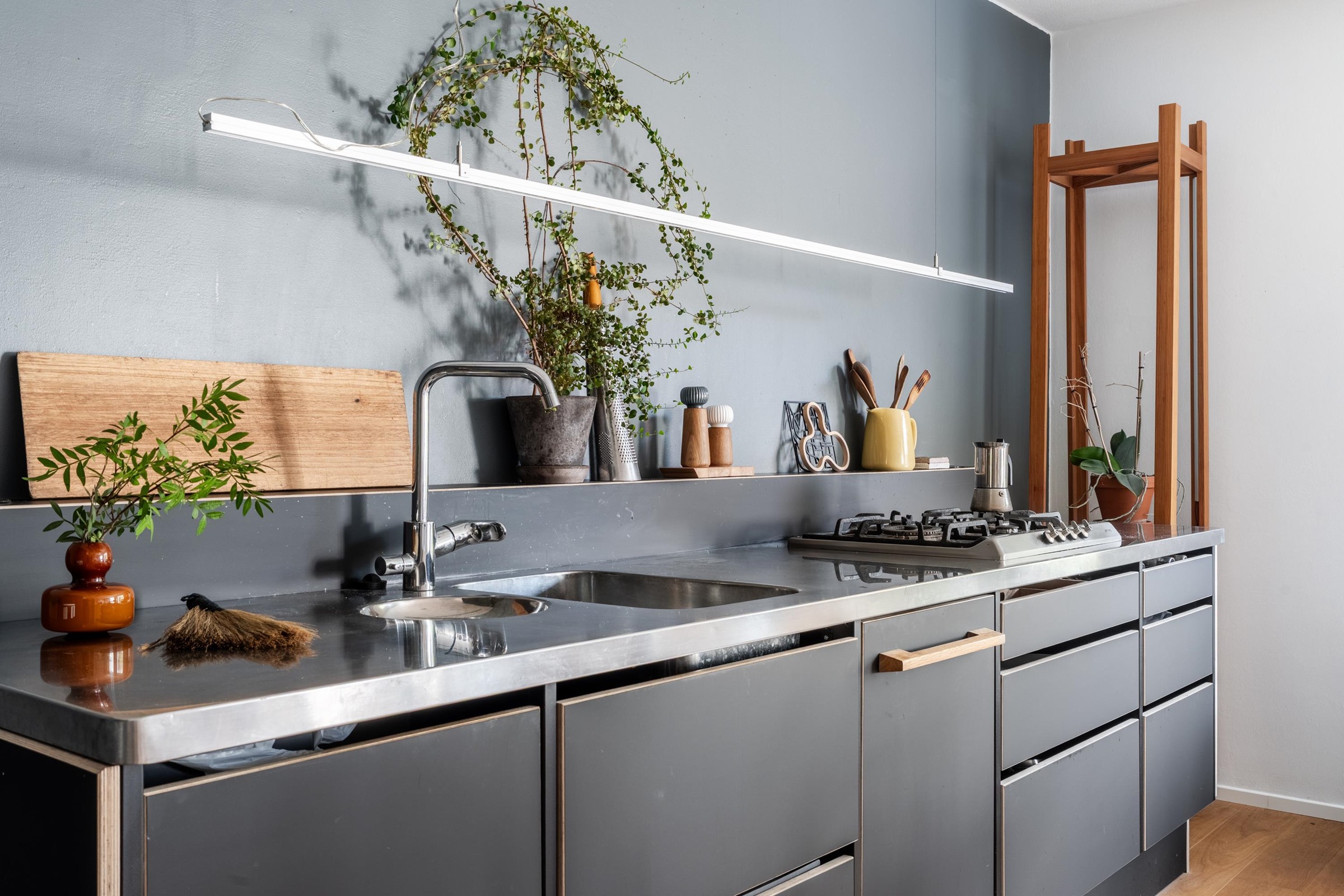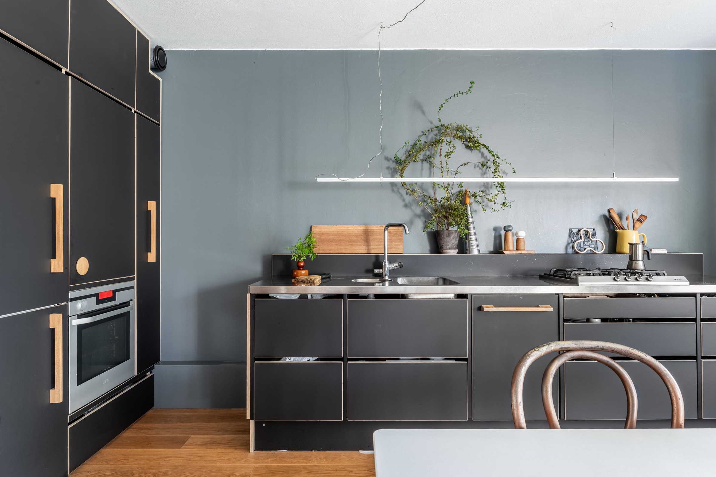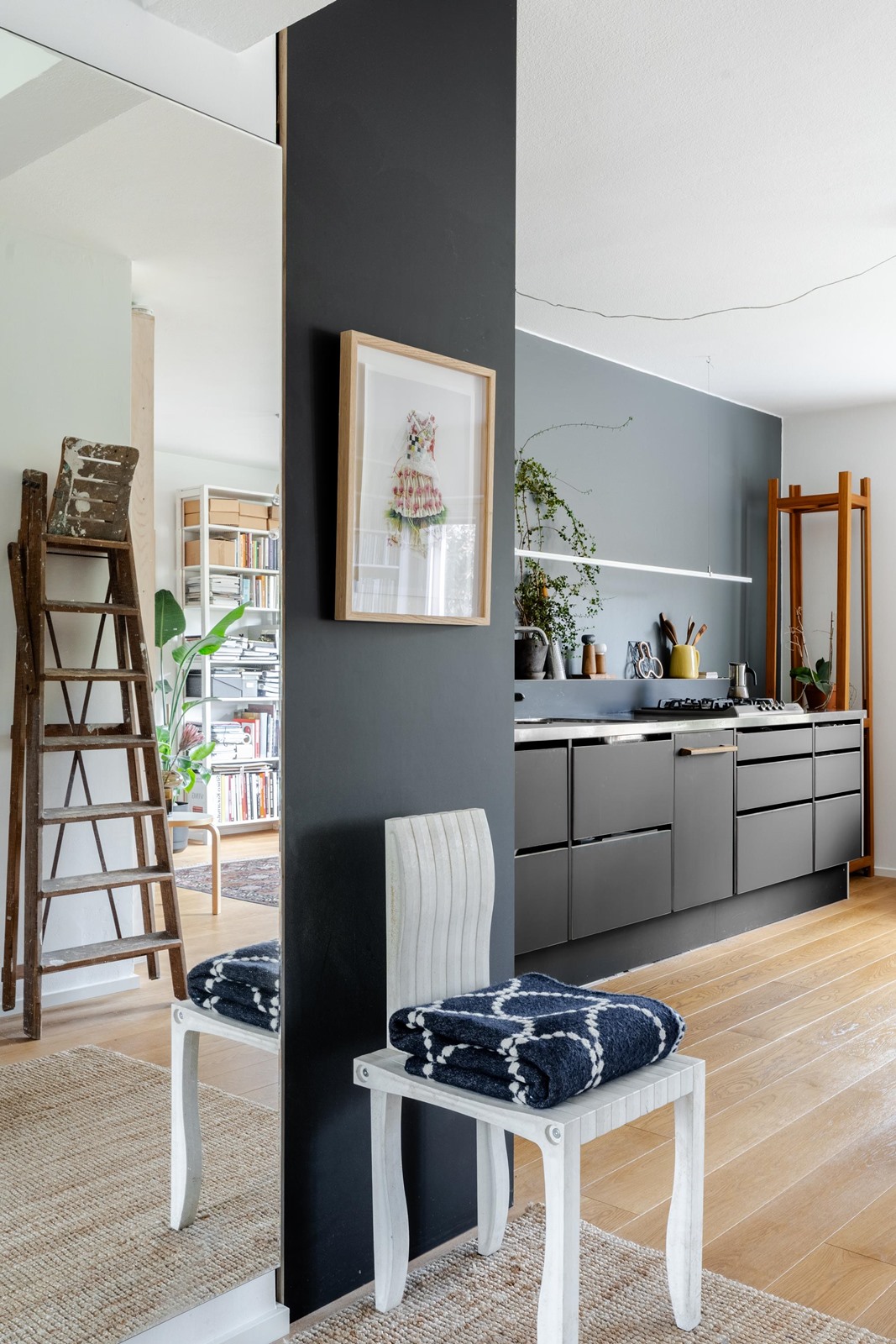 Keittiö on siirretty olohuoneen yhteyteen, mikä tekee kodista yhtenäisen ja valoisan. Ratkaisu antaa valon virrata esteettä läpi huoneiston, ja itse keittiö on kuin sisustuksellinen teos - kaunis, elegantti ja käytännöllinen. Se liittyy saumattomasti oleskelutilaan, muodostaen kodin sydämen, jossa viihtyy helposti niin arjessa kuin juhlassa.