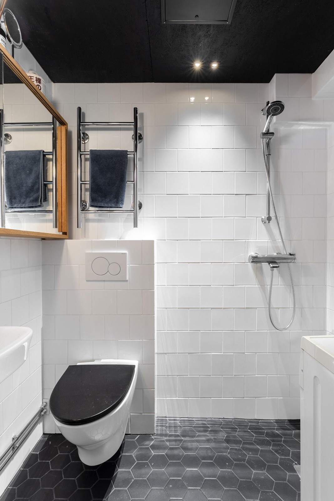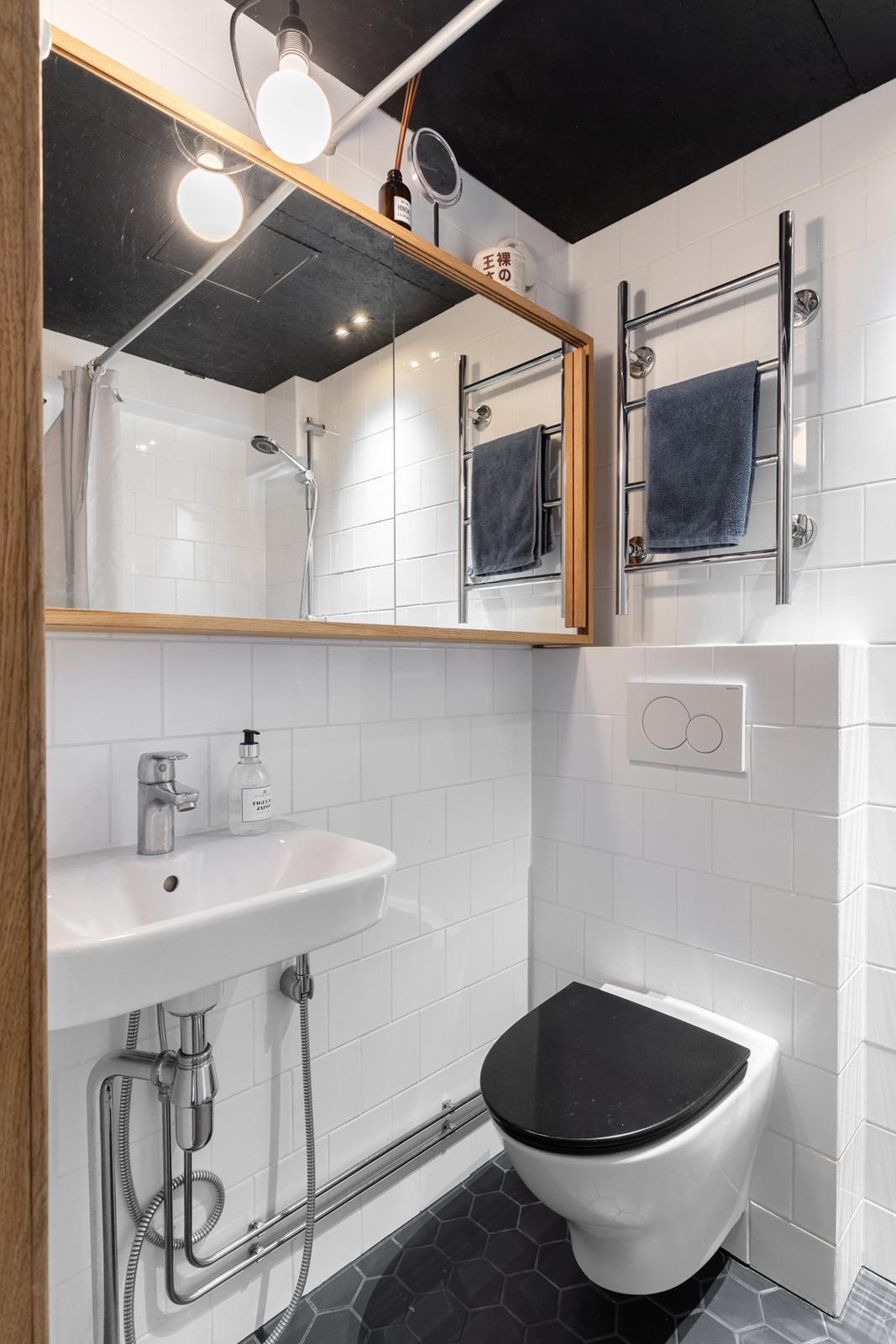 - Kylpyhuone, suihku, peilikaappi, pesukoneliitäntä, sähköinen lattialämmitys, kiinteät valaisimet.