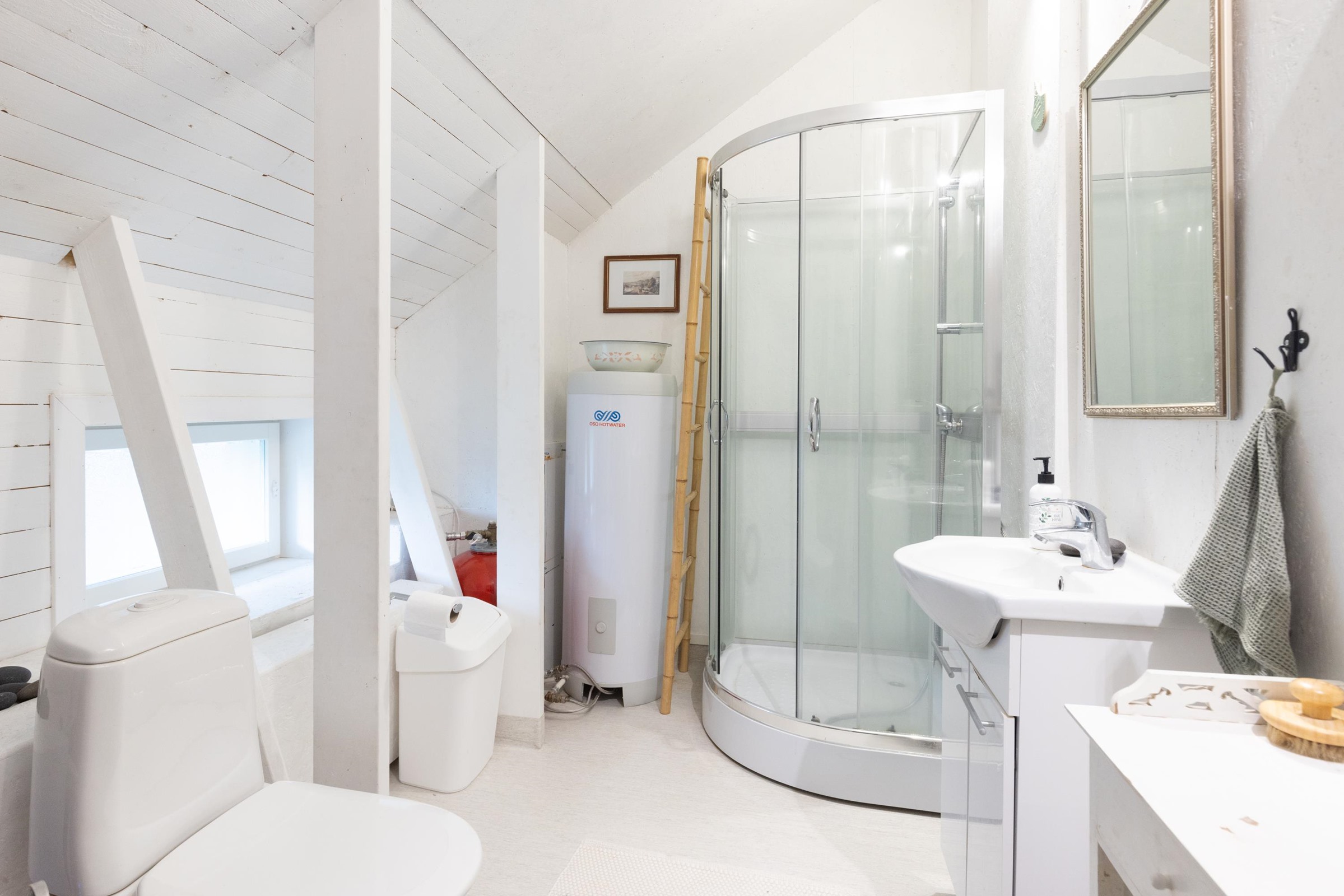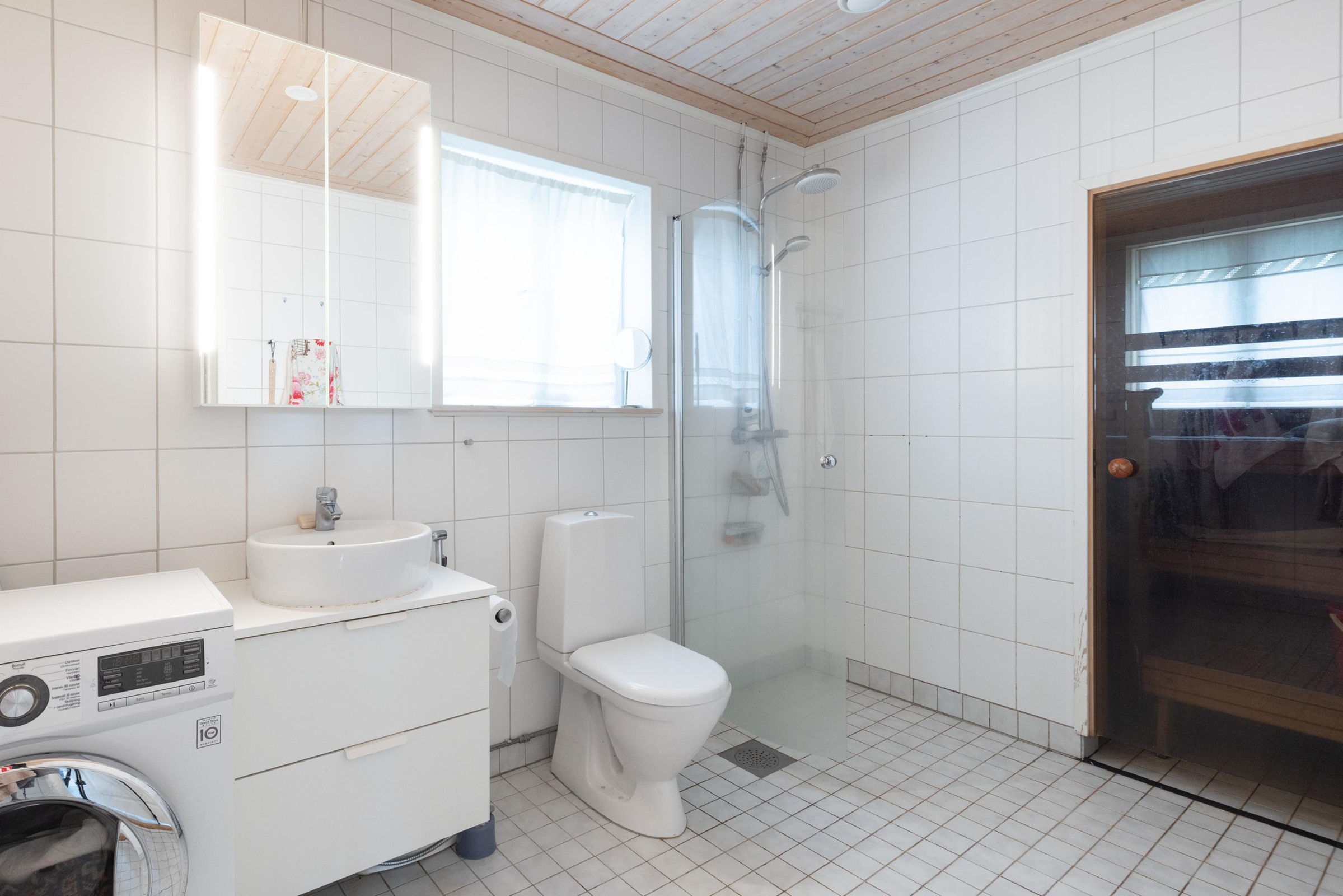 - Sähkökiuas uusittu 2025, kylpyhuone alakerassa, erillinen wc yläkerran teknisessä tilassa, suihku alakerran kph, suihkukaappi yläkerrassa, suihkuseinä alakerran kph, amme tassuamme (nyt pihalla), peilit, peilikaappi alakerran kph, allaskaappi molemmissa, pesukoneliitäntä alakerran kph, lattialämmitys vesikiertoinen, kiinteät valaisimet. Metalliset hyllyt alakerran kph. Huonot vesikaadot. Lastalla kuivaus käytön jälkeen. Kylpyhuoneessa yksi laatta rikki.