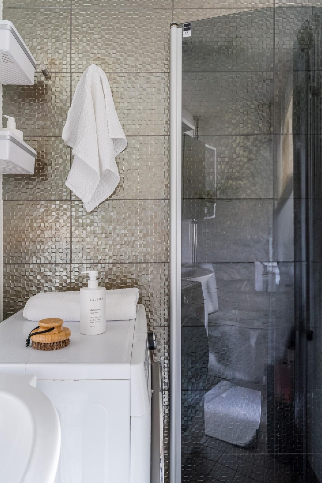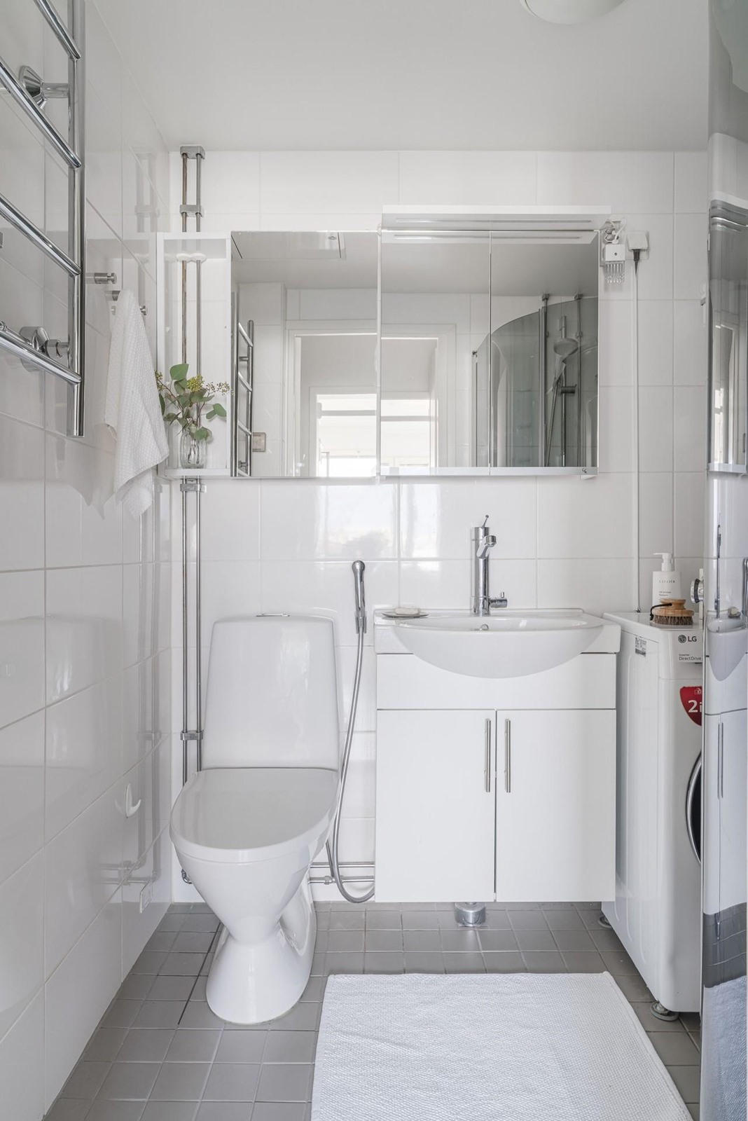 - Kylpyhuone, suihku, suihkuseinä 2 kpl, peilikaappi, allaskaappi, pesukoneliitäntä, lattialämmitys, kiinteät valaisimet. Pyyhepatteri