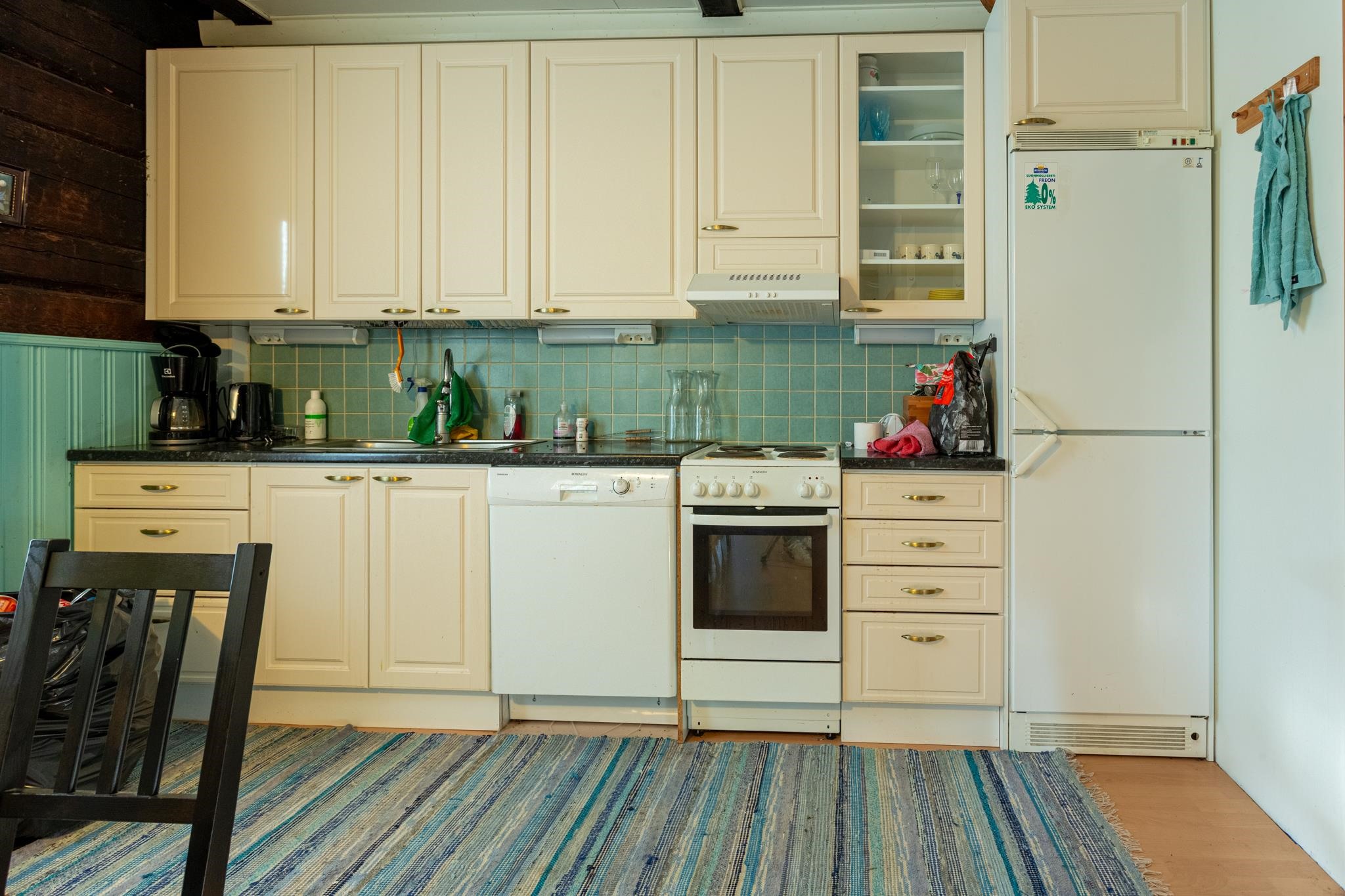 - Jääkaappi, jääkaappipakastin, sähköliesi, mikroaaltouuni, astianpesukone, irralliset kaapistot, pöytätasojen materiaali Laminaatti.