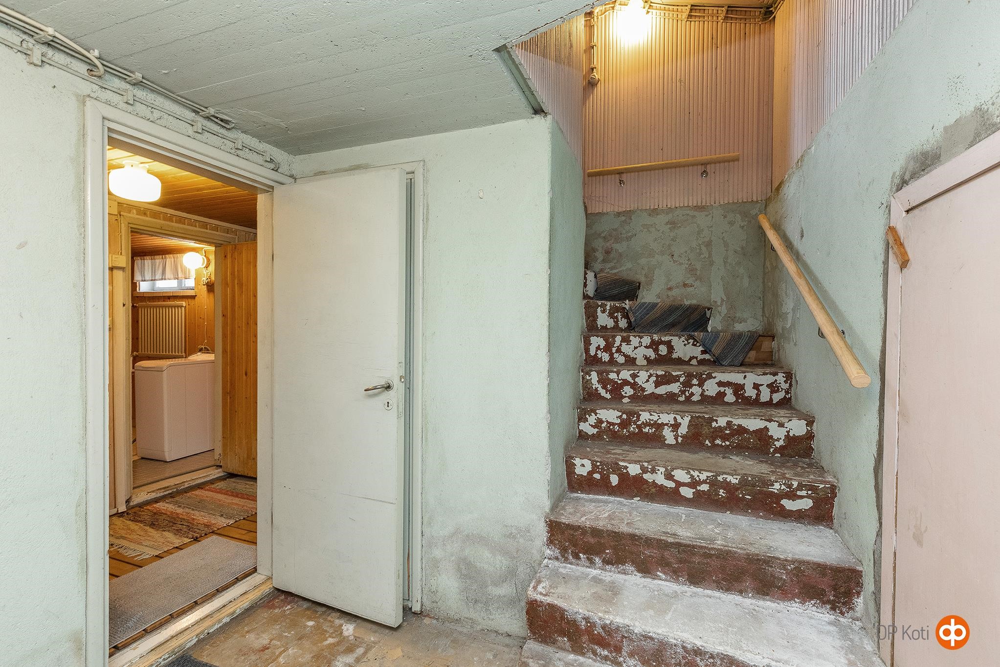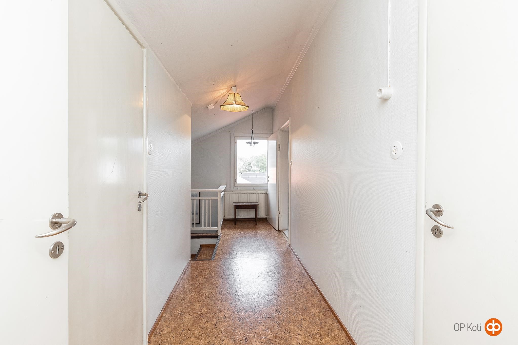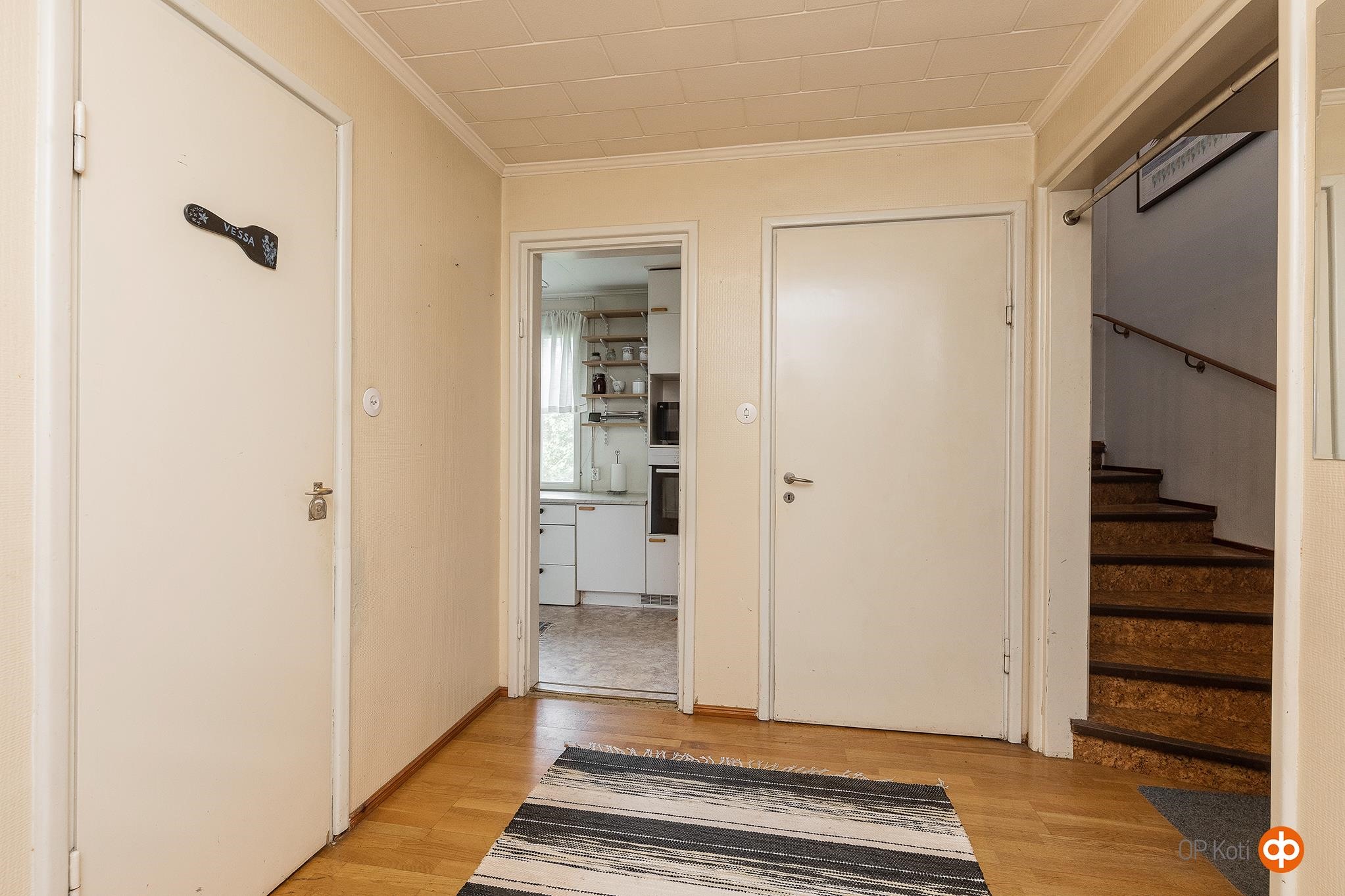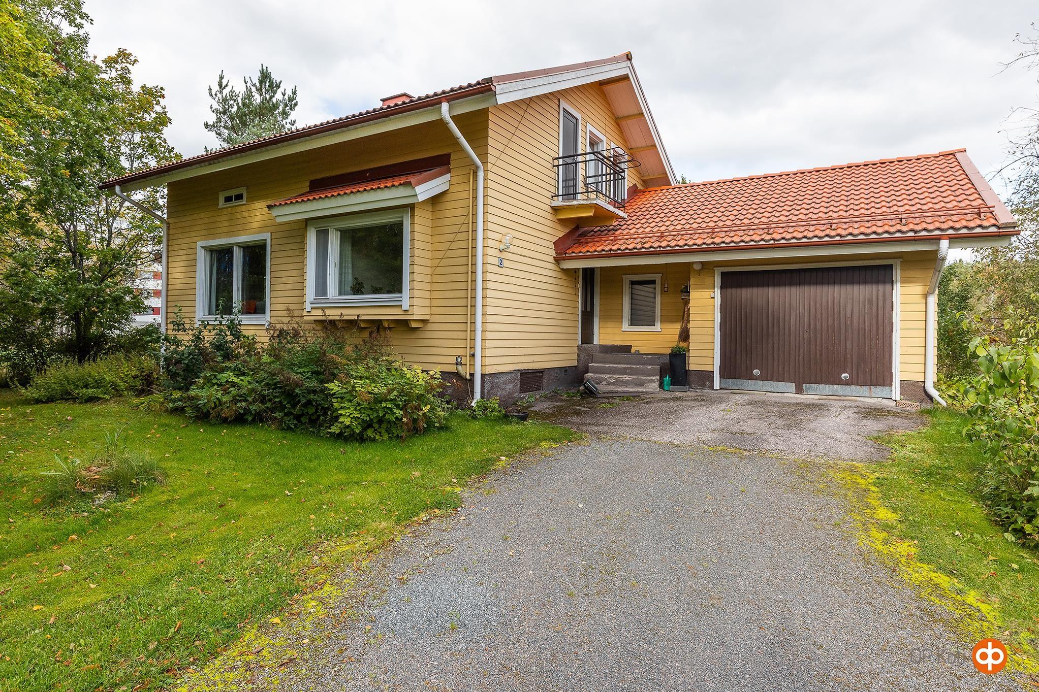 Omakotitalon asuintilat kolmessa kerroksessa. Sisääntulokerroksessa eteisaulan yhteydessä oleva pieni kylpyhuone wc-istuimella, reilunkokoinen olohuone valoisalla erkkeritilalla ja varaavalla takalla. Keskikerroksessa lisäksi keittiö ja olohuoneen yhteydessä oleva ruokailuhuone sekä yksi talon kolmesta makuuhuoneesta. Yläkerrasta löytyvät kaksi makuuhuonetta, josta toisesta käynti pienelle tuuletusparvekkeelle. Yläkerran makuuhuoneiden välissä tilava vaatehuone, joka tarvittaessa muutettavissa esim. pesu-/wc-tilaksi. Kellarikerroksesta runsaasti varastotilaa, tekninen tila sekä pukuhuone, kylpyhuone ja puukiukaalla varustettu sauna. Keskikerroksesta uloskäynti takapihan viihtyisälle piha-alueelle. Talon yhteydessä tilavahkot autotalli ja varasto.
