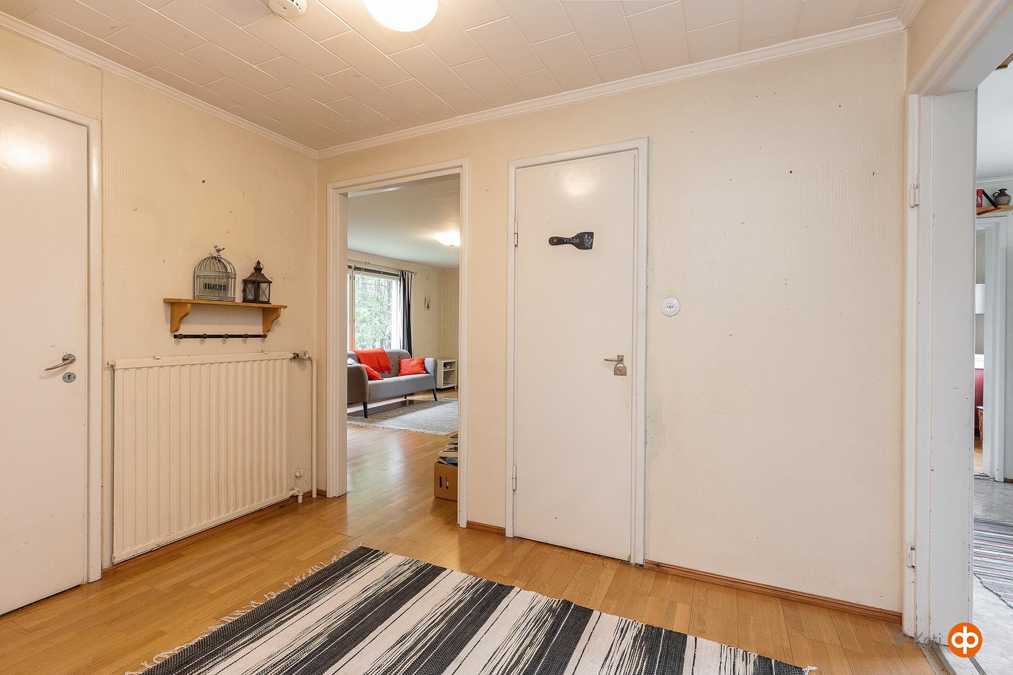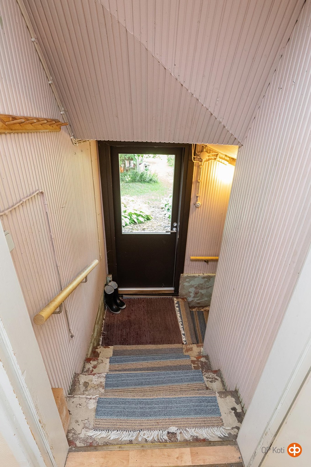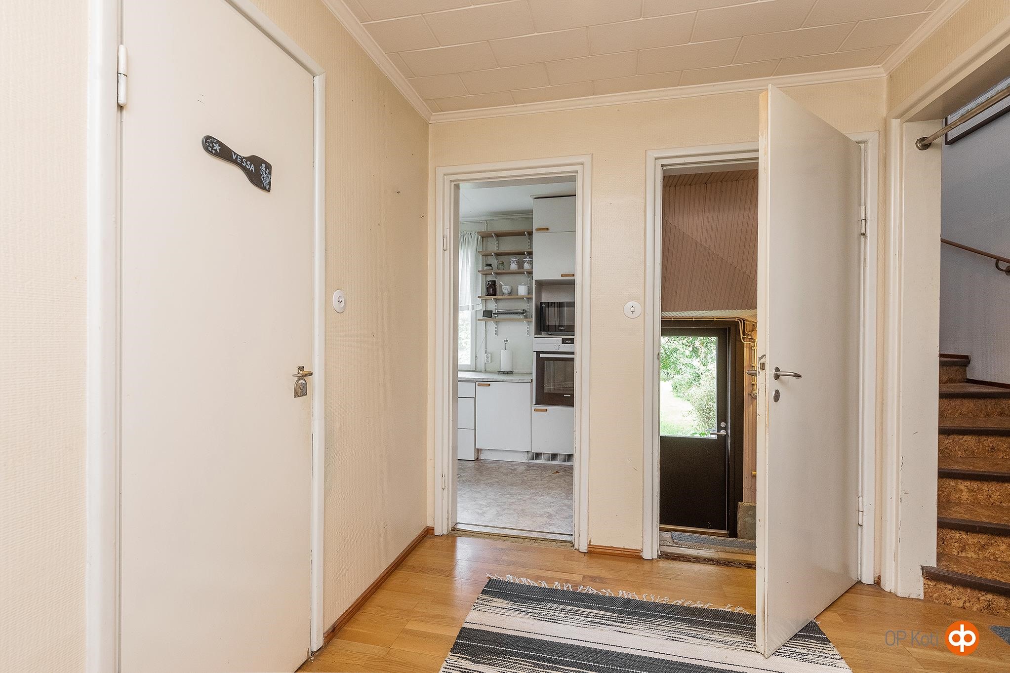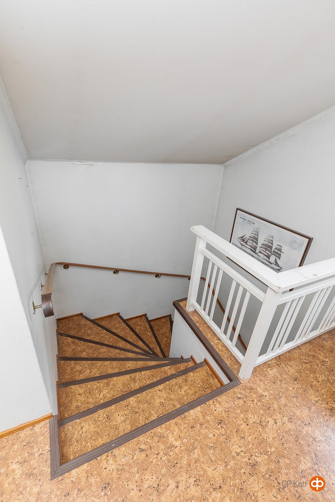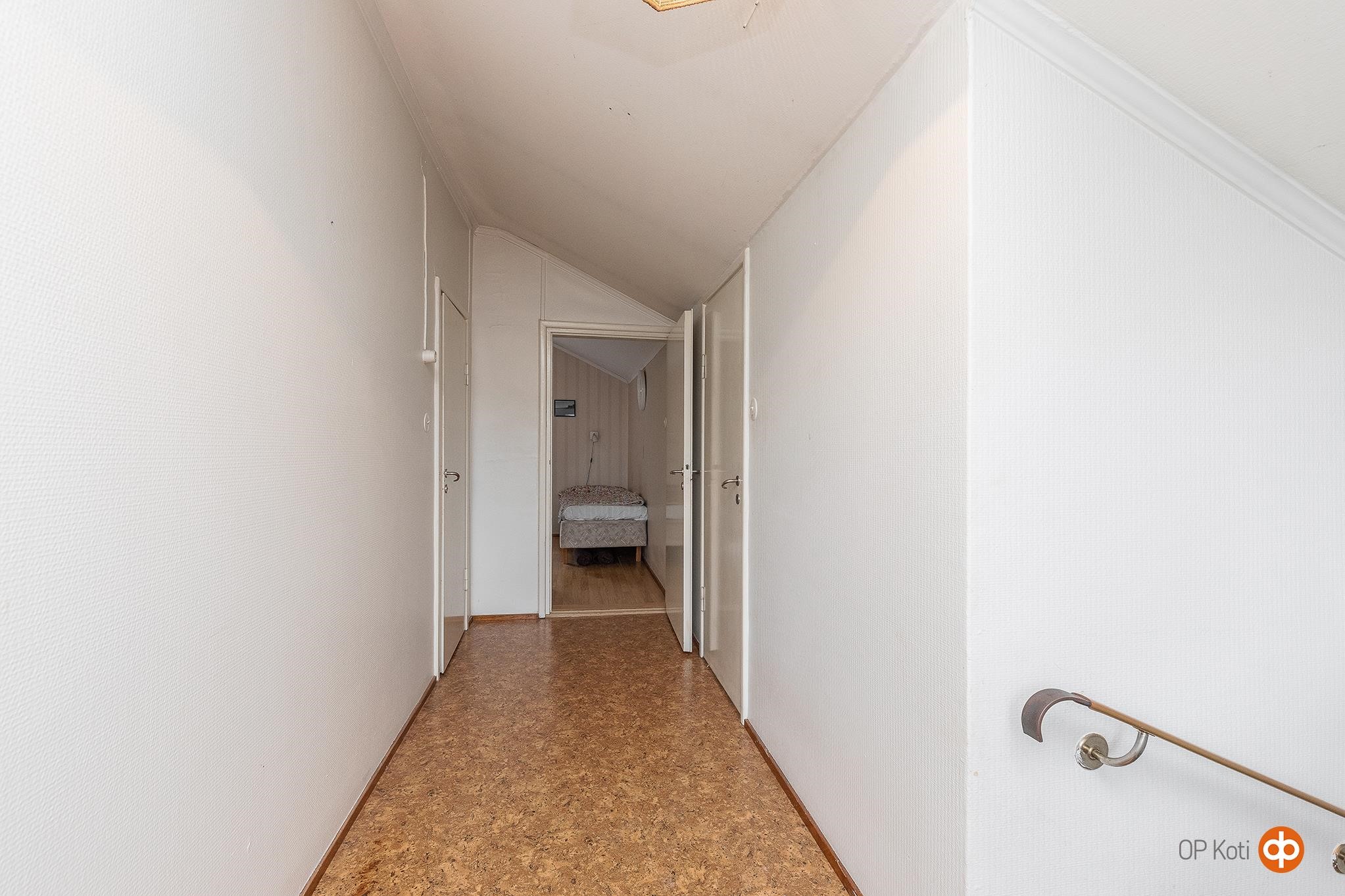Omakotitalon asuintilat kolmessa kerroksessa. Sisääntulokerroksessa eteisaulan yhteydessä oleva pieni kylpyhuone wc-istuimella, reilunkokoinen olohuone valoisalla erkkeritilalla ja varaavalla takalla. Keskikerroksessa lisäksi keittiö ja olohuoneen yhteydessä oleva ruokailuhuone sekä yksi talon kolmesta makuuhuoneesta. Yläkerrasta löytyvät kaksi makuuhuonetta, josta toisesta käynti pienelle tuuletusparvekkeelle. Yläkerran makuuhuoneiden välissä tilava vaatehuone, joka tarvittaessa muutettavissa esim. pesu-/wc-tilaksi. Kellarikerroksesta runsaasti varastotilaa, tekninen tila sekä pukuhuone, kylpyhuone ja puukiukaalla varustettu sauna. Keskikerroksesta uloskäynti takapihan viihtyisälle piha-alueelle. Talon yhteydessä tilavahkot autotalli ja varasto.