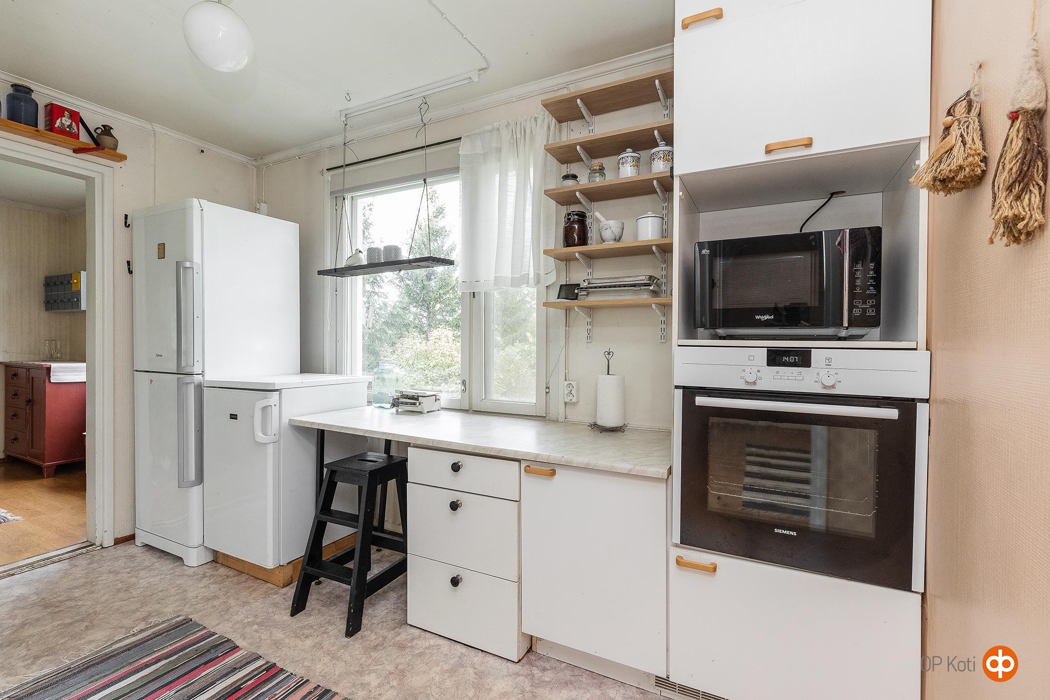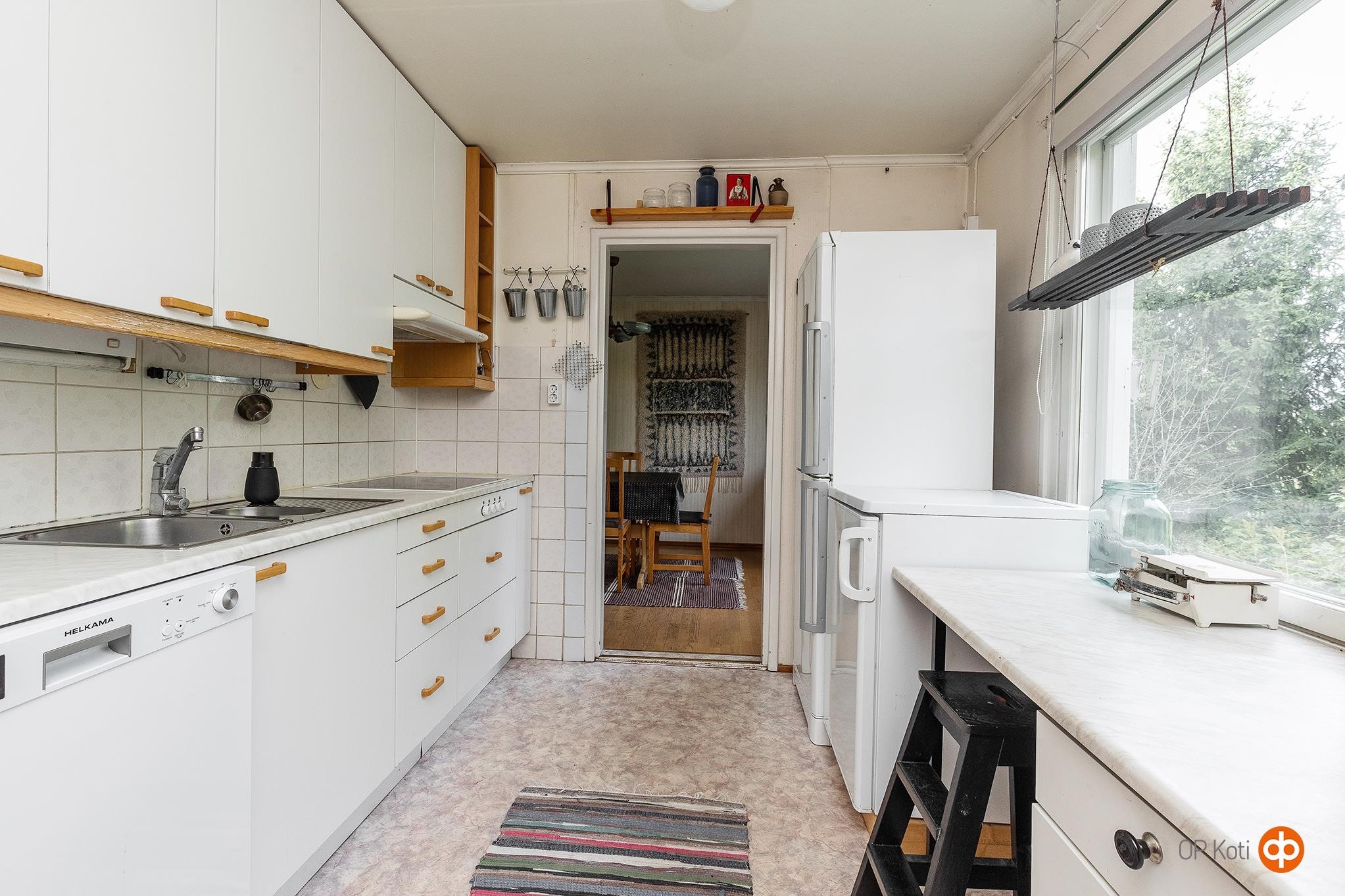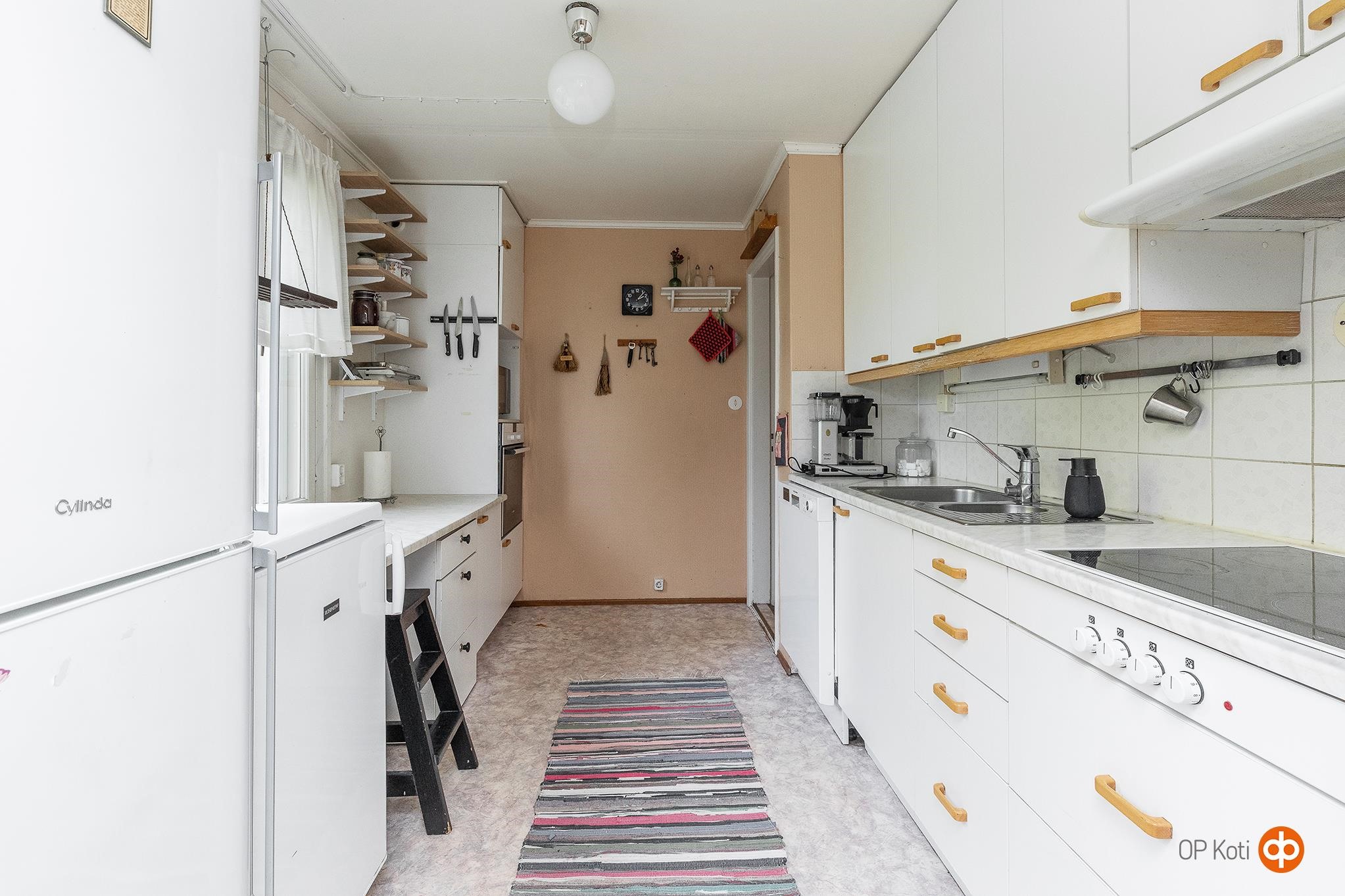 - Jääkaappi, pakastekaappi, erillisuuni kiertoilma, liesitaso keraaminen, liesituuletin, astianpesukone, kaapistot, kiinteät valaisimet. Keittiökokonaisuus muodostuu ikkunallisesta työskentelytilasta kaapistoineen, työtasoineen ja kodinkoneineen sekä olohuoneen yhteydessä olevasta valoisasta ruokailuhuoneesta. Vaalea 90-luvulla uusittu keittiö.