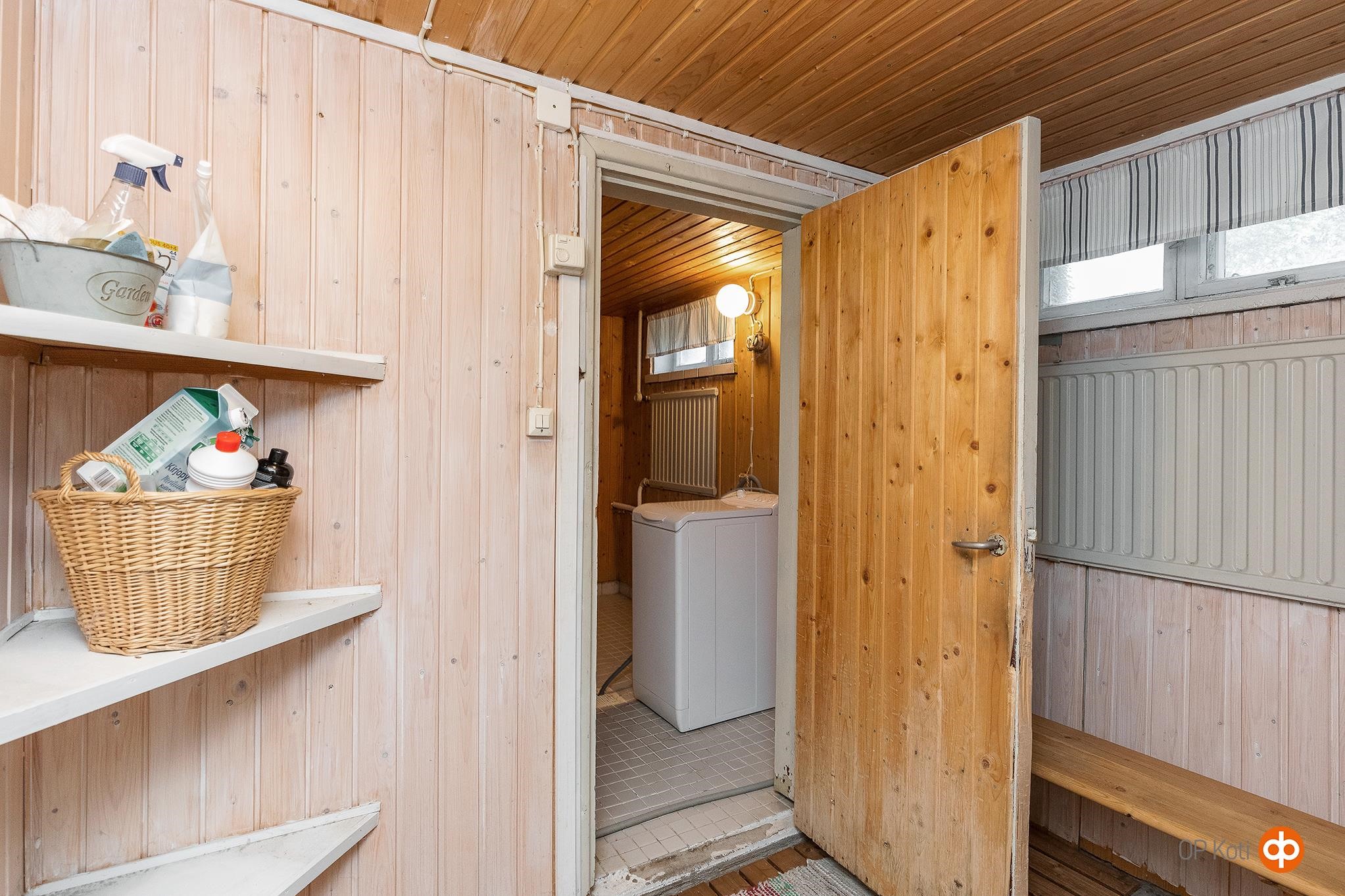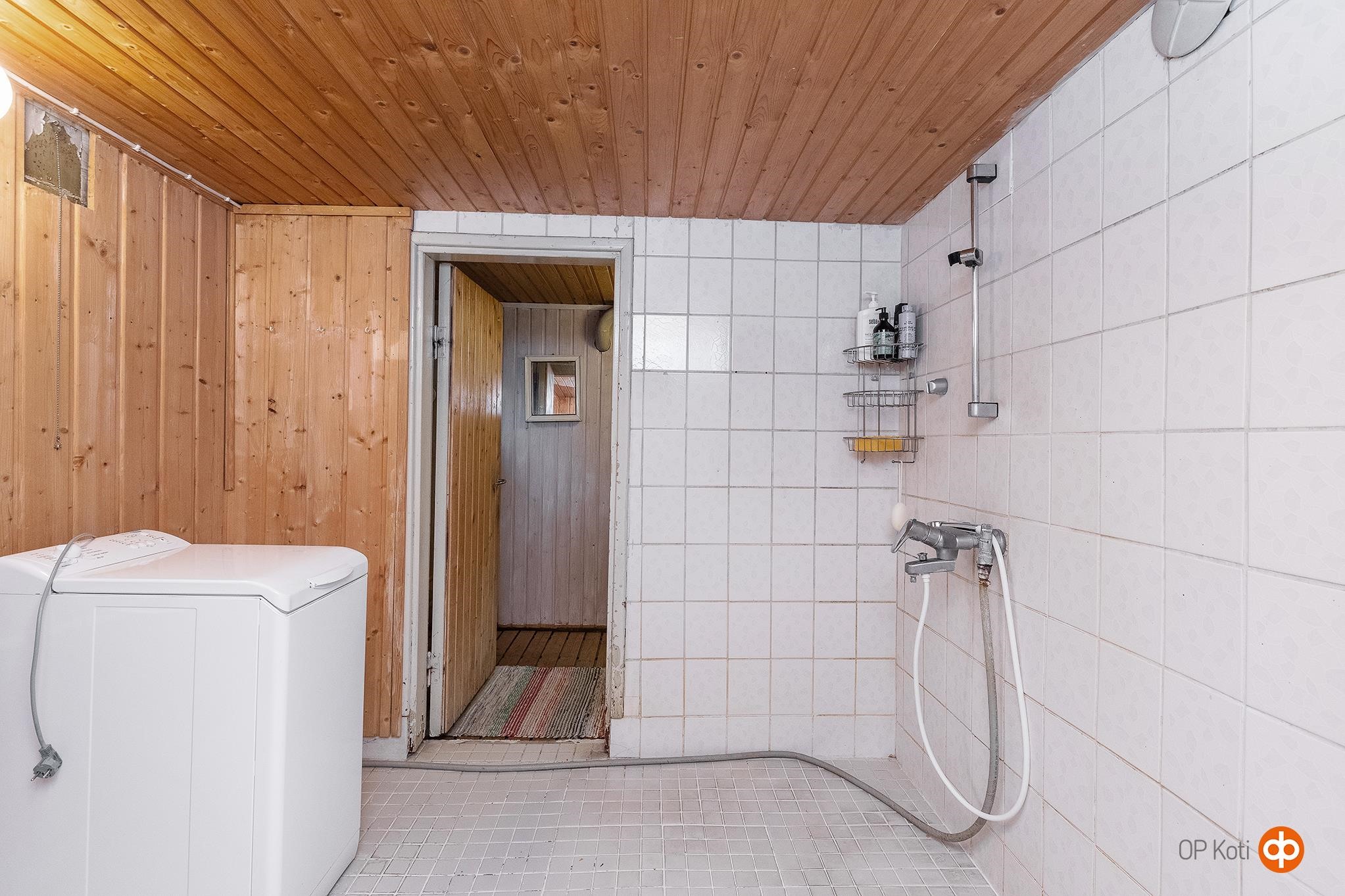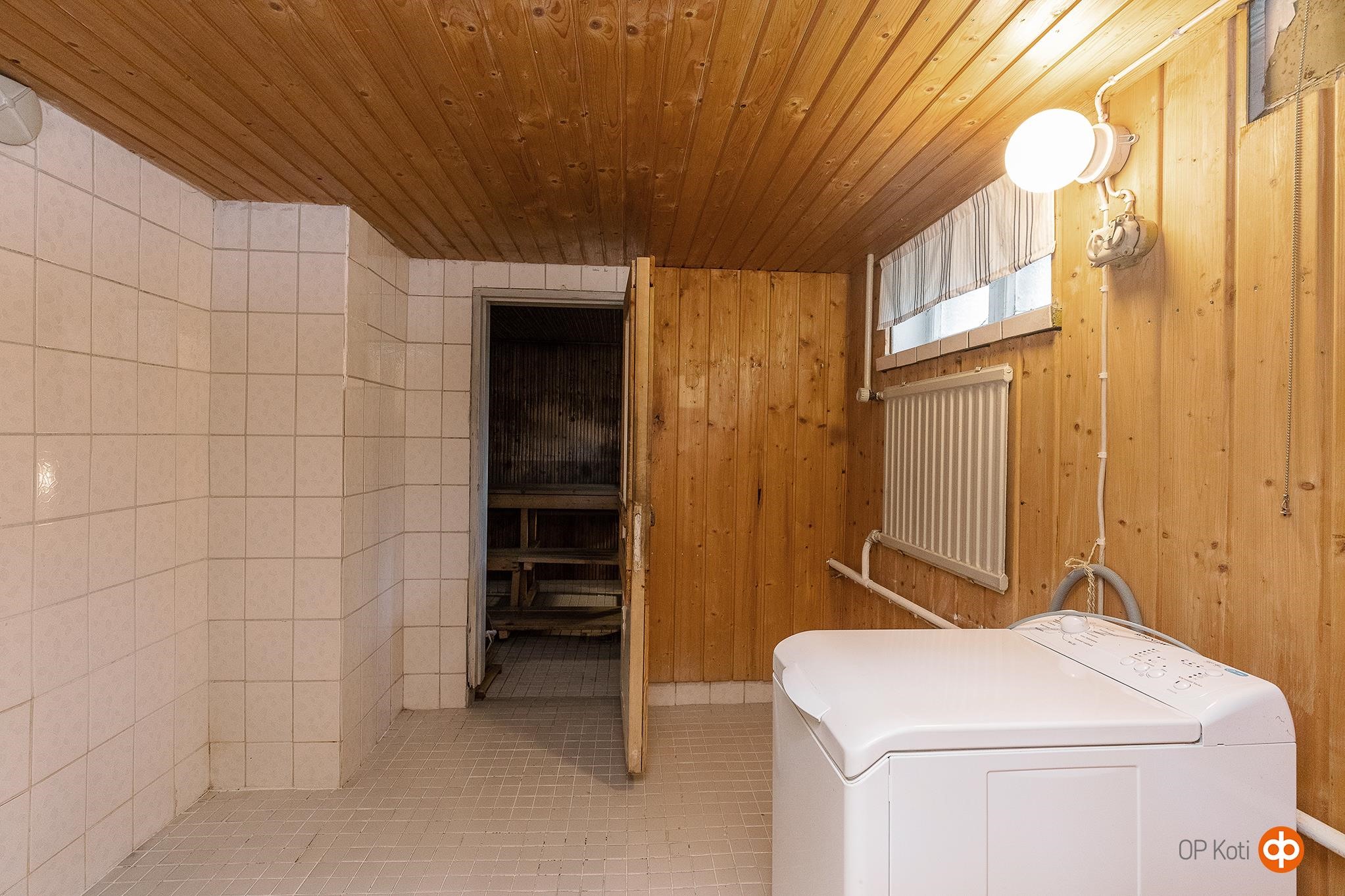 - Sauna, puukiuas, kylpyhuone, erillinen wc, suihku keskikerroksen wc ja alaker. kylpyhuone, peilit keskikerroksen wc/kph, pesukoneliitäntä alakerran kylpyhuoneessa, lattialämmitys alakerran kylpyhuoneessa, kiinteät valaisimet. Sisääntulokerroksen aulatilan yhteydessä pieni kylpyhuone wc-istuimella. Kellarikerroksessa pukuhuone ja tilavat kylpyhuone sekä sauna. Saunassa puukiuas. Yläkerran makuuhuoneiden välissä reilunkokoinen vaatehuone, joka tarvittaessa muutettavissa pesu-/wc-tilaksi (vaatii rakennusluvan).
