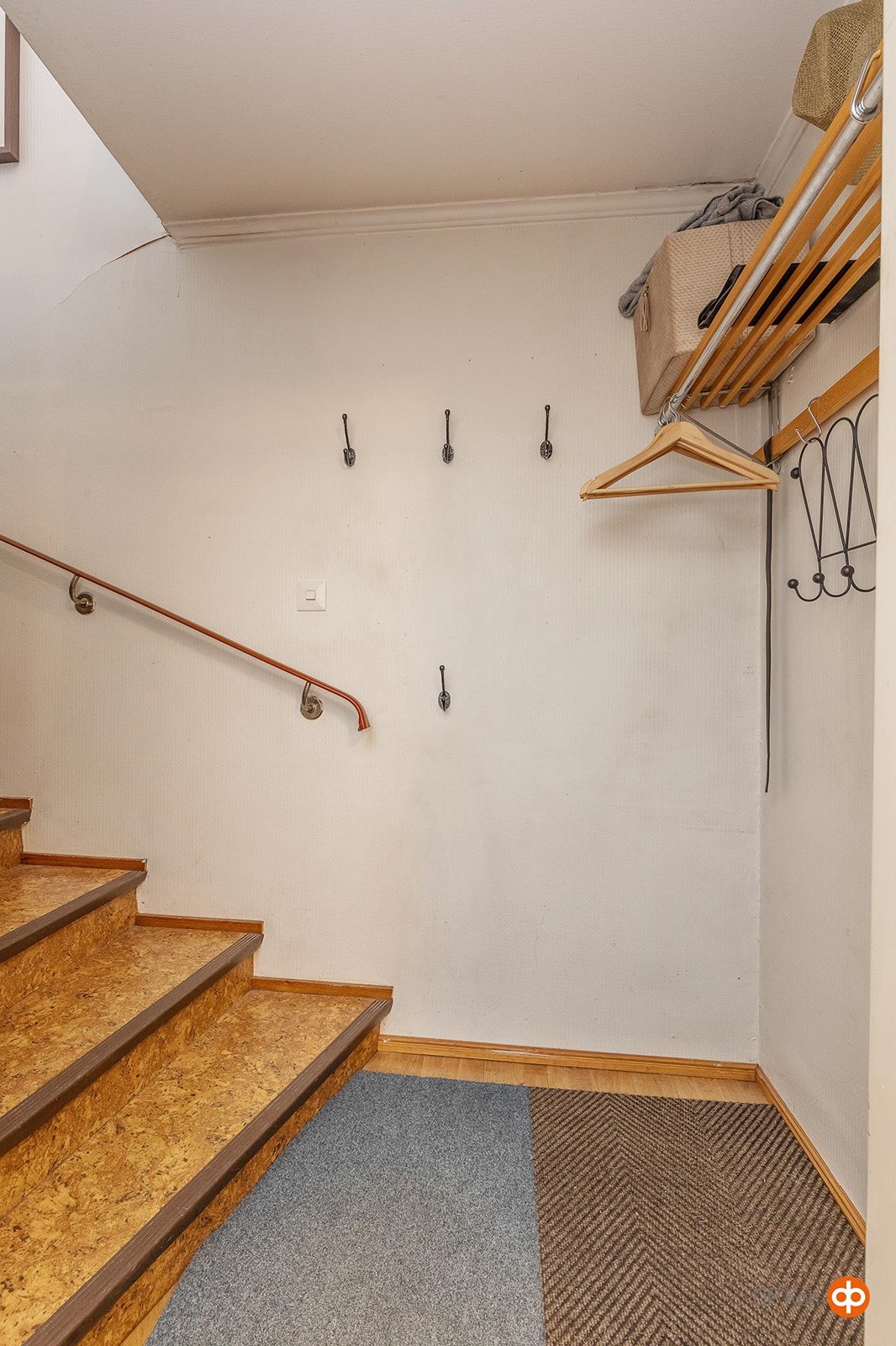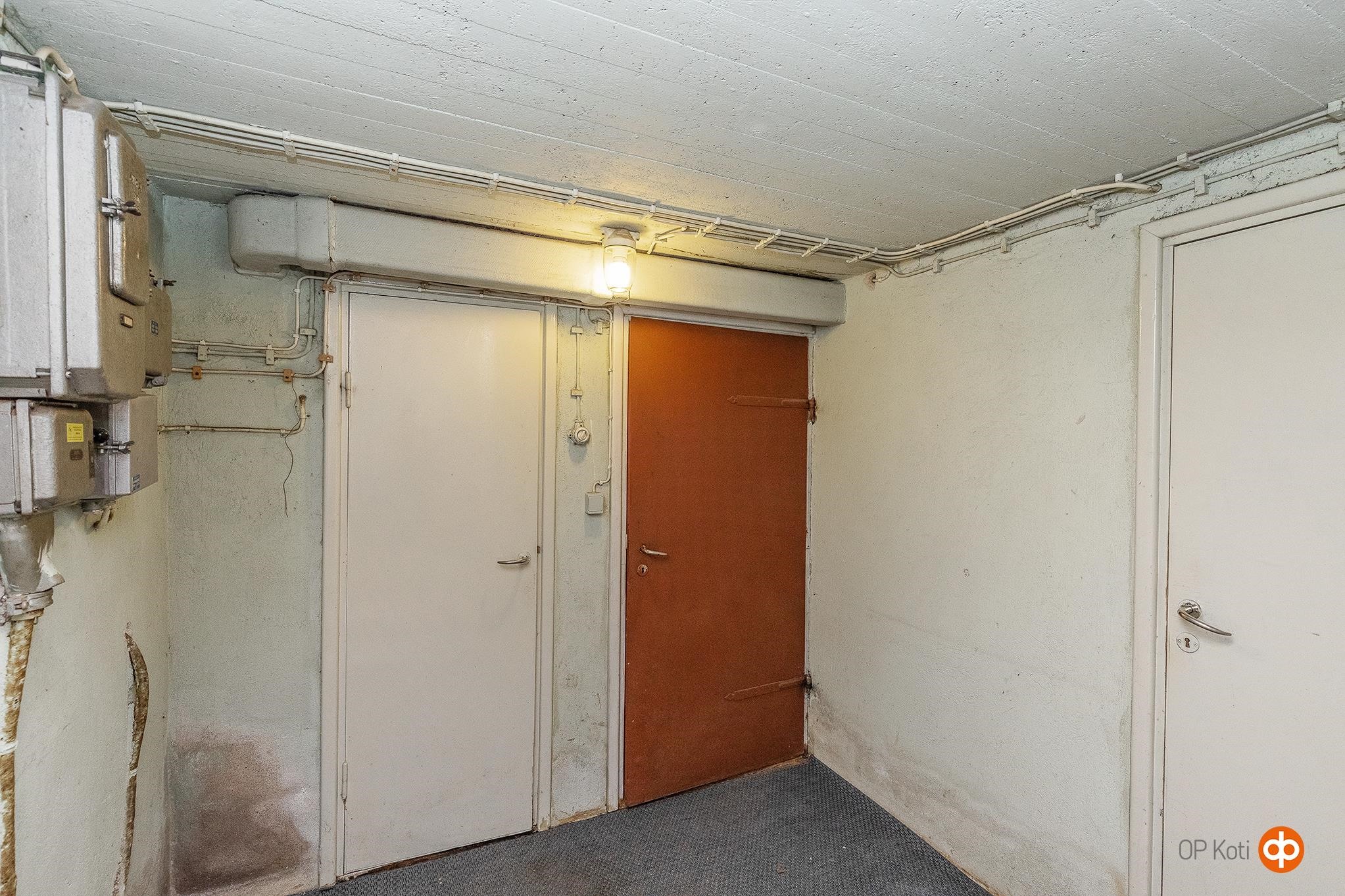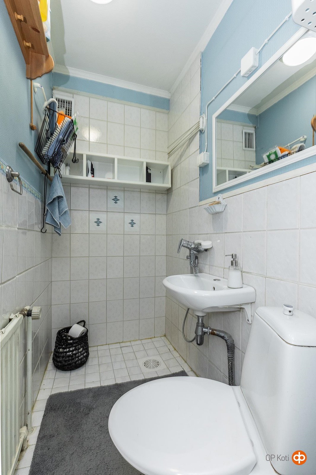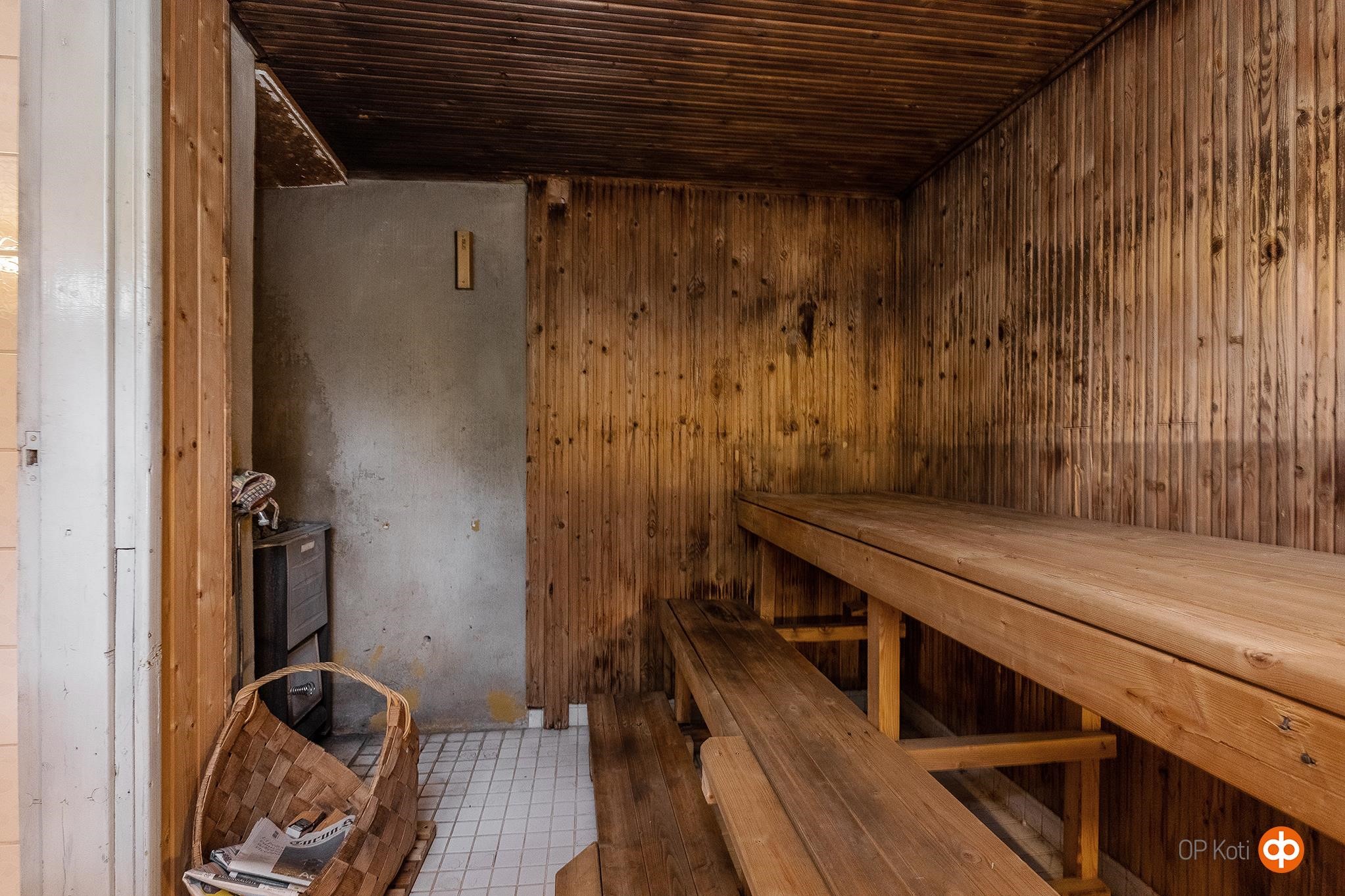 - Sauna, puukiuas, kylpyhuone, erillinen wc, suihku keskikerroksen wc ja alaker. kylpyhuone, peilit keskikerroksen wc/kph, pesukoneliitäntä alakerran kylpyhuoneessa, lattialämmitys alakerran kylpyhuoneessa, kiinteät valaisimet. Sisääntulokerroksen aulatilan yhteydessä pieni kylpyhuone wc-istuimella. Kellarikerroksessa pukuhuone ja tilavat kylpyhuone sekä sauna. Saunassa puukiuas. Yläkerran makuuhuoneiden välissä reilunkokoinen vaatehuone, joka tarvittaessa muutettavissa pesu-/wc-tilaksi (vaatii rakennusluvan).