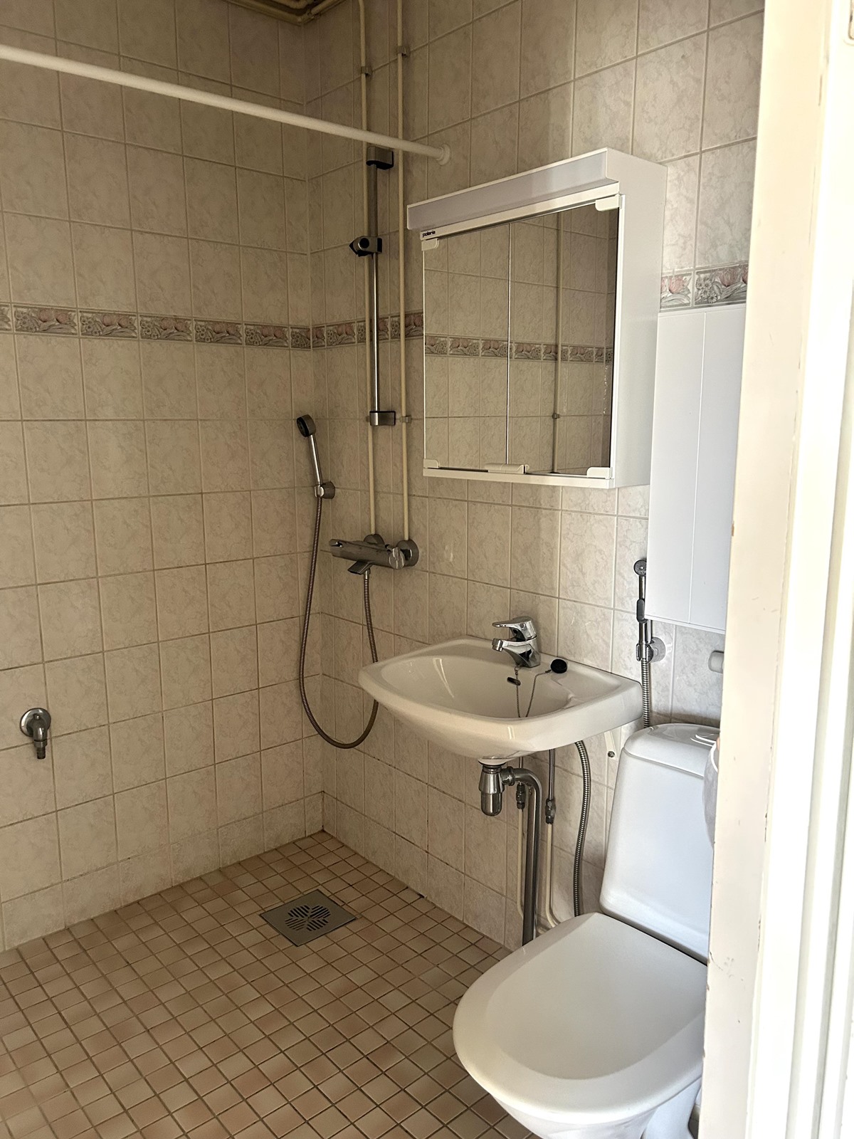 - Kylpyhuone, suihku, peilikaappi, pesukoneliitäntä mahtuu täysikokoinen pyykinpesukone, suihkuverhonkisko.