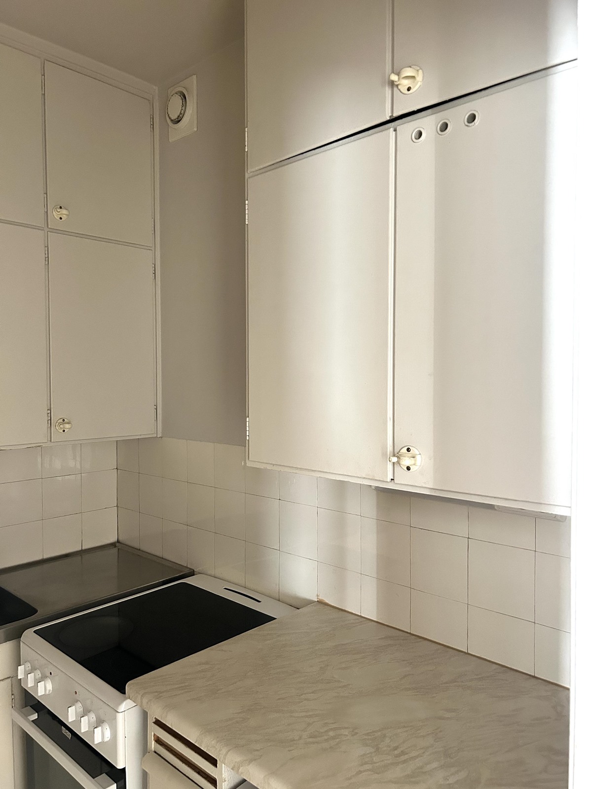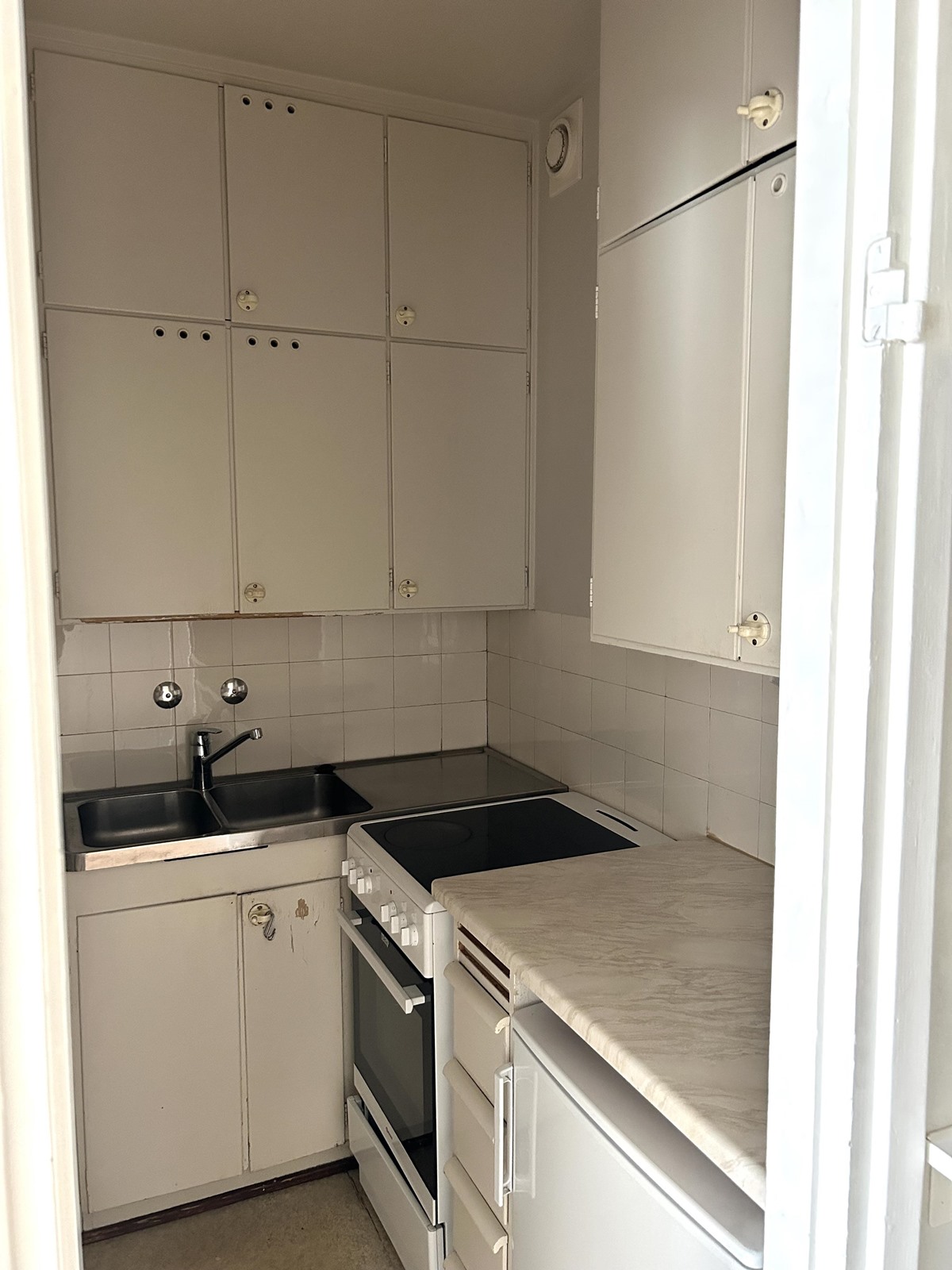 - Jääkaappi pakastelokerolla, keraaminen liesi, kaapistot, kiinteät valaisimet.