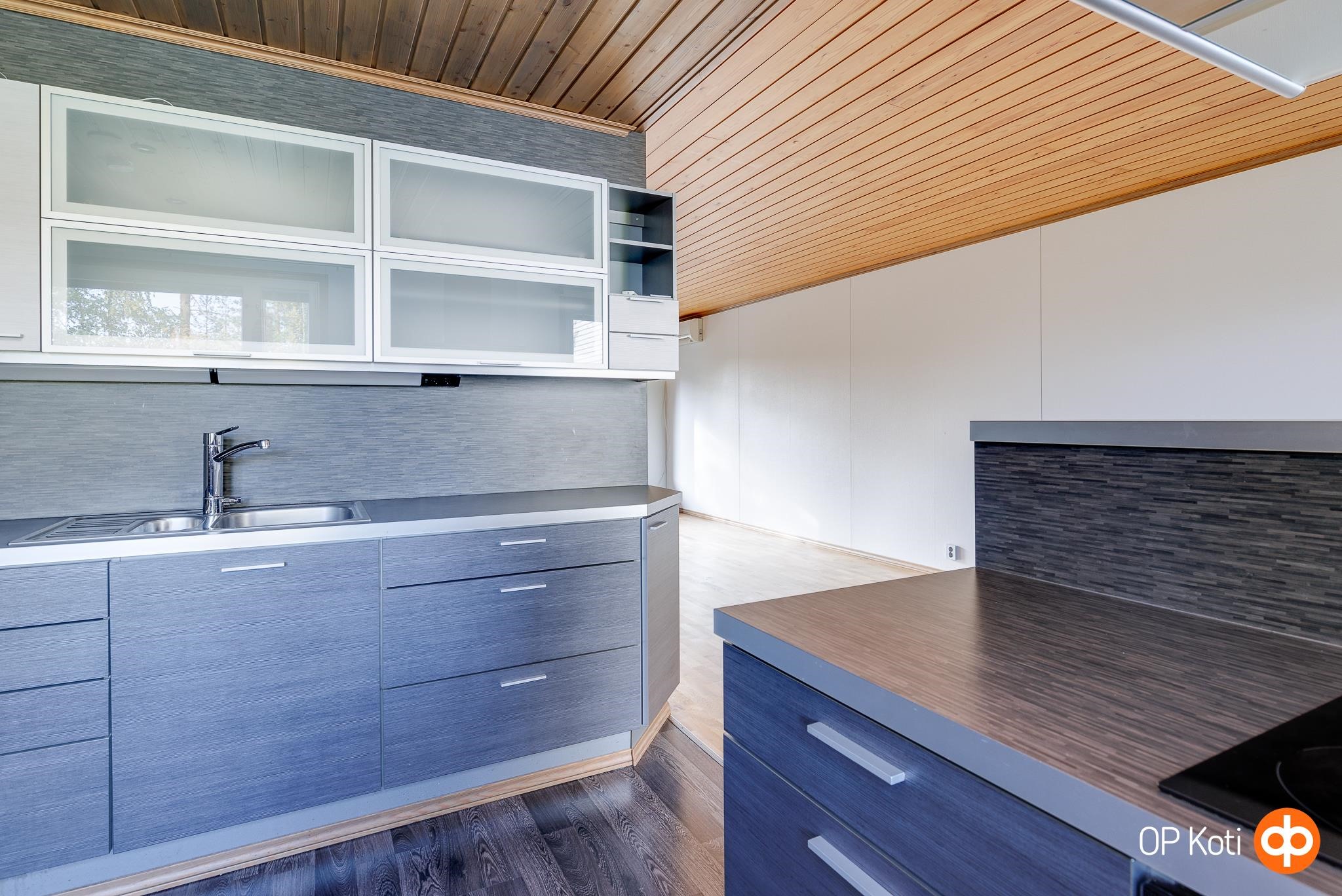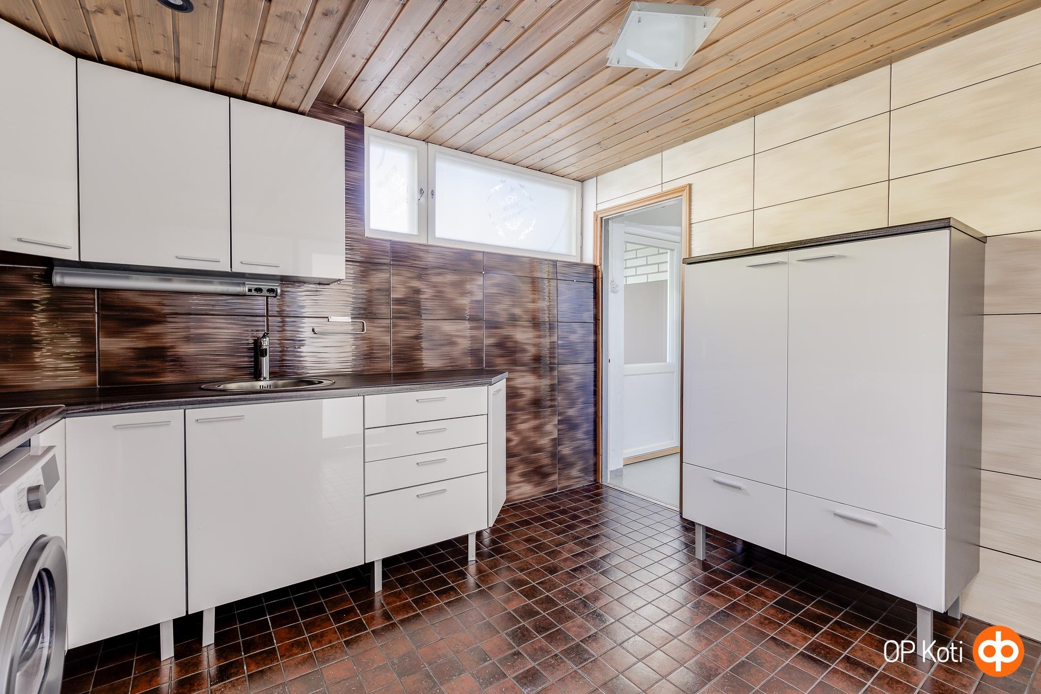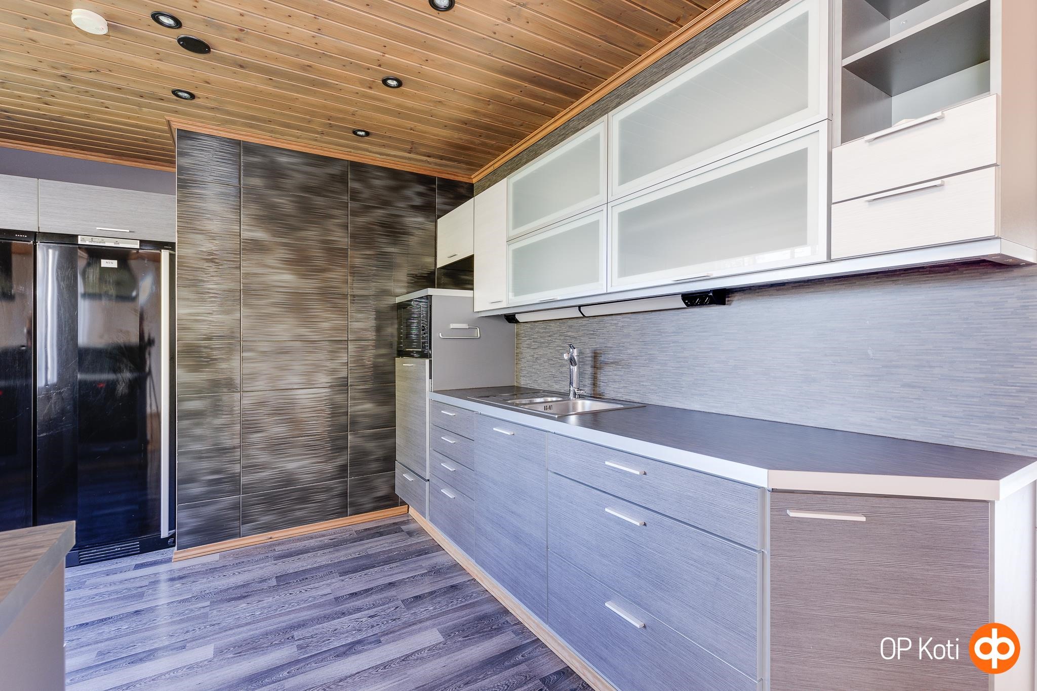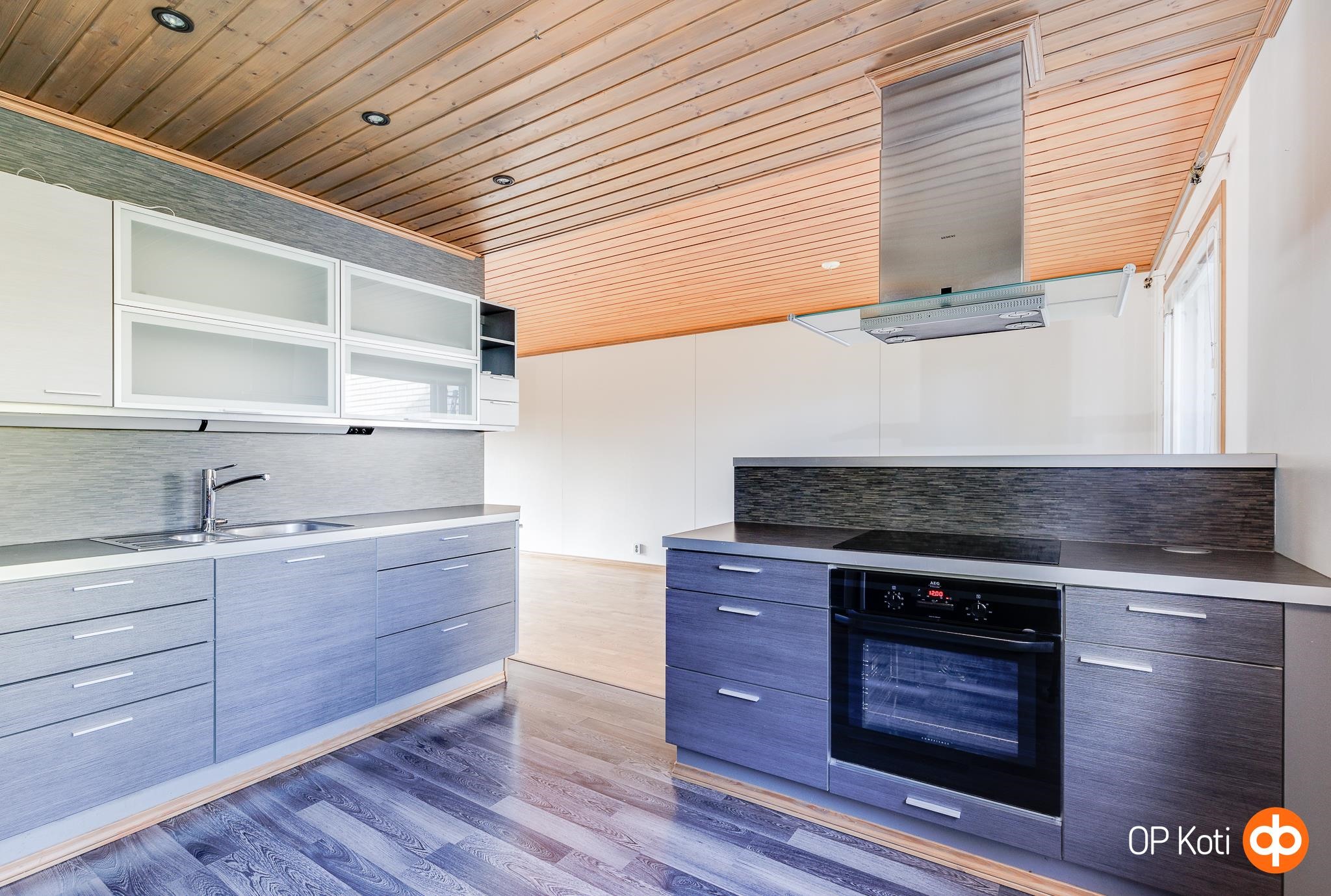 - Jääkaappi, pakastekaappi, erillisuuni, induktioliesi, liesikupu, liesituuletin, mikroaaltouuni, astianpesukone, kaapistot, kiinteät valaisimet.
