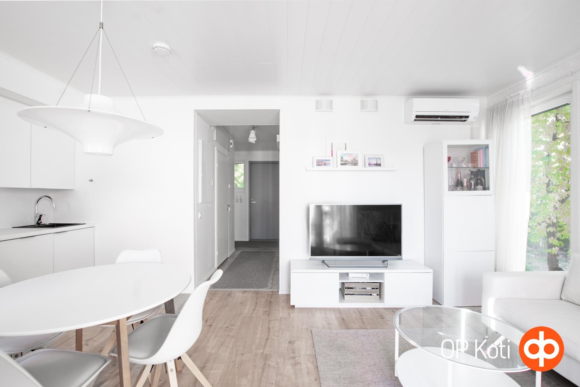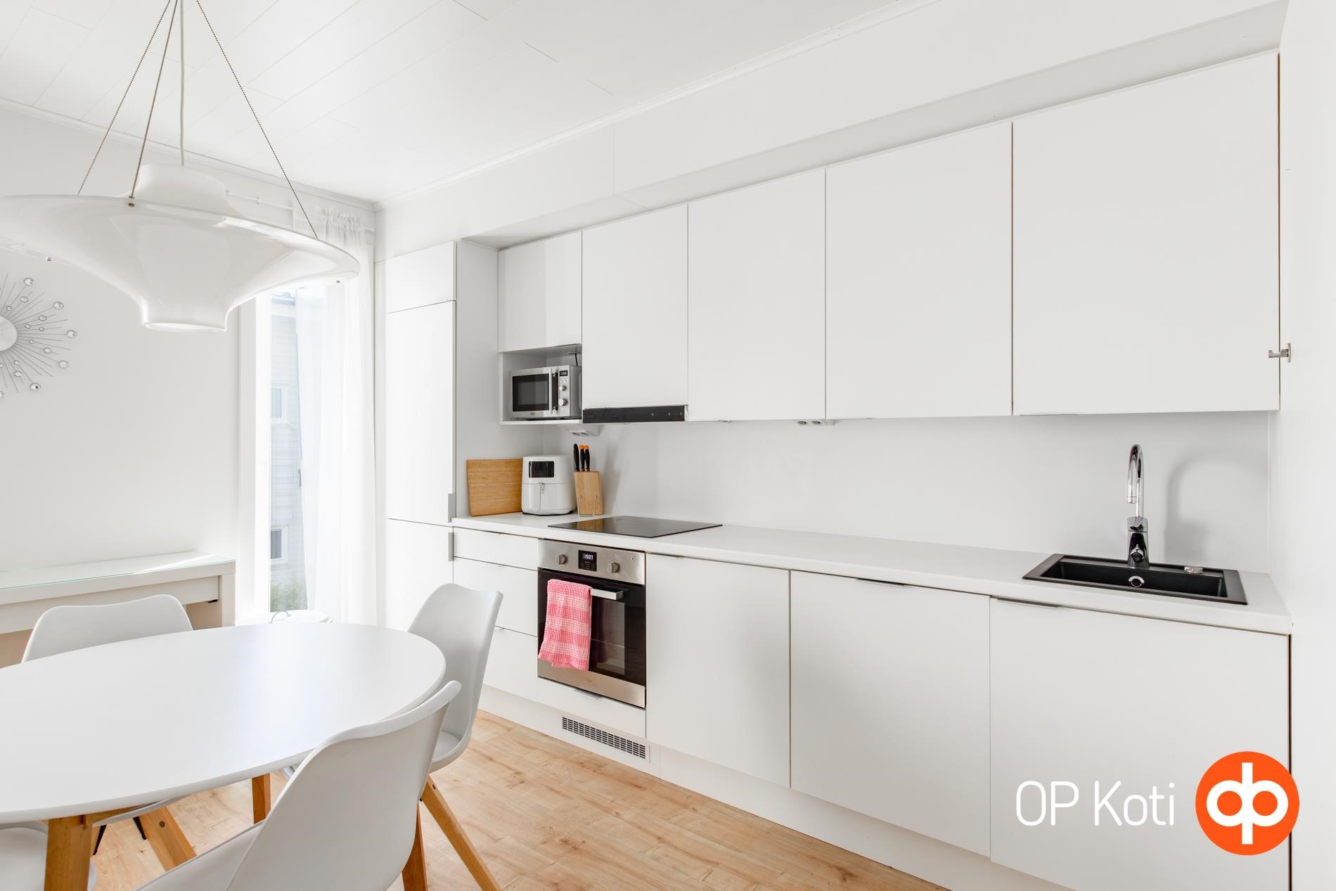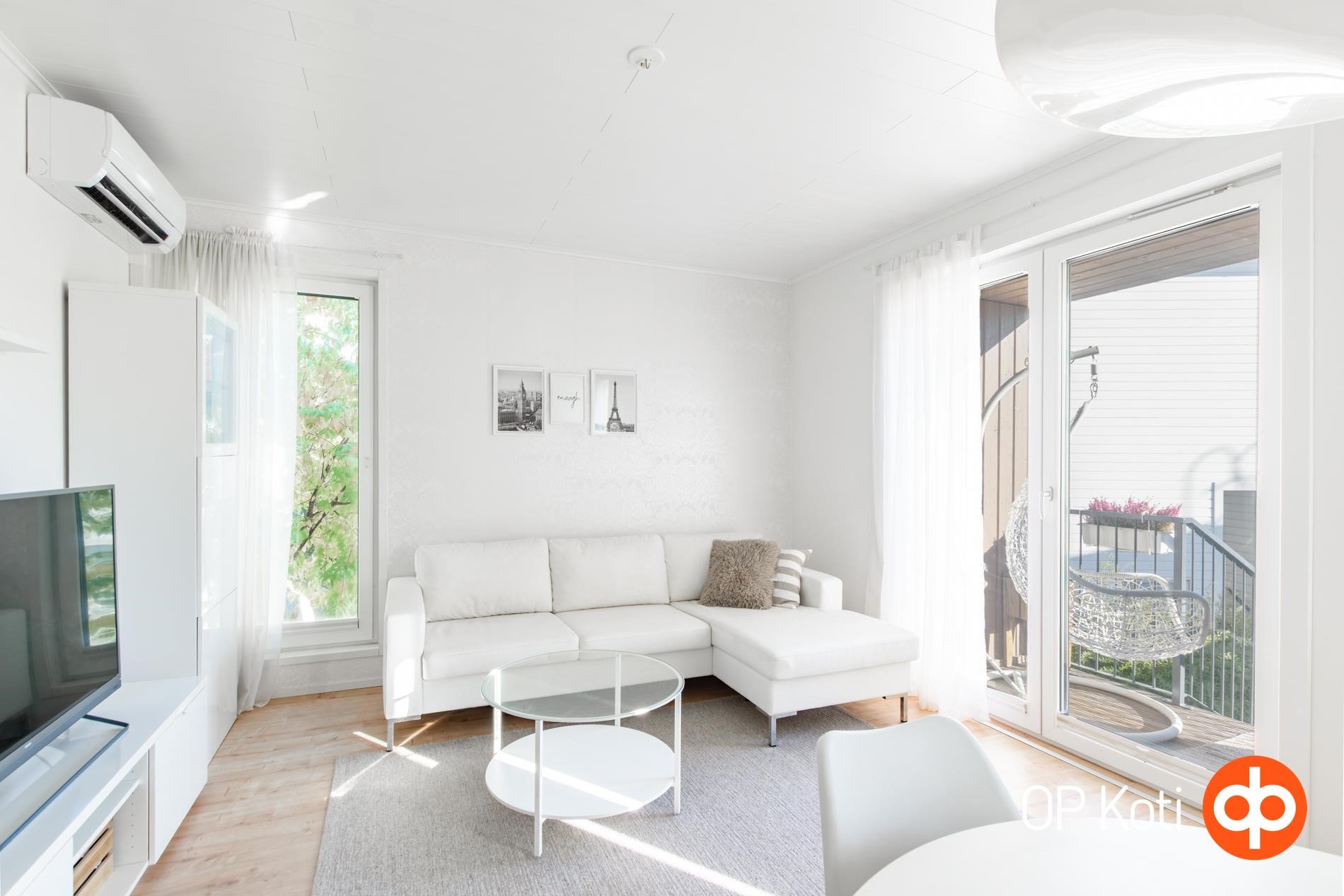 Tässä kauniissa luhtitalon ensimmäisen kerroksen kodissa on skandinaavisen vaalea värimaailma ja modernit materiaaliratkaisut. Keittiö ja olohuone muodostavat yhtenäisen kokonaisuuden. Päätyasunnon ikkunat avautuvat kolmelle ilmansuunnalle. Jäähdytyspumppu pitää asunnon sisäilman sopivan viileänä kesälläkin. Taloyhtiöllä on yhteiset viihtyisät saunatilat.
