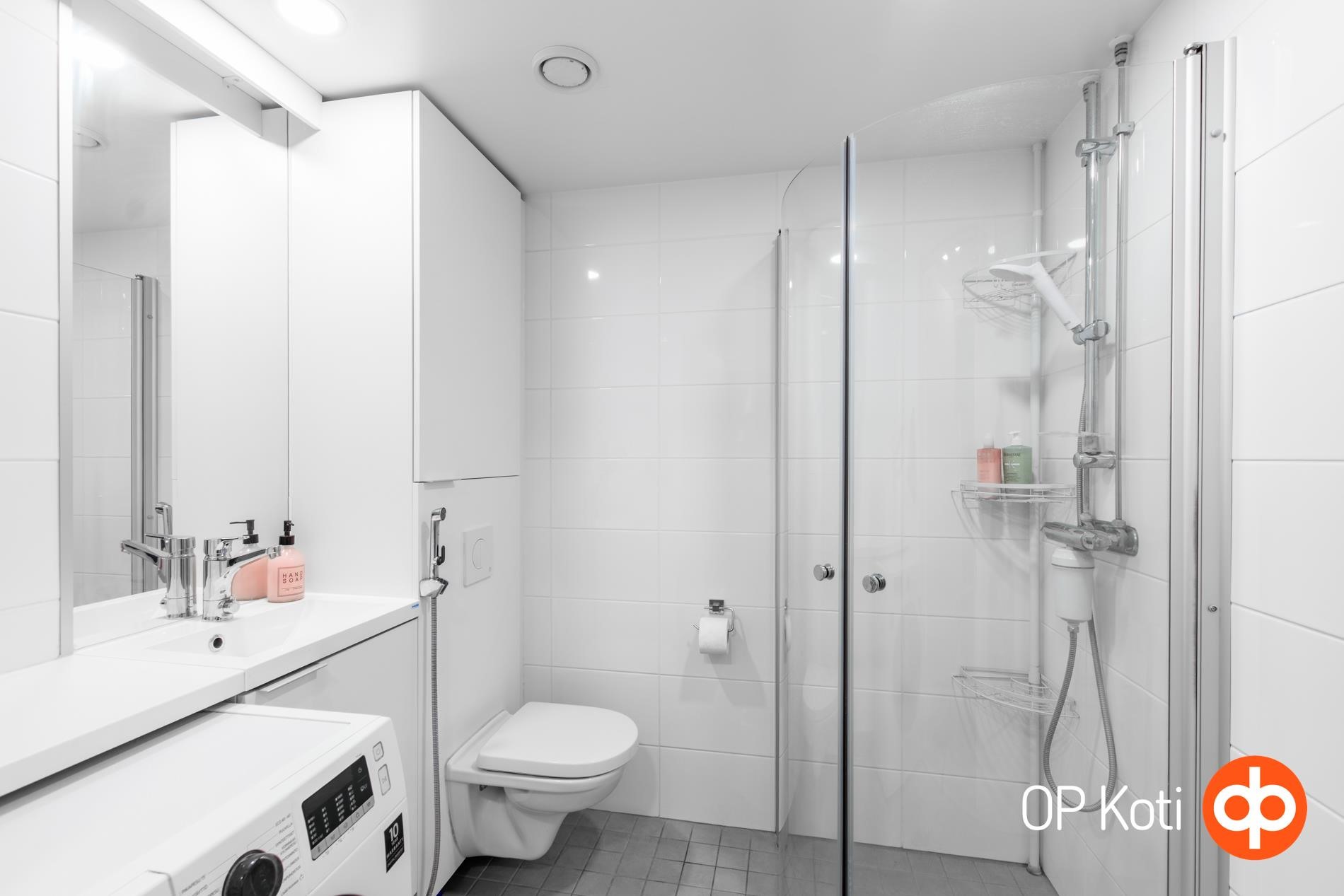 - Kylpyhuone, suihku, suihkuseinä, peilit, kaapit, allaskaappi, pesukoneliitäntä, lattialämmitys, kiinteät valaisimet.