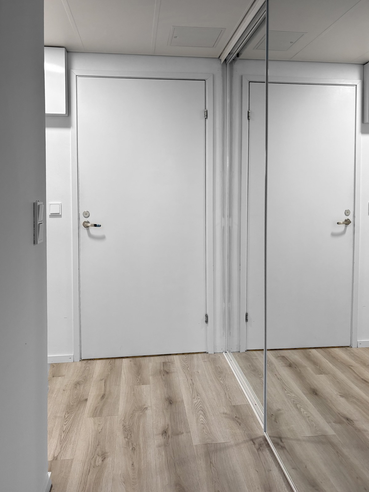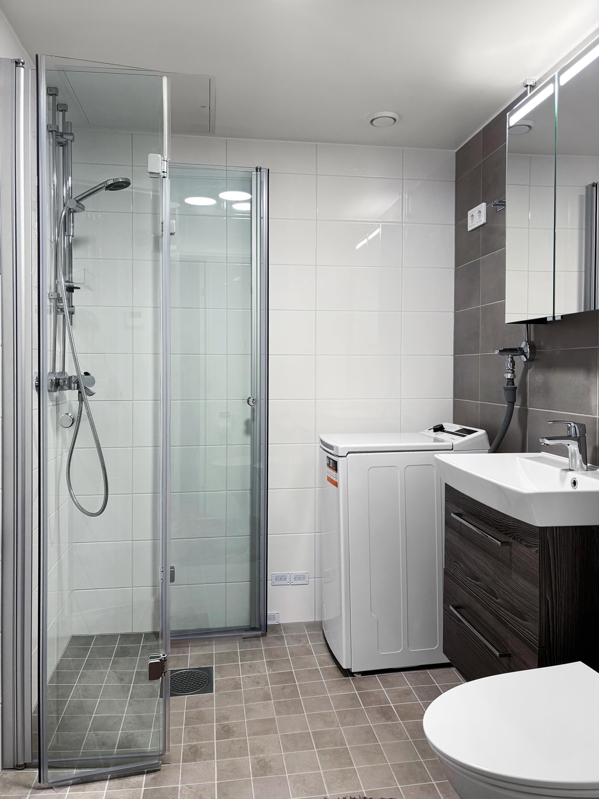 - Kylpyhuone, suihku, suihkuseinä, peilikaappi, allaskaappi, pesukoneliitäntä, lattialämmitys, kiinteät valaisimet. Pyykinpesukone