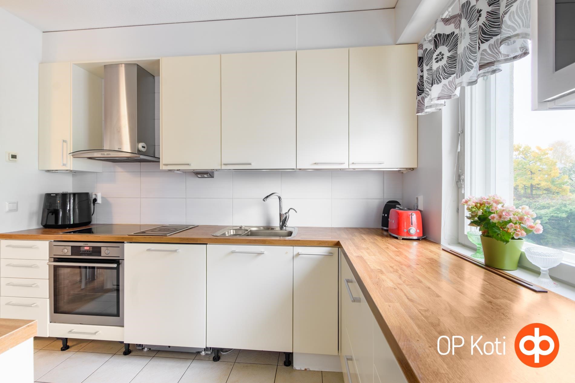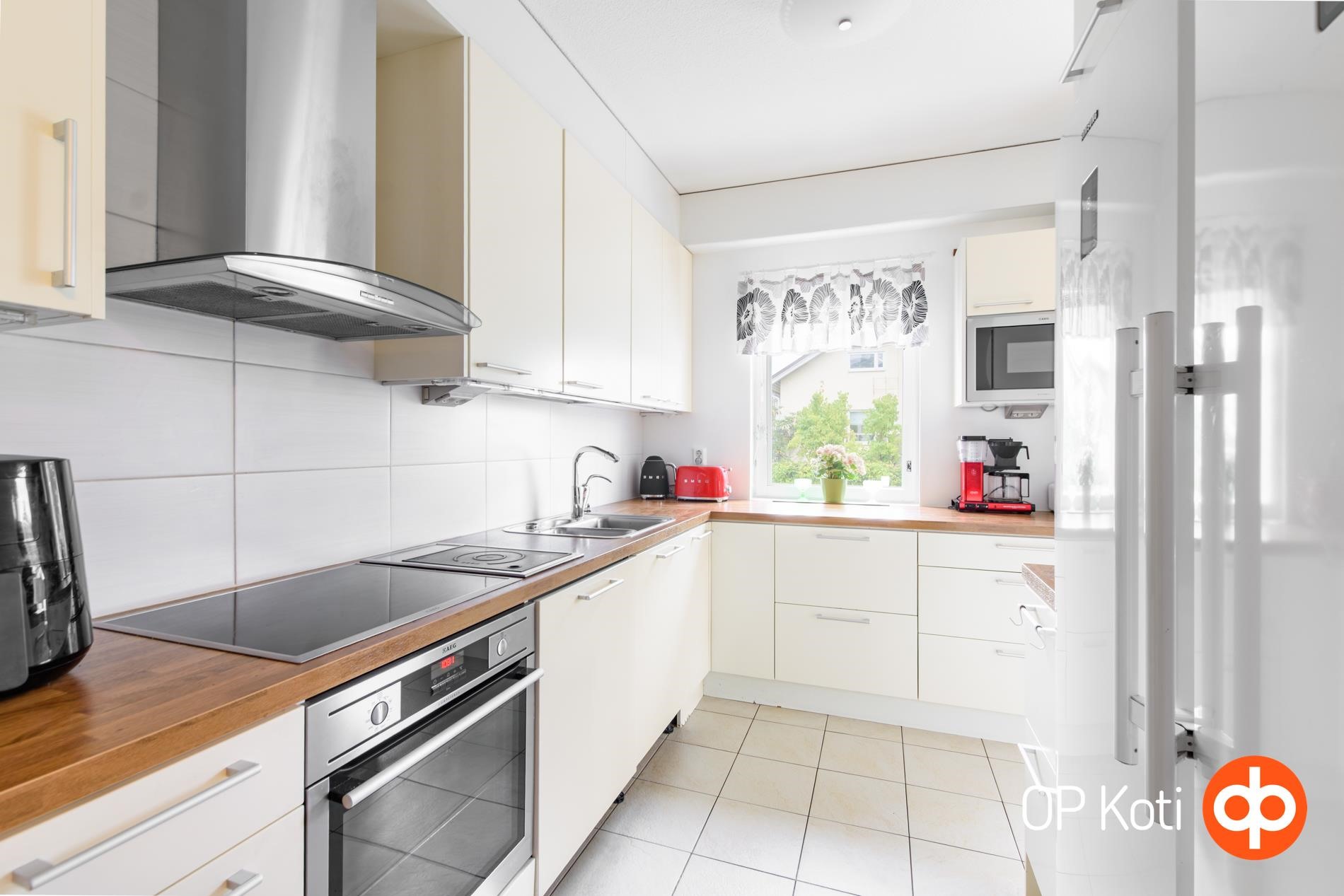 - Jääkaappipakastin, erillisuuni, liesitaso, induktioliesi, liesituuletin, mikroaaltouuni, astianpesukone, kaapistot, kiinteät valaisimet.