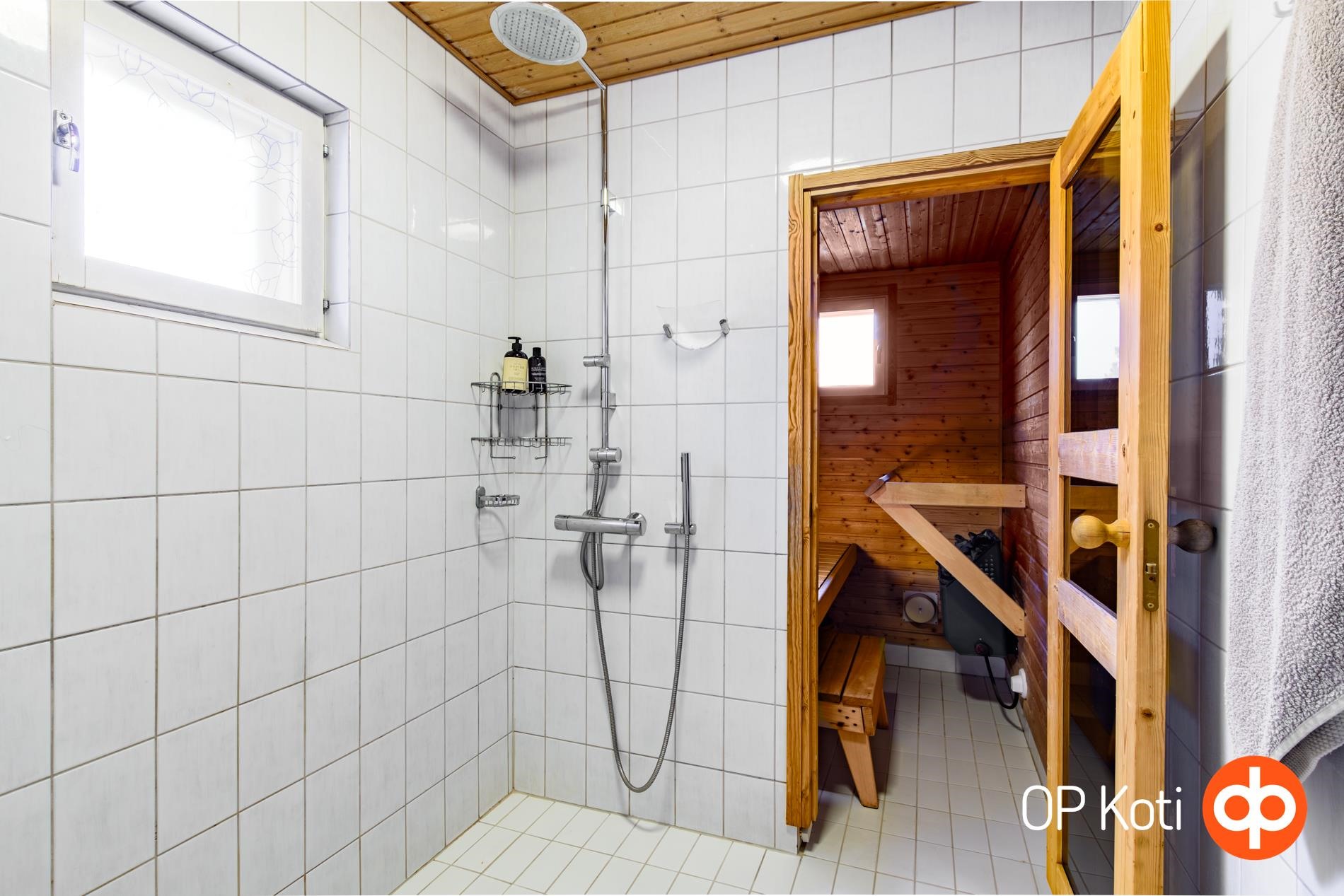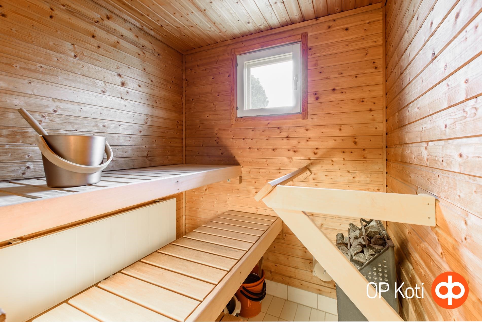 - Sauna, sähkökiuas, kylpyhuone, erillinen wc, suihkukaappi, peilit, peilikaappi, kaapit, allaskaappi, pesukoneliitäntä, lattialämmitys, kiinteät valaisimet.