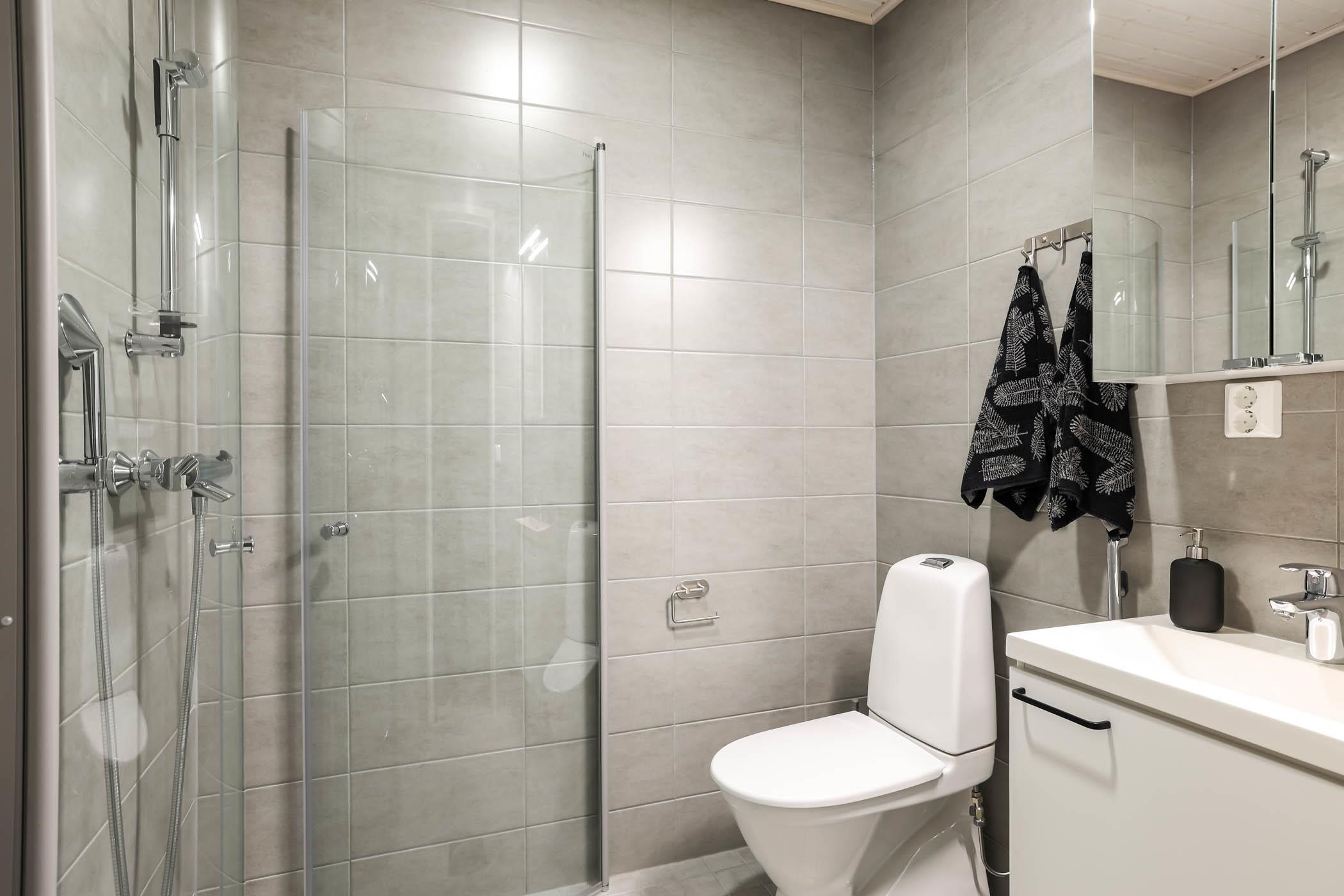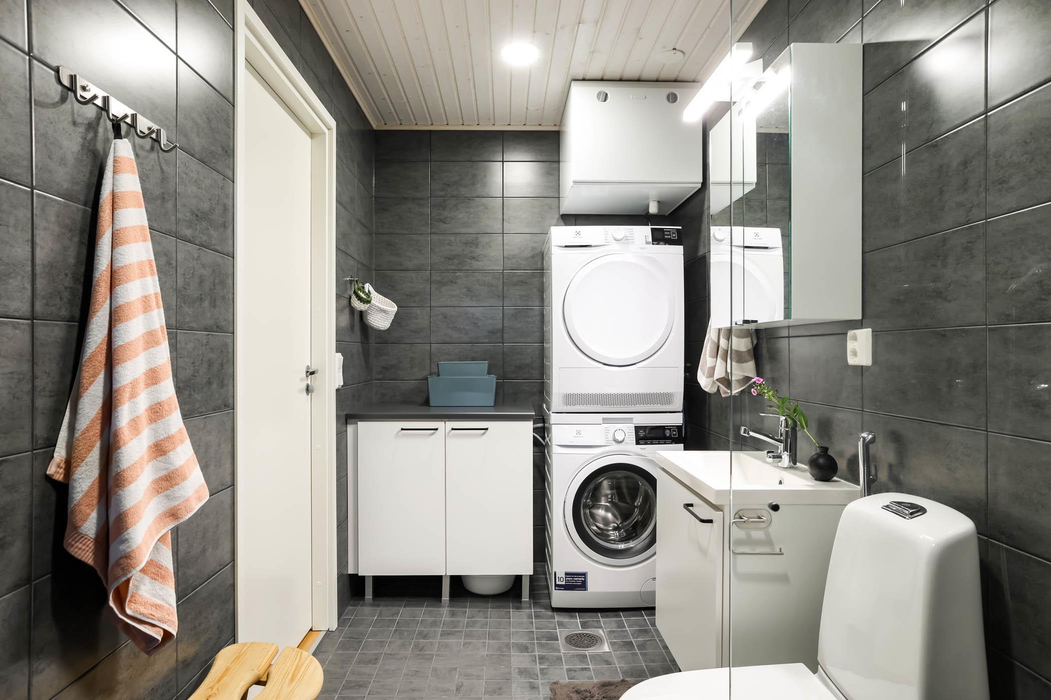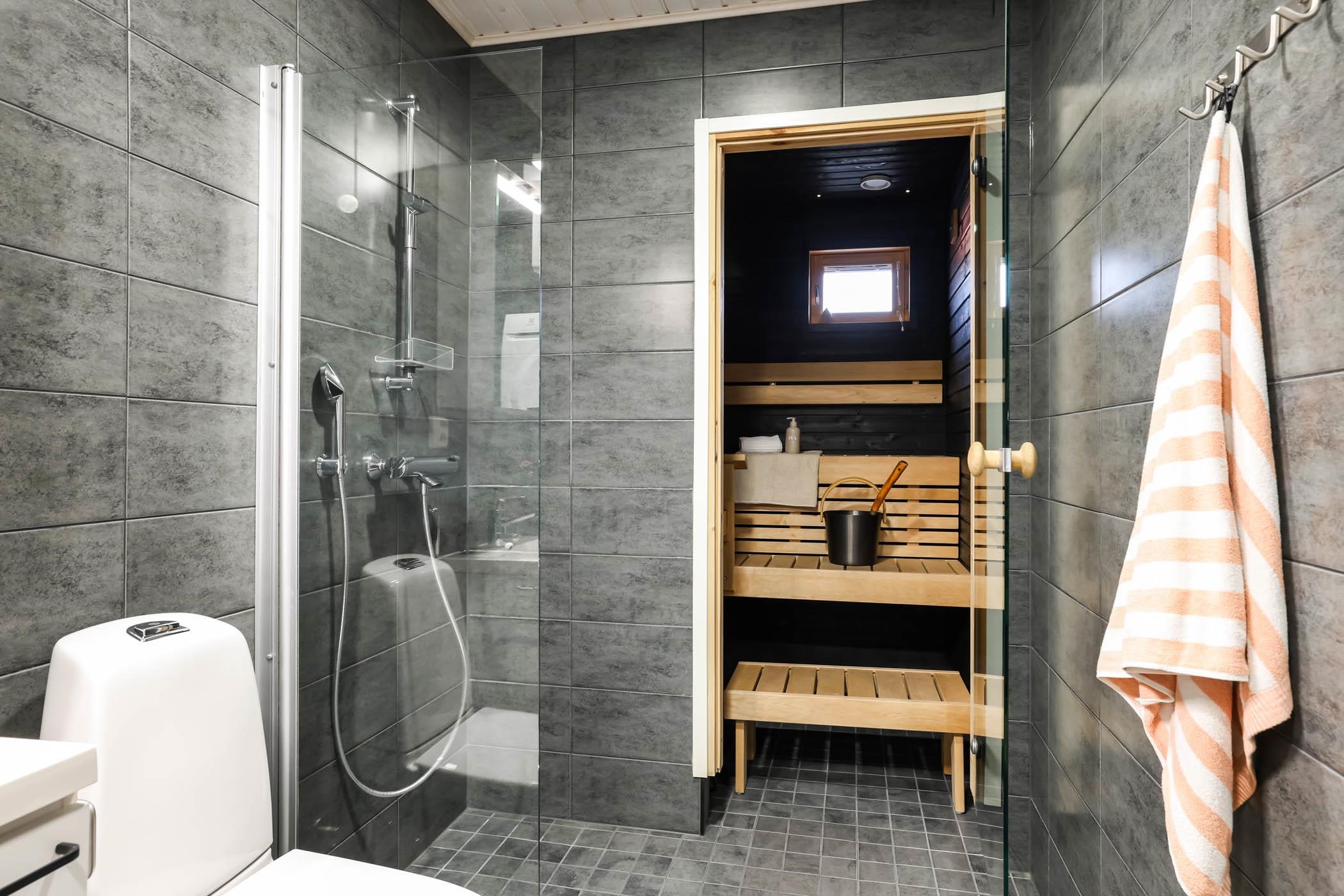 - Saunassa tervaleppälauteet, himmennetävät kuituvalot, sähkökiuas. Yläkerran kylpyhuoneessa suihku, suihkuseinä, peilikaappi wc-istuin, allaskaappi, pesukoneliitäntä. Alakerran wc /kylpyhuoneessa peilikaappi, allaskaappi, suihku, suihkuseinä.