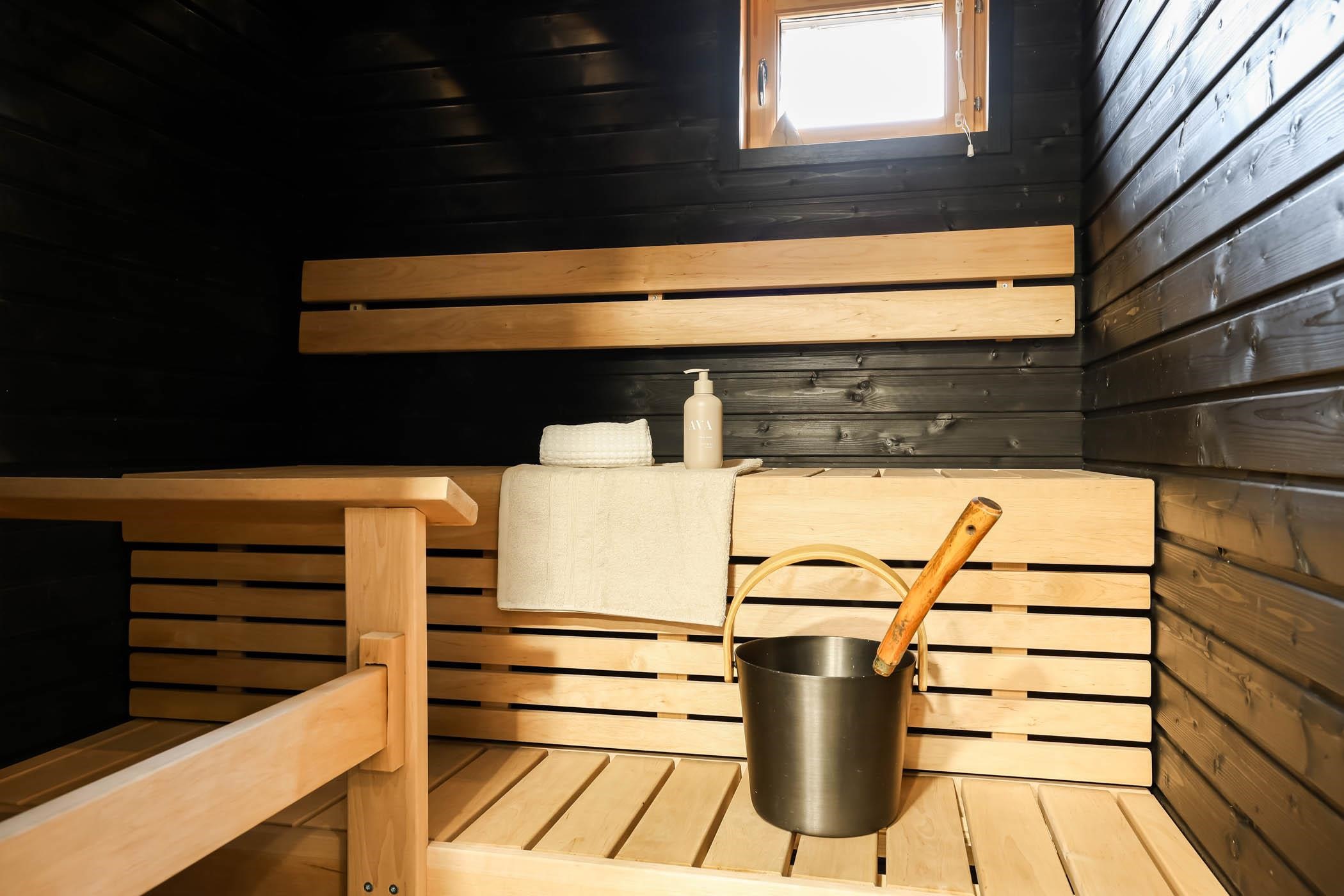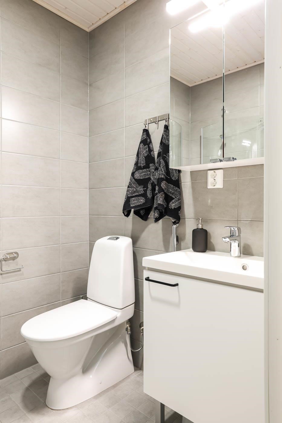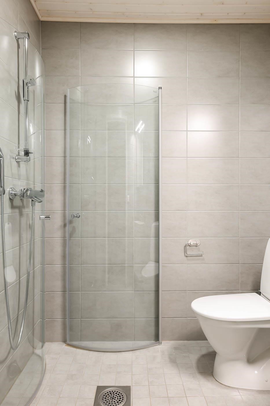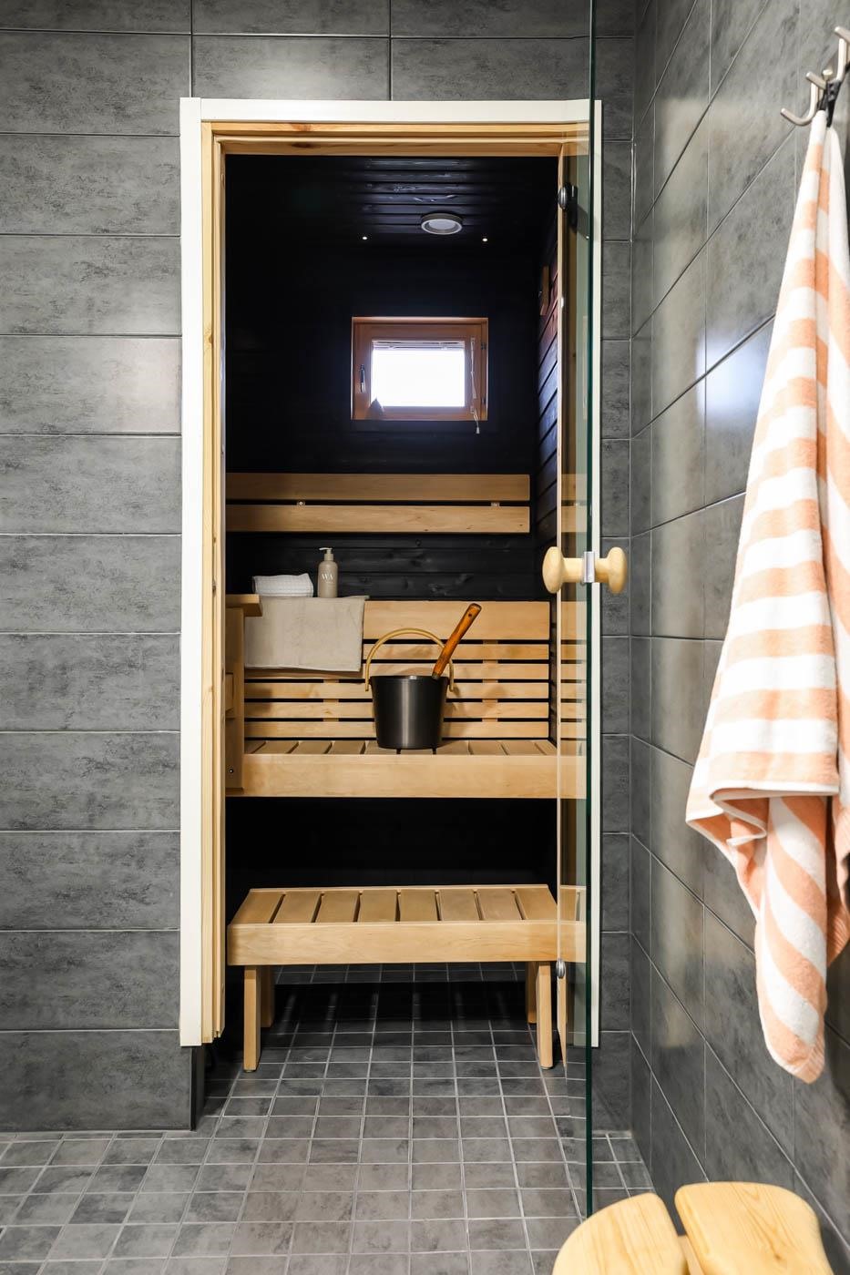- Saunassa tervaleppälauteet, himmennetävät kuituvalot, sähkökiuas. Yläkerran kylpyhuoneessa suihku, suihkuseinä, peilikaappi wc-istuin, allaskaappi, pesukoneliitäntä. Alakerran wc /kylpyhuoneessa peilikaappi, allaskaappi, suihku, suihkuseinä.
