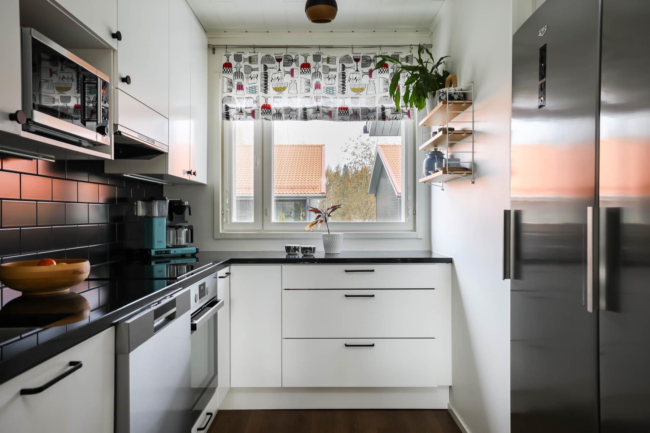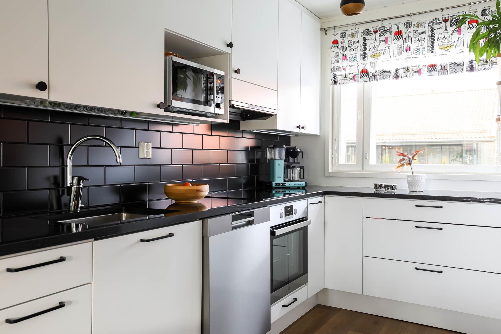 - Jääkaappi, pakastekaappi, erillisuuni kiertoilma, induktioliesitaso, liesituuletin, astianpesukone, kaapistot, kiinteät valaisimet, kivipöytätasot.