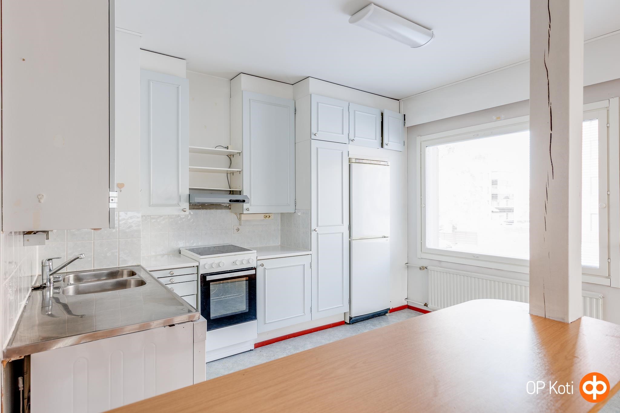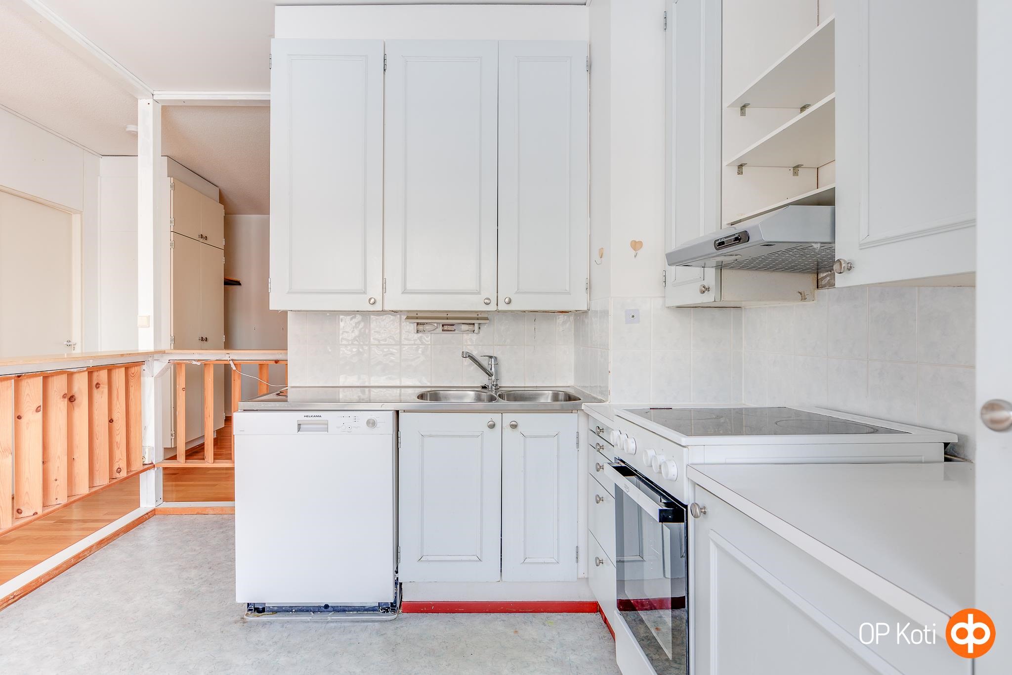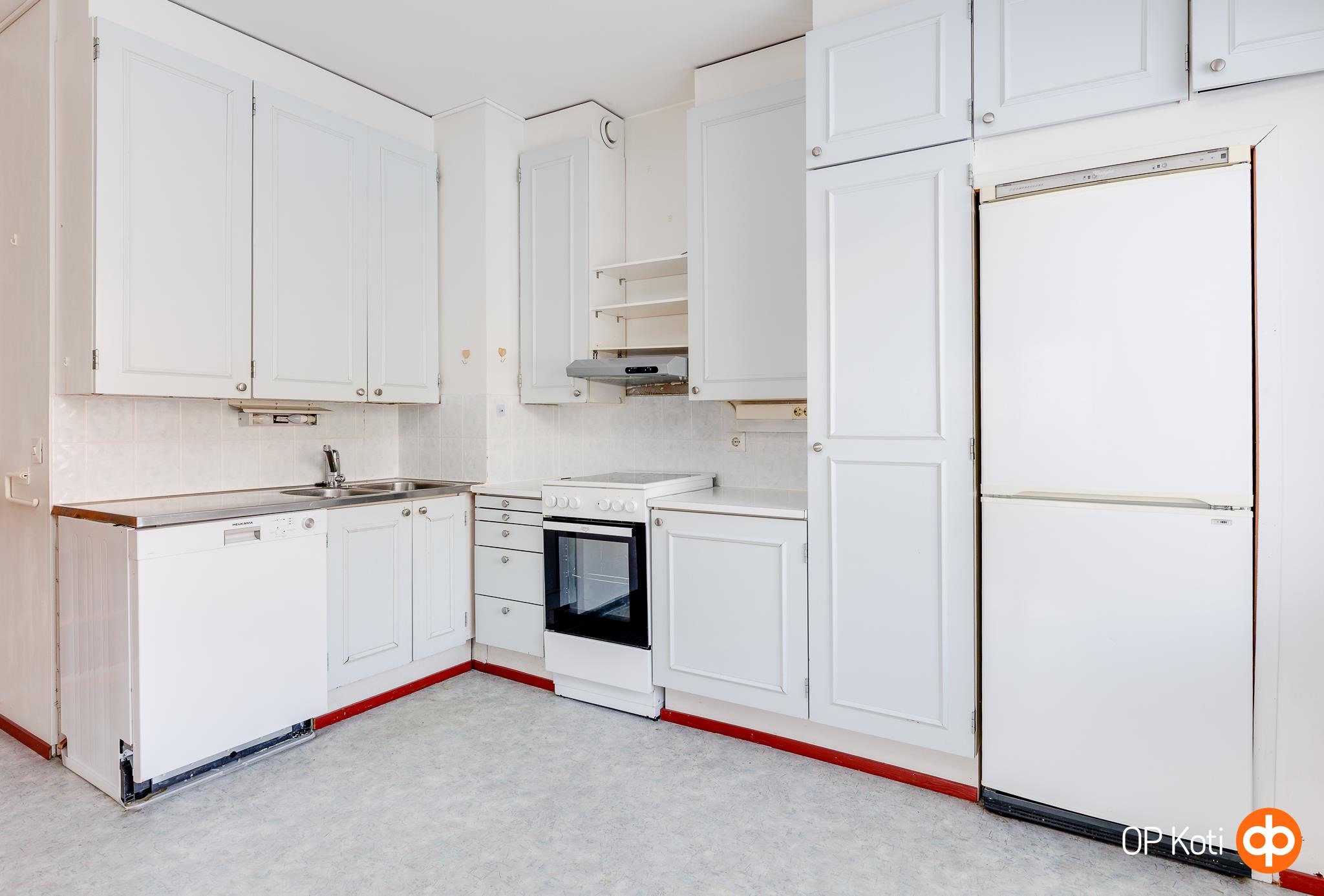 - Jääkaappipakastin, sähköliesi (uusittu 2024), liesituuletin (uusittu 2024), astianpesukone, kaapistot, kiinteät valaisimet.