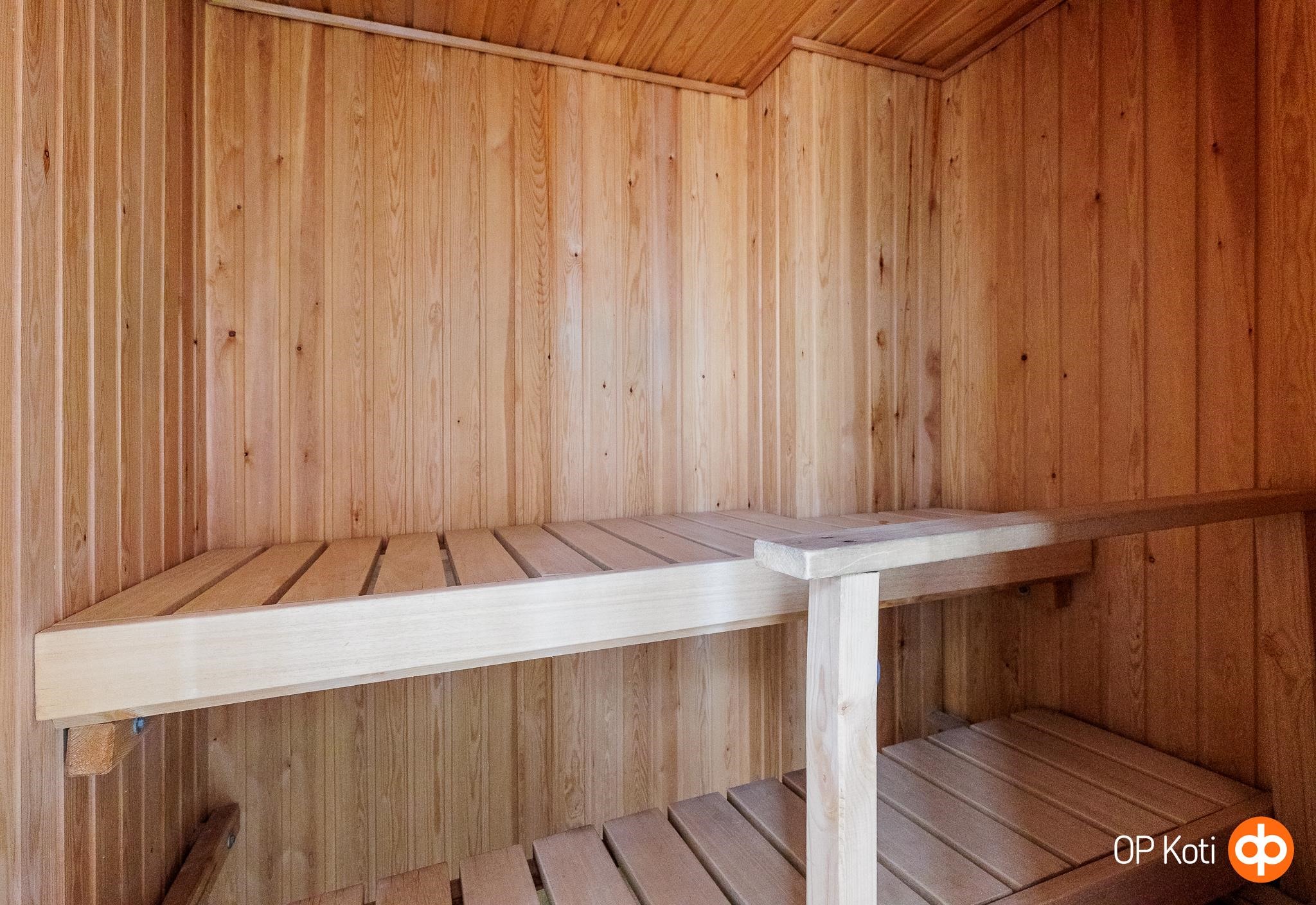 - Sauna, sähkökiuas, kylpyhuone, suihku, pesukoneliitäntä.
