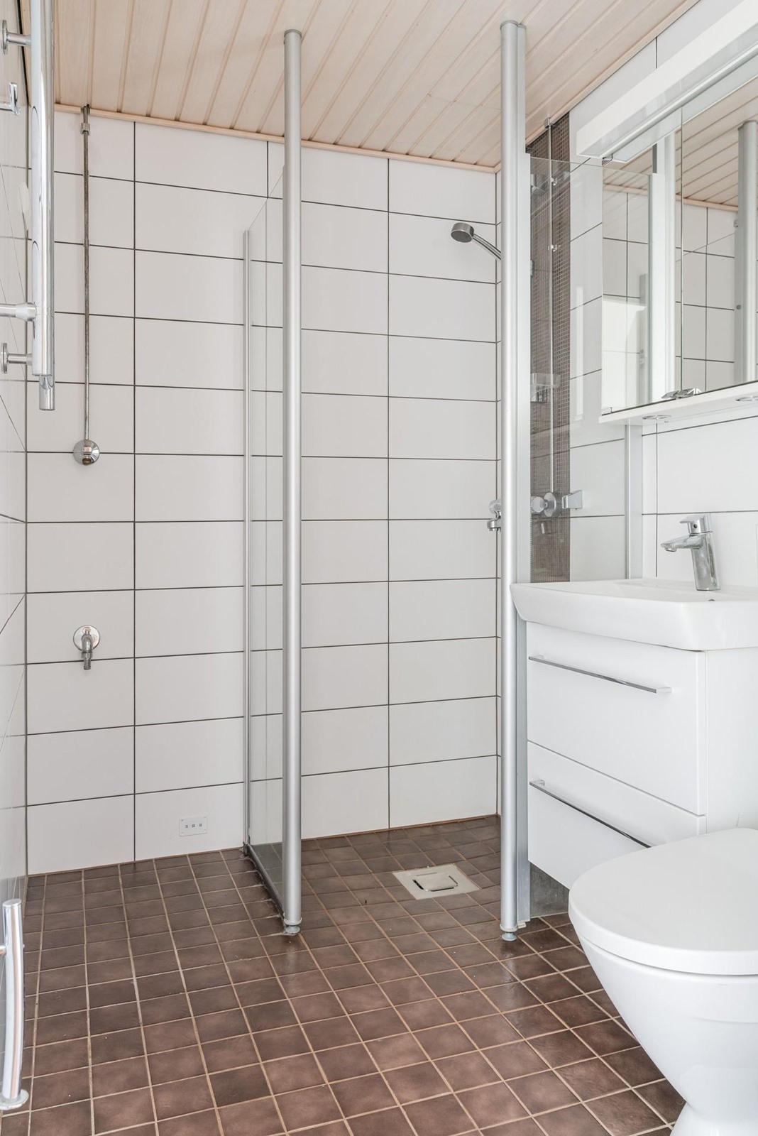 - Kylpyhuone, suihku, suihkuseinä 2 kpl, peilikaappi, allaskaappi, pesukoneliitäntä, lattialämmitys, kiinteät valaisimet.