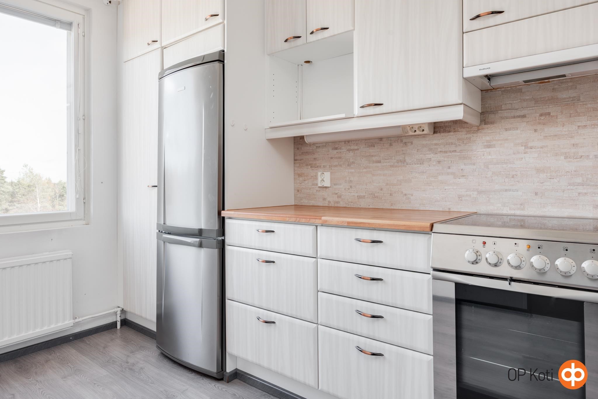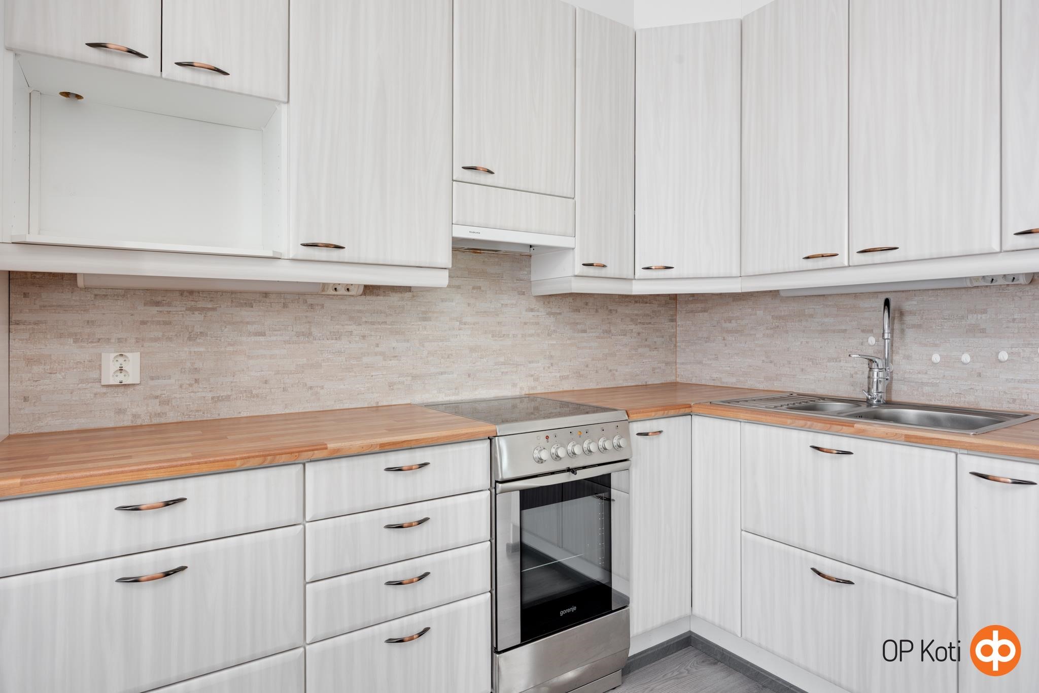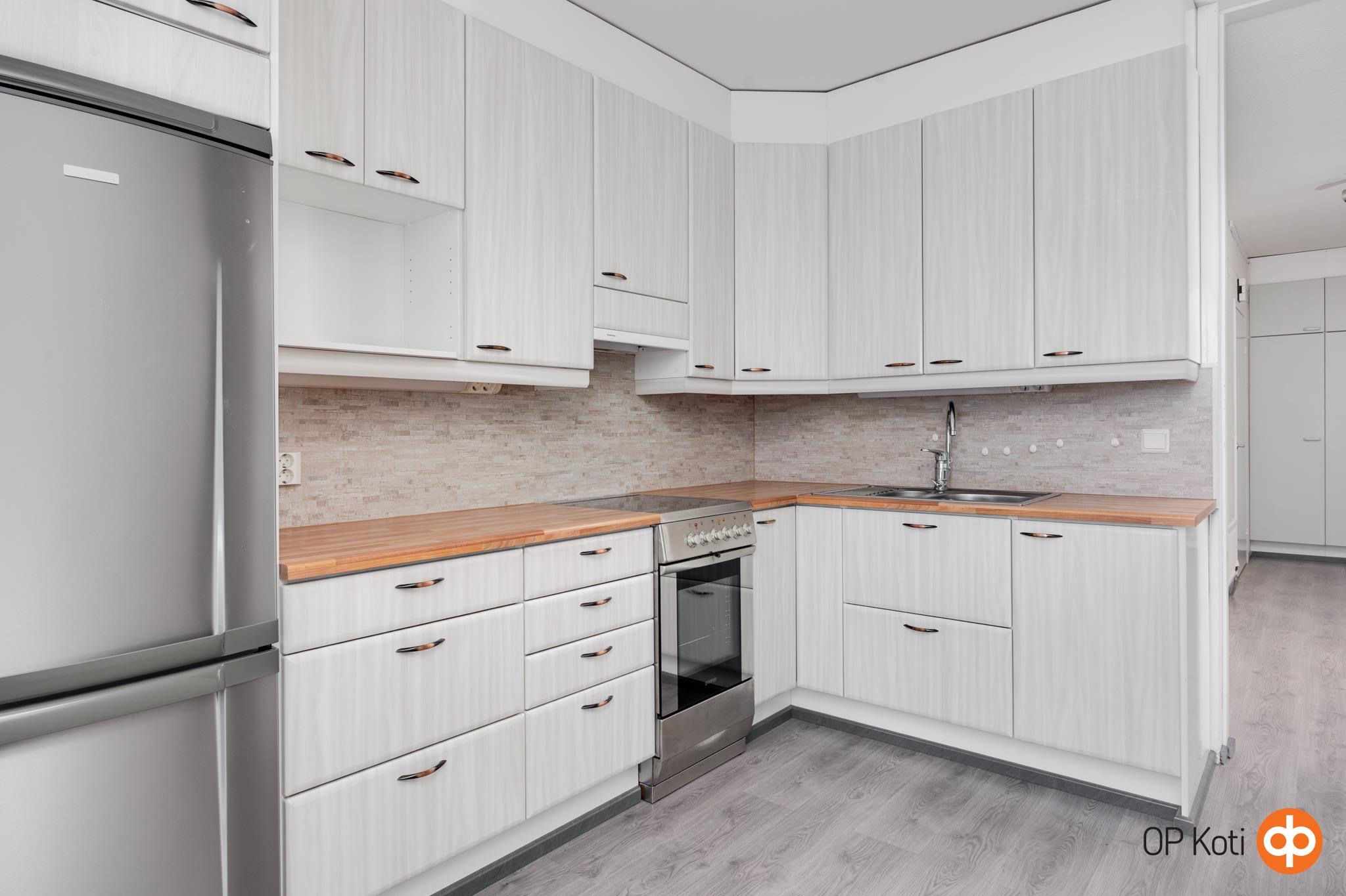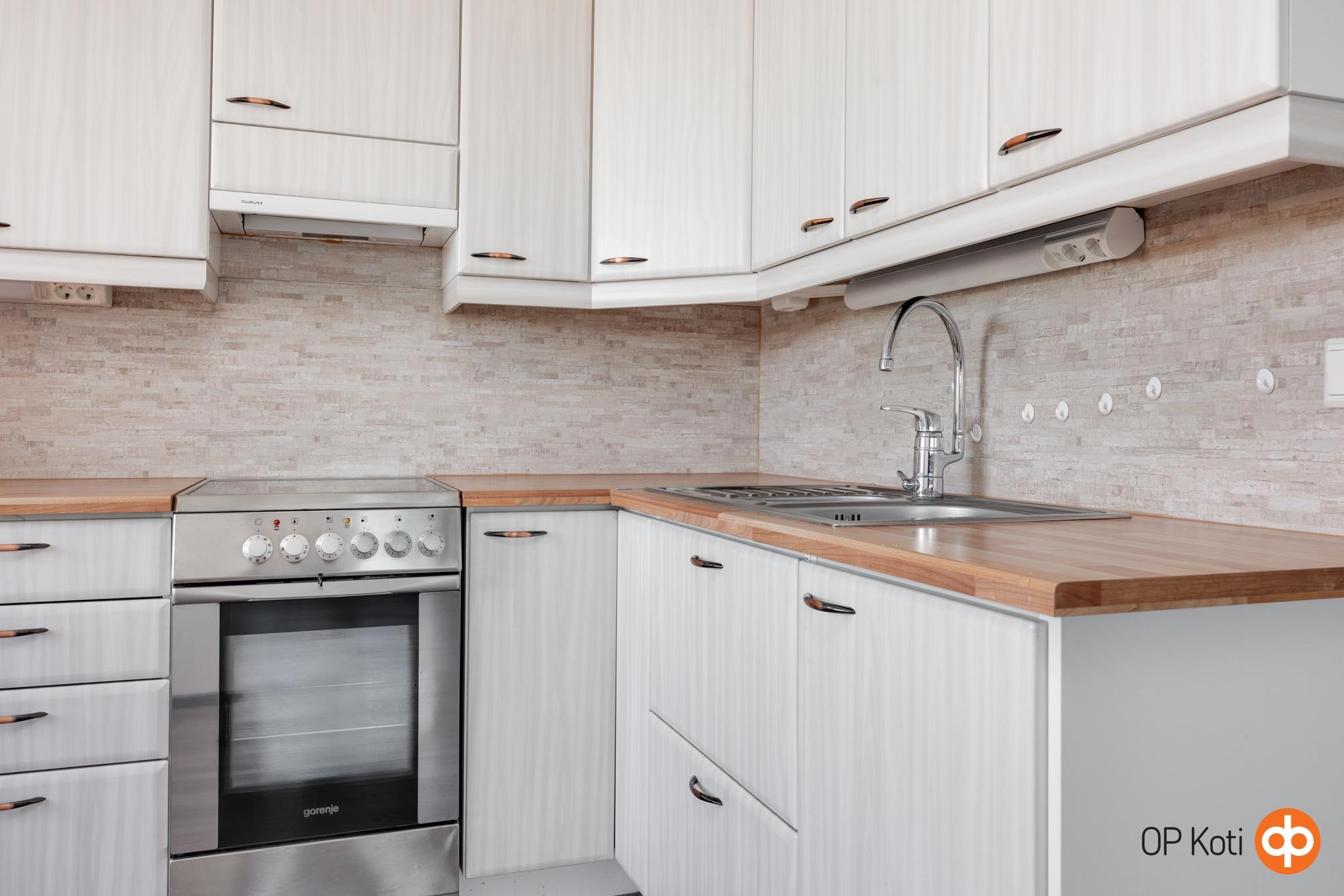 - Jääkaappipakastin, keraaminen liesi, liesikupu, kaapistot, kiinteät valaisimet.