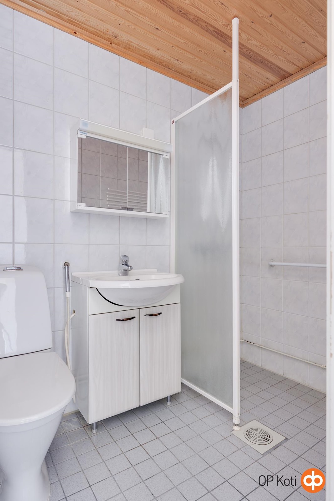 - Kylpyhuone, suihku, suihkuseinä, peilikaappi, allaskaappi, kiinteät valaisimet.