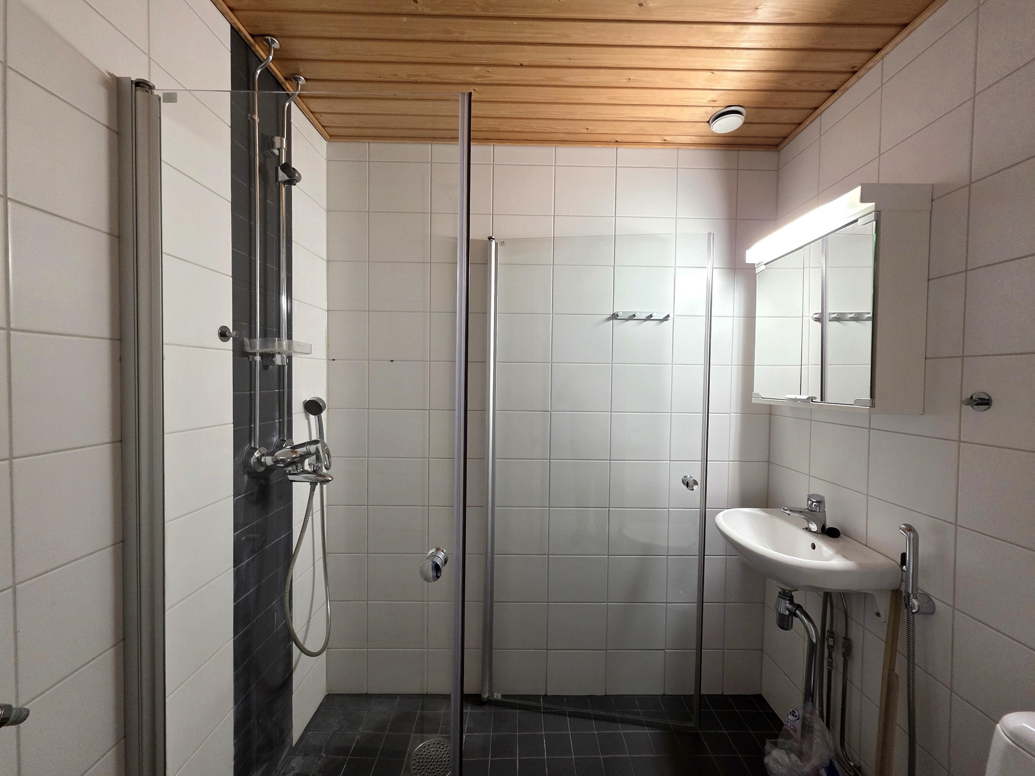 - Kylpyhuone, suihkukaappi, peilikaappi, pesukoneliitäntä, kiinteät valaisimet.