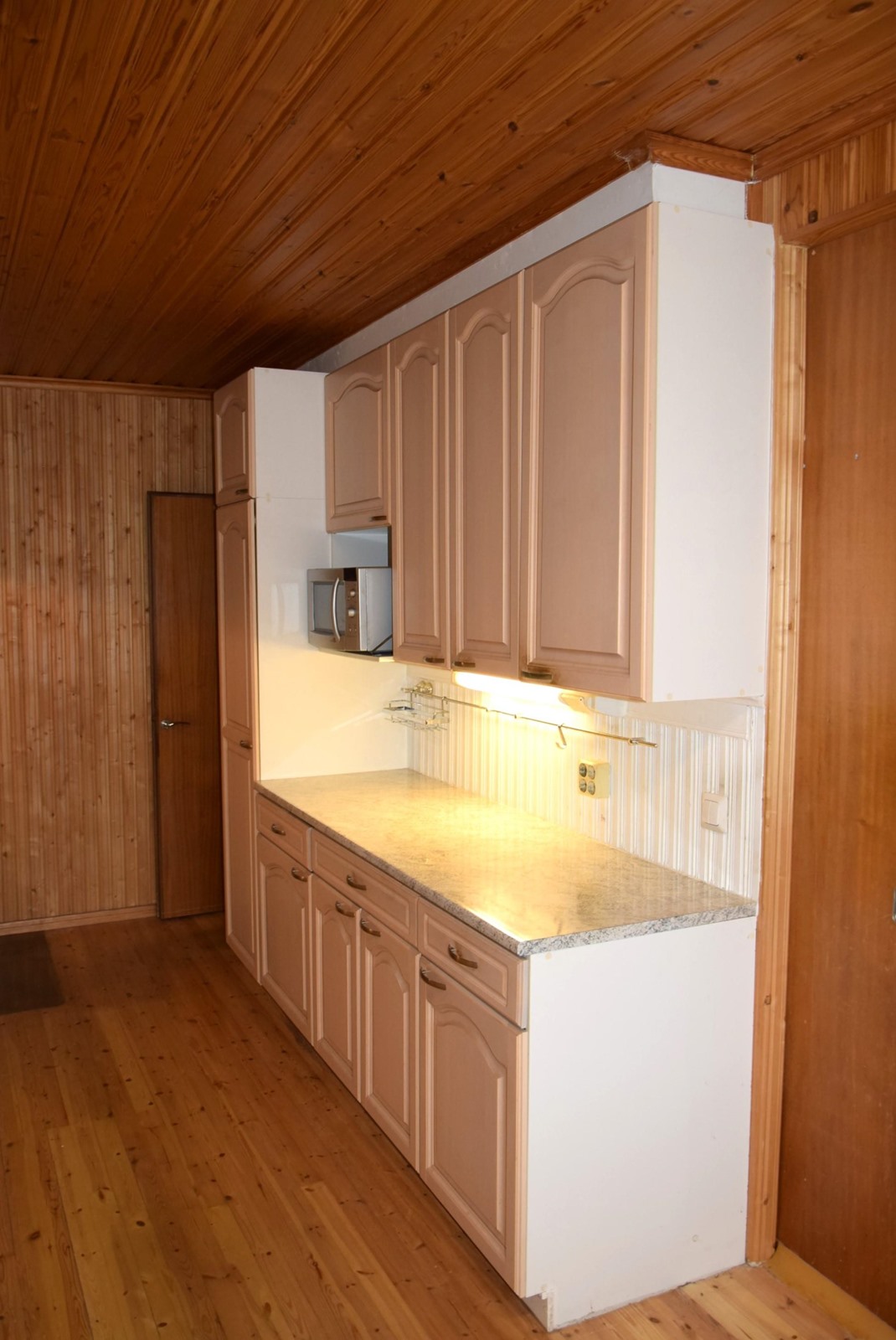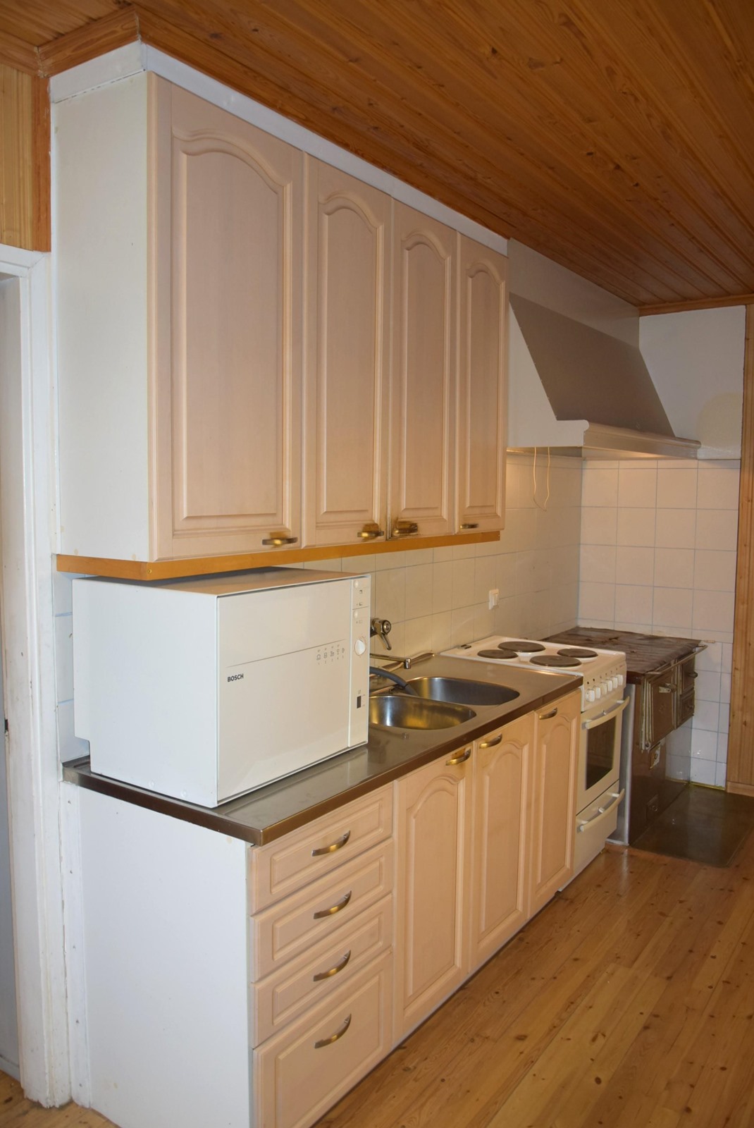 - Jääkaappi, pakastekaappi, sähköliesi, liesikupu, astianpesukone pöytämalli, kaapistot, kiinteät valaisimet, puuliesi.