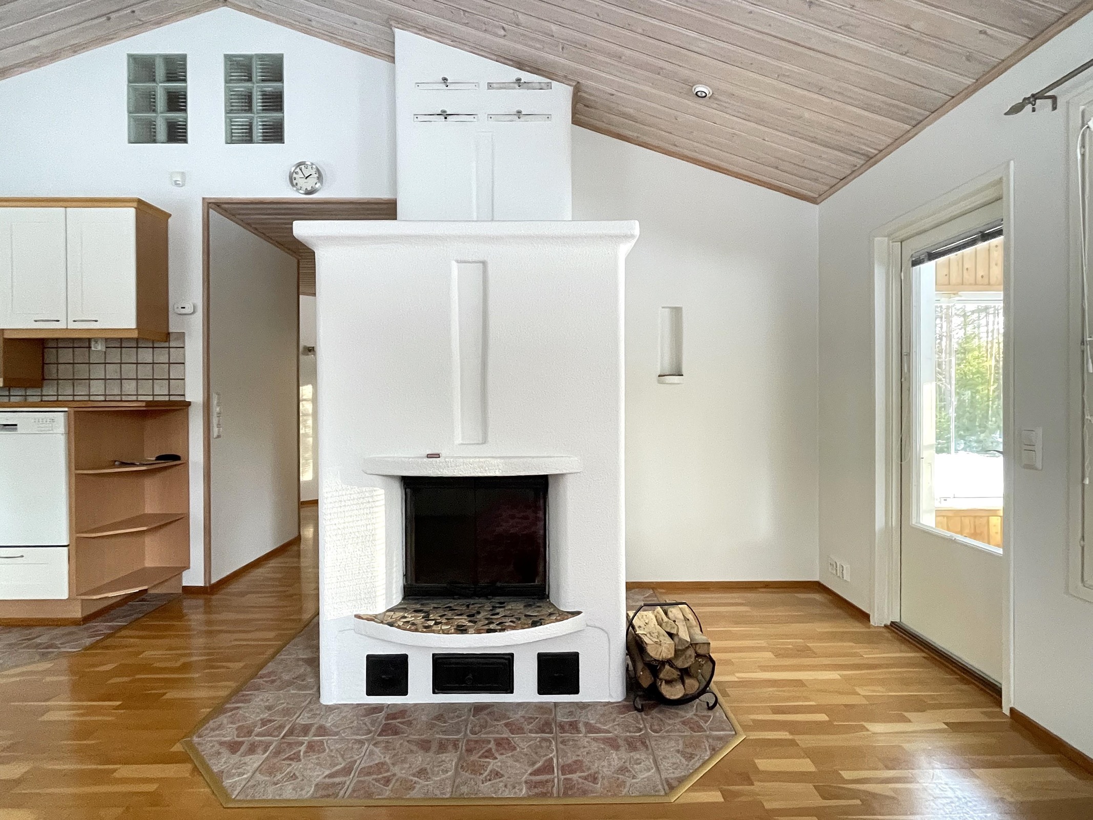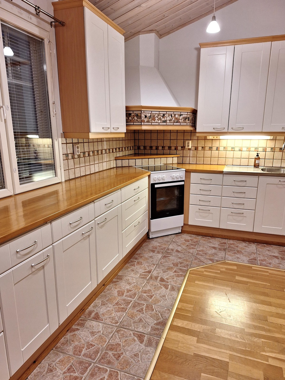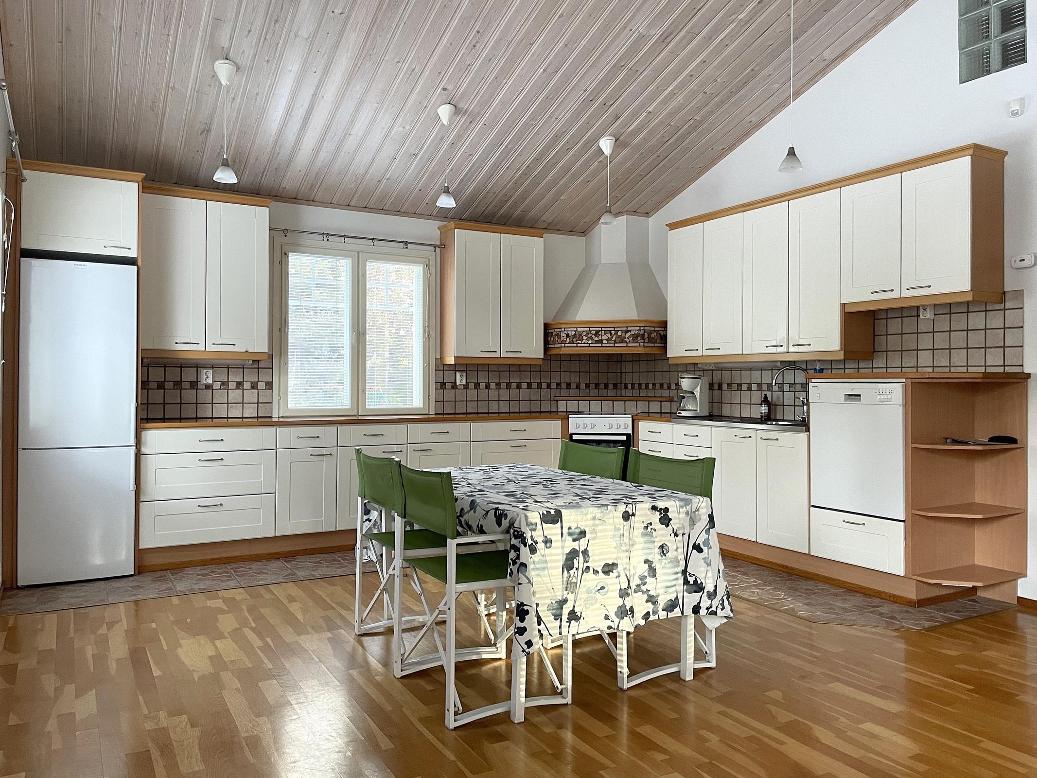 - Jääkaappipakastin, keraaminen liesi, liesikupu, astianpesukone, kaapistot, kiinteät valaisimet.