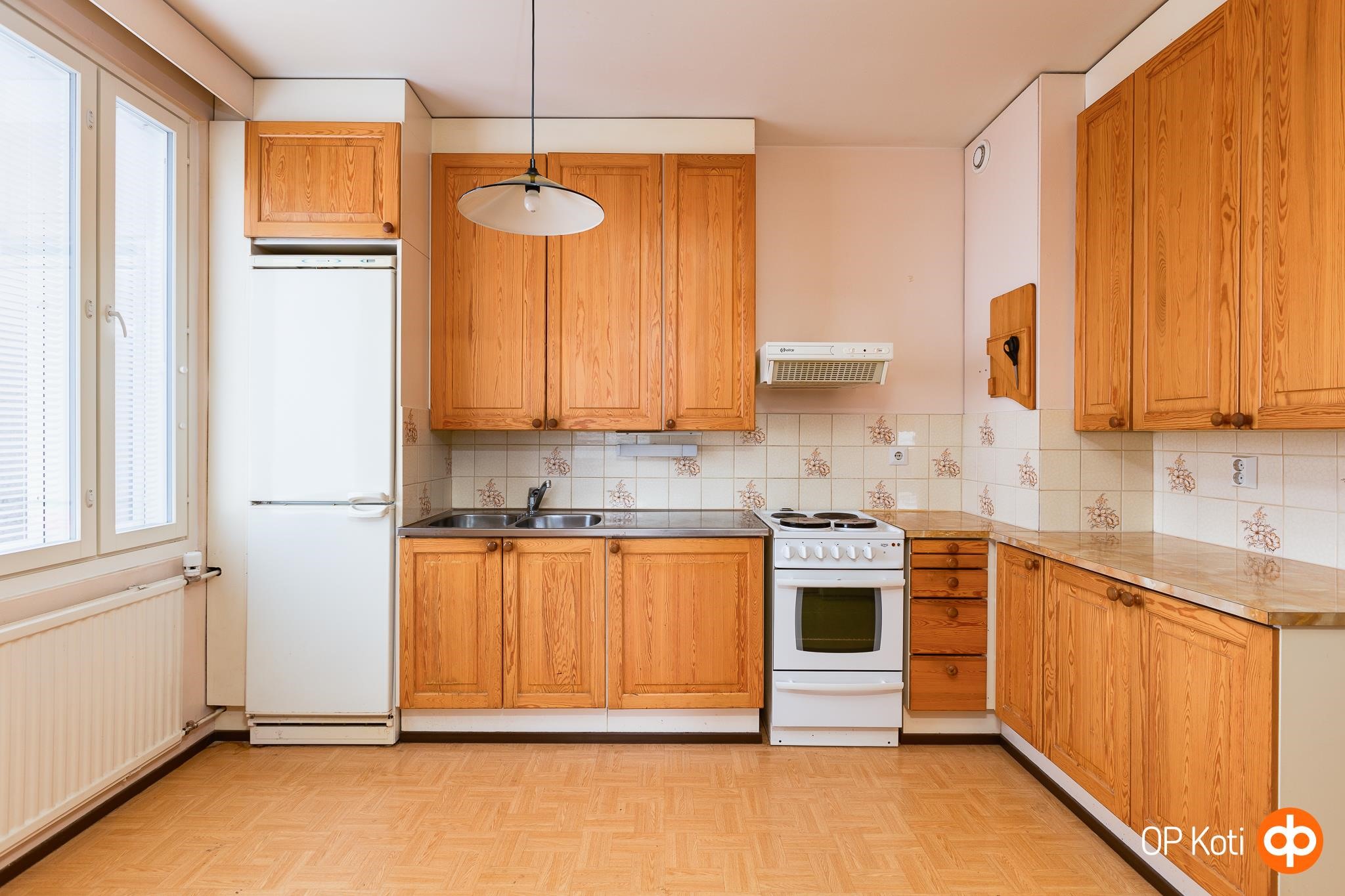 - Jääkaappipakastin, lattialiesi, sähköliesi, liesituuletin, kaapistot, kiinteät valaisimet.