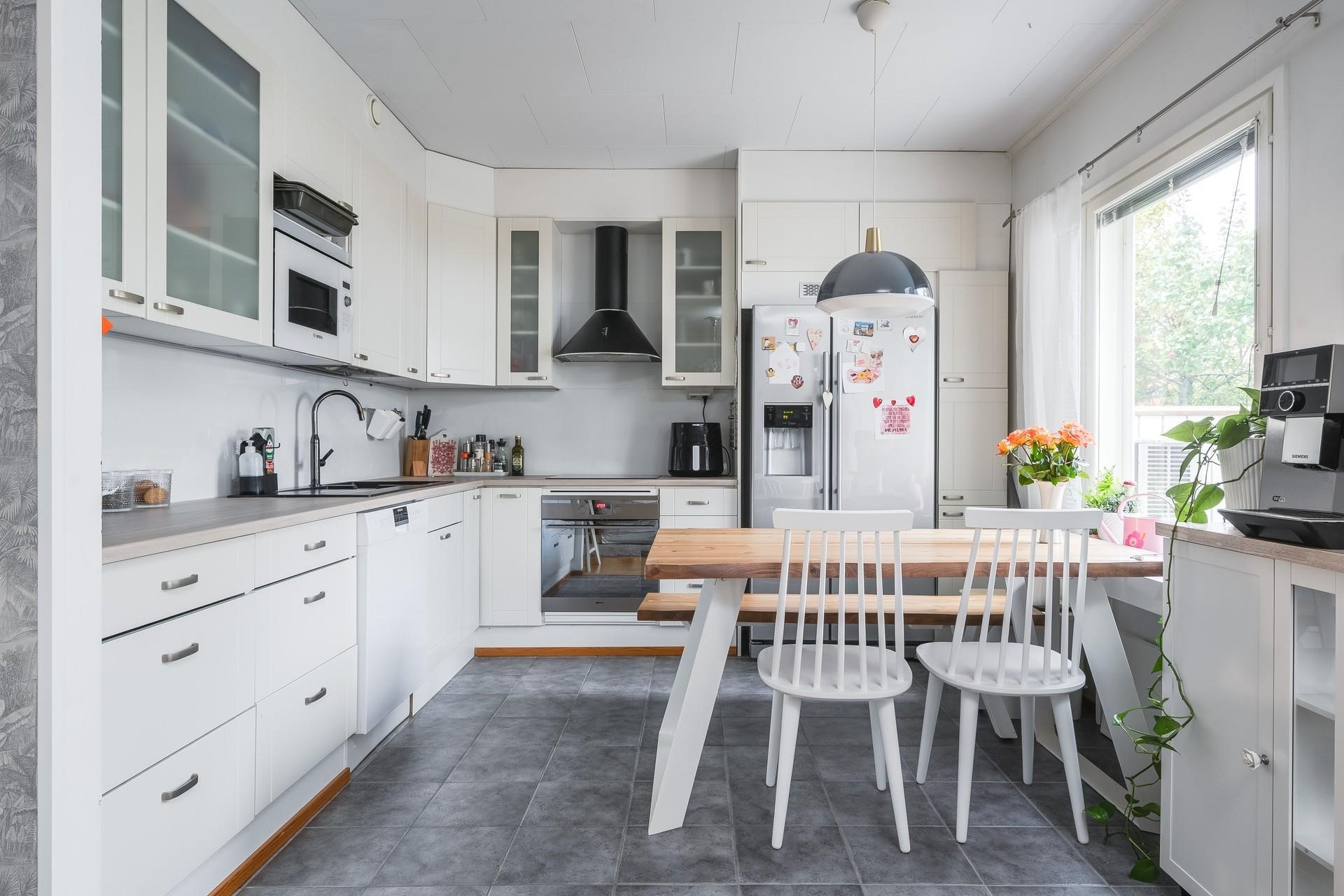 - Jääkaappipakastin, erillisuuni, liesitaso, liesituuletin, mikroaaltouuni, astianpesukone, kaapistot, kiinteät valaisimet. Työtasot ja välitilan laatoitus sekä kaappeja lisätty 2021, keraaminen liesitaso ja erillisuuni uusittu 2024