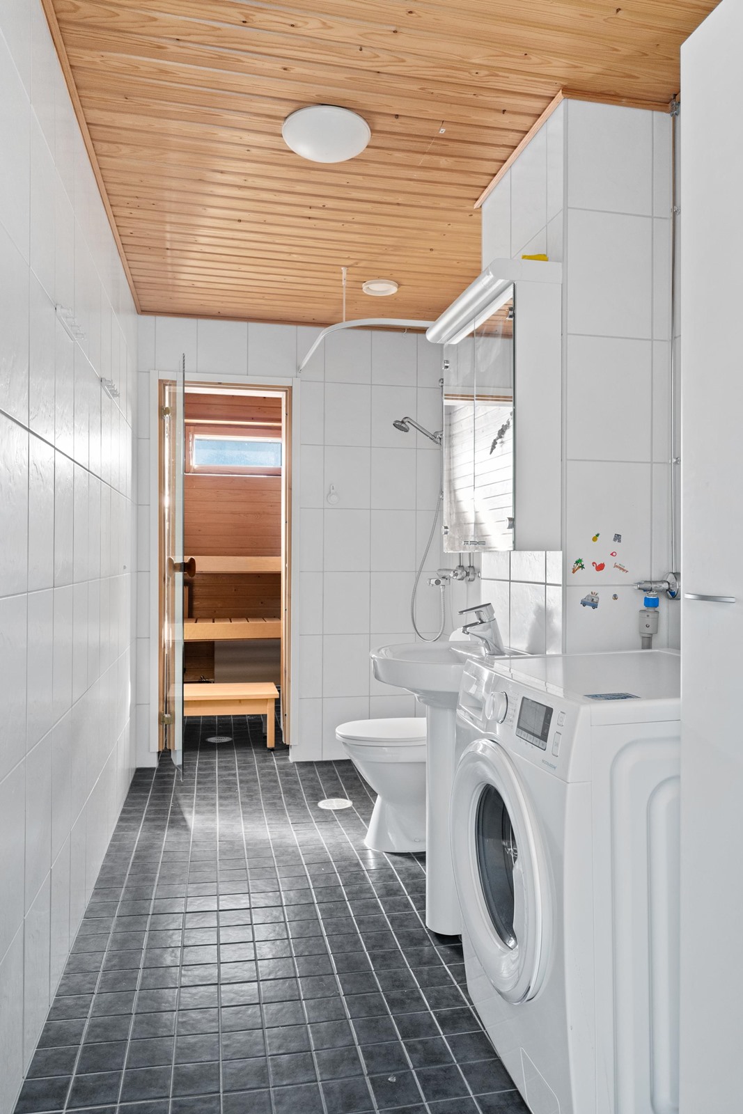 - Sauna, sähkökiuas, suihku, suihkuseinä, peilikaappi, pesukoneliitäntä, lattialämmitys.