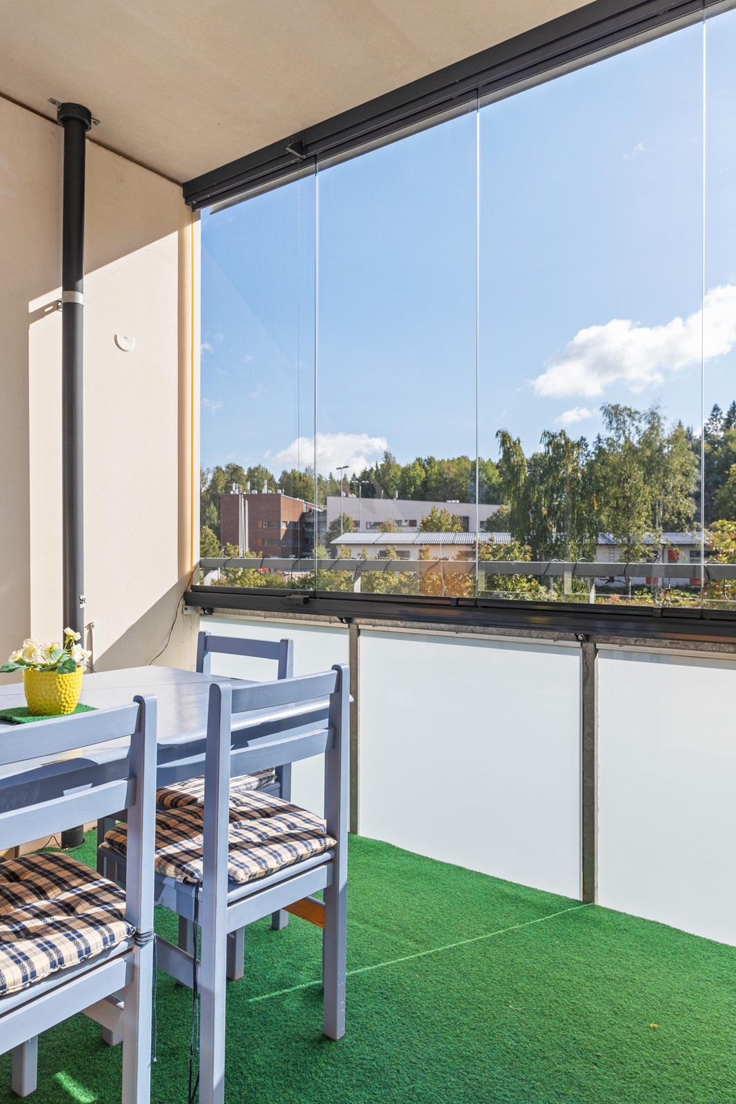 Hyväpohjainen saunallinen kolmio rauhallisella alueella. Lasitettu parveke etelään sisäpihan puolelle.Tässä ensimmäisen asuinkerroksen, mutta rakennuksen toisessa kerroksessa sijaitsevassa kodissa pääset nauttimaan rauhallisesta asumisesta ilman alakerran naapureita. Juna 600 m päässä. Autopaikka 15 €/kk. Elisan 25 M laajakaista sisältyy vuokraan.