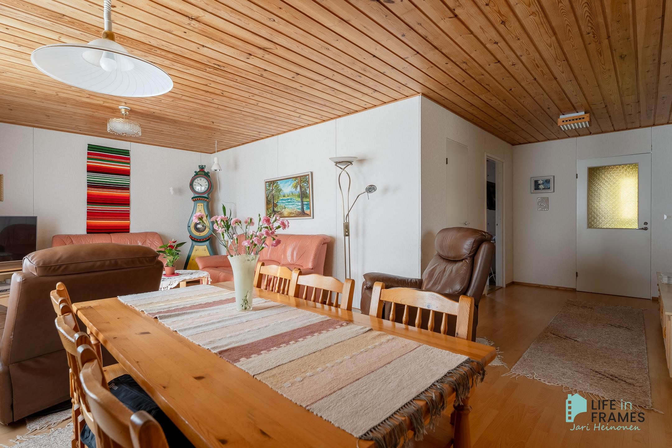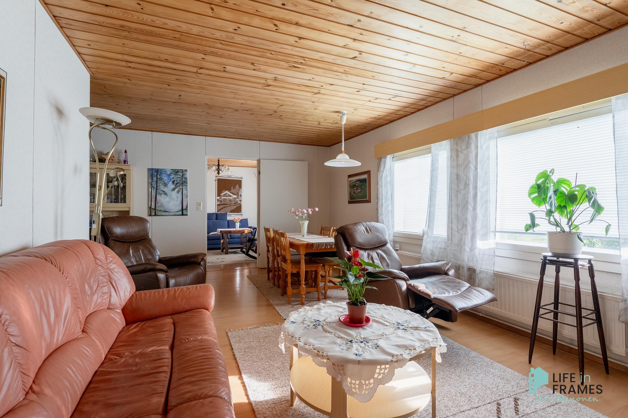 - Keittiö: Muovimatto, maali. Olohuone: Laminaatti, tapetti. Makuuhuone 1: Muovimatto, tapetti. Makuuhuone 2: Muovimatto, tapetti. Makuuhuone 3: Muovimatto, tapetti. Sauna: Laatta, paneeli. Kylpyhuone: Laatta, kaakeli. Wc: Muovimatto, tapetti.