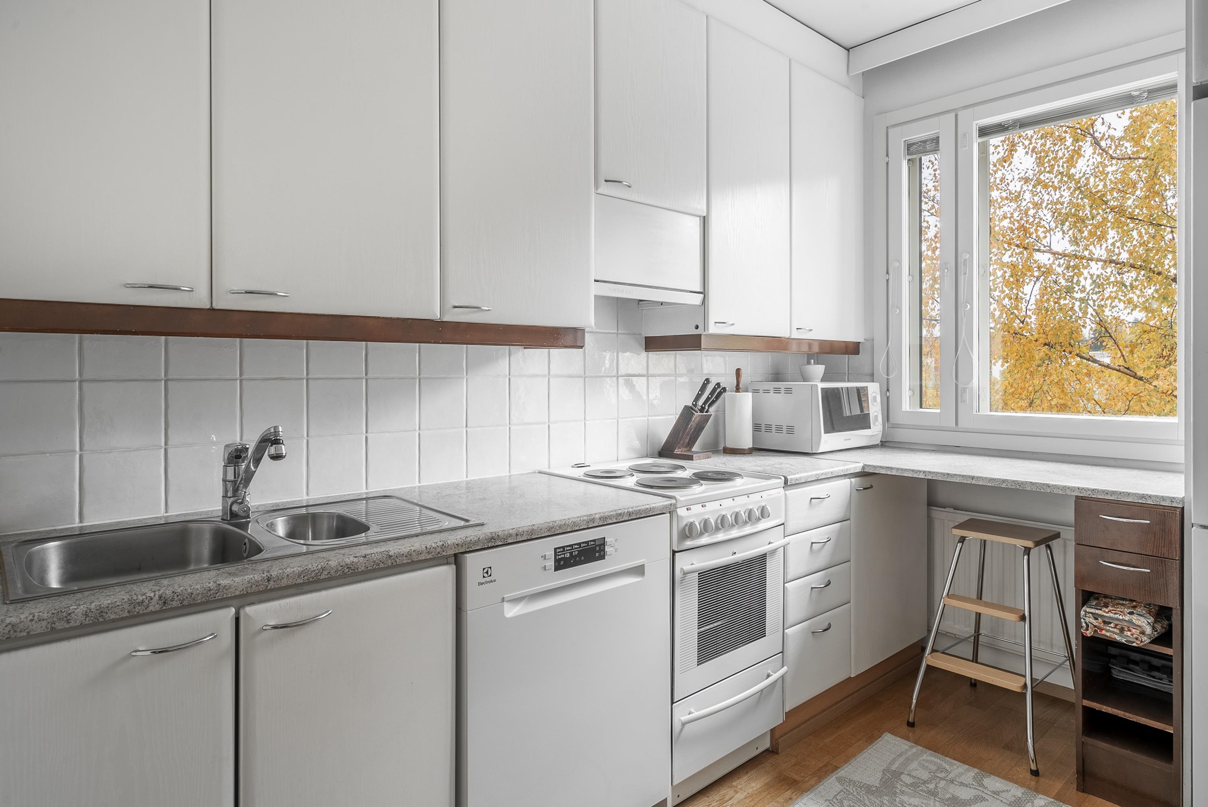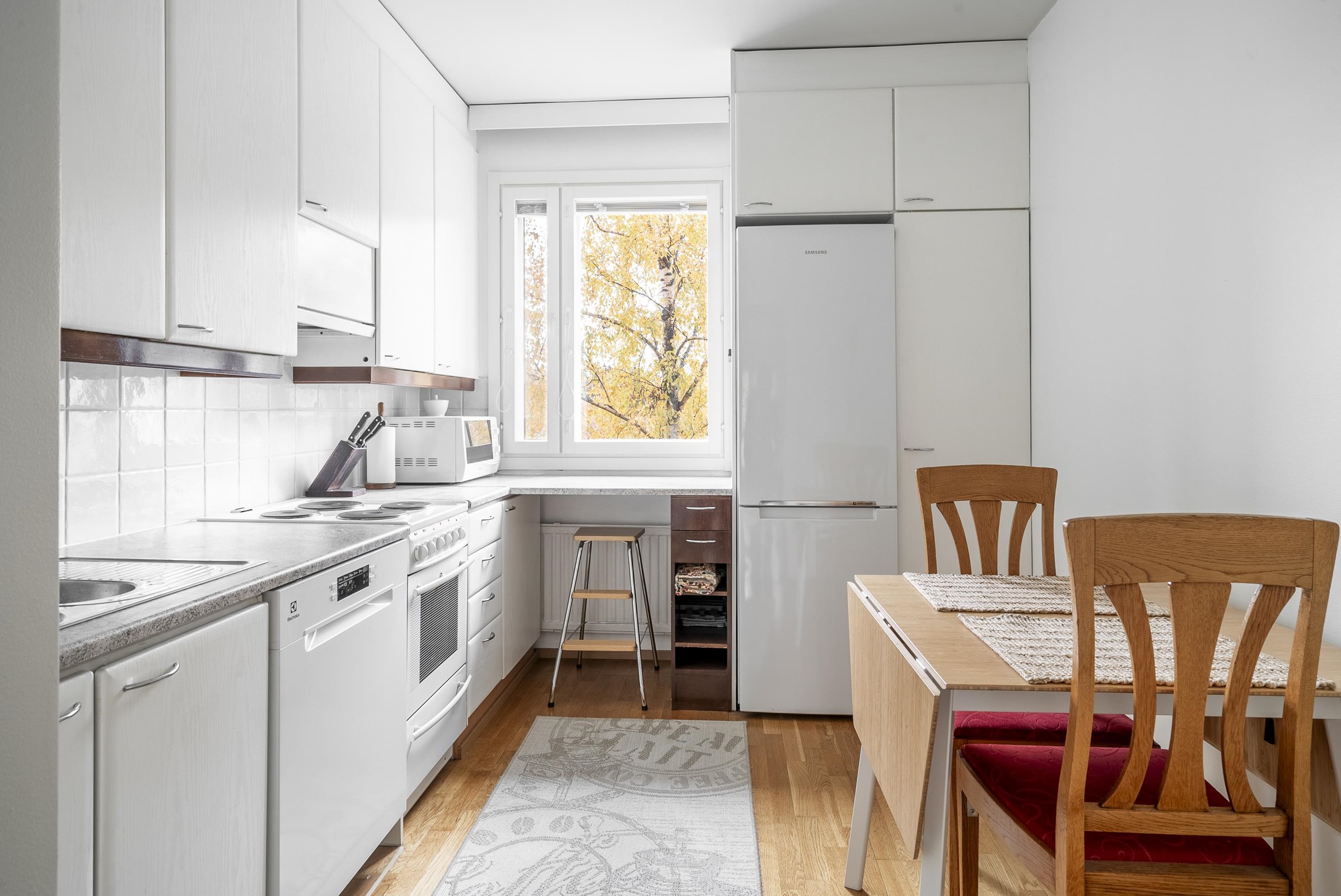 - Jääkaappipakastin, lattialiesi, liesituuletin, astianpesukone, kaapistot, kiinteät valaisimet.