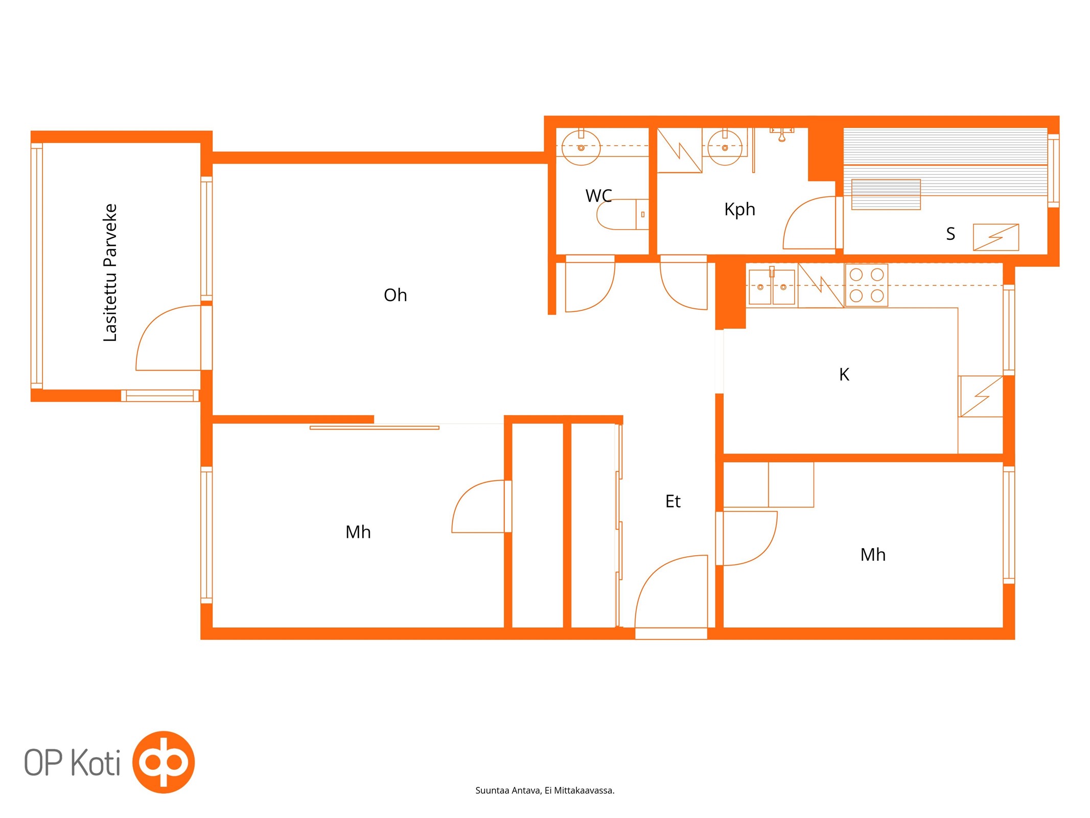 - Parveke, olohuone ja mh1 länteen, keittiö ja mh2 itään.