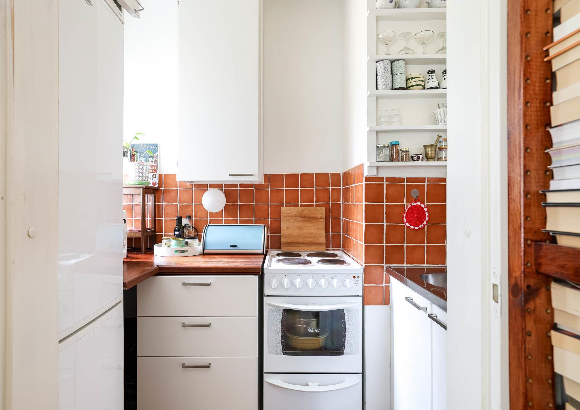 - Keittotilan varusteisiin kuuluvat jääkaappipakastin ja sähköliesi.