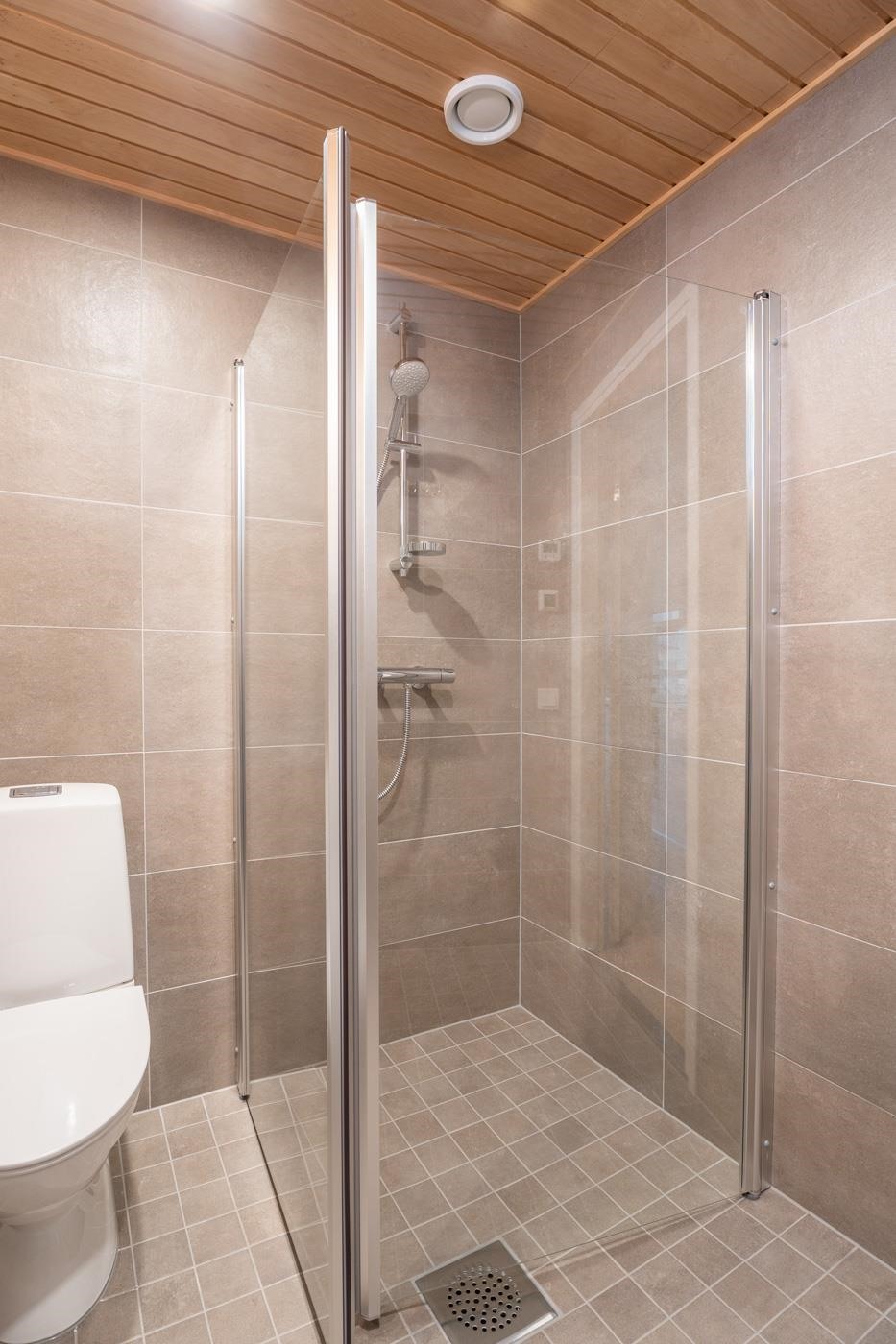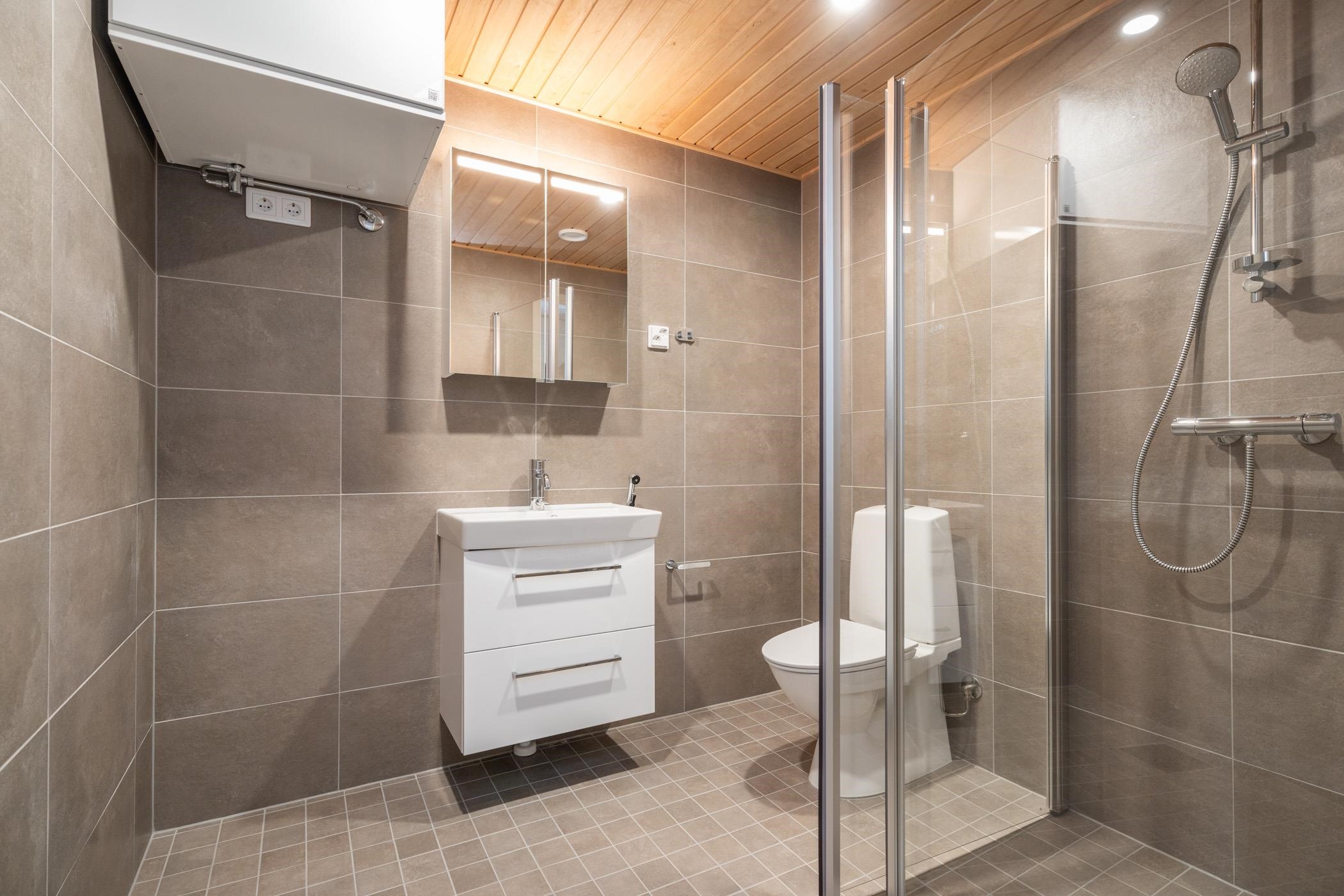 - Kylpyhuoneiden, erillis-wc:iden ja kodinhoitohuoneiden lattiat ja seinä ovat laatoitettuja, katot paneloituja. Saunojen lattiat ovat laatoitettu, seinät ja katot paneloituja. Kylpyhuoneissa, erillis-wc:issä ja kodinhoitohuoneissa kiintokalustus on toteutettu pohjapiirustusten mukaisesti. Kylpyhuoneissa ja erillis-wc:ssä on allaslaatikosto ja peilikaappi suunnitelmien mukaisesti. Kylpyhuoneessa on varaus pyykinpesukoneelle ja kuivausrummulle. Löylyhuoneissa on pilarimallinen sähkökiuas, jonka säätimet on asennettu löylyhuoneen seinään.