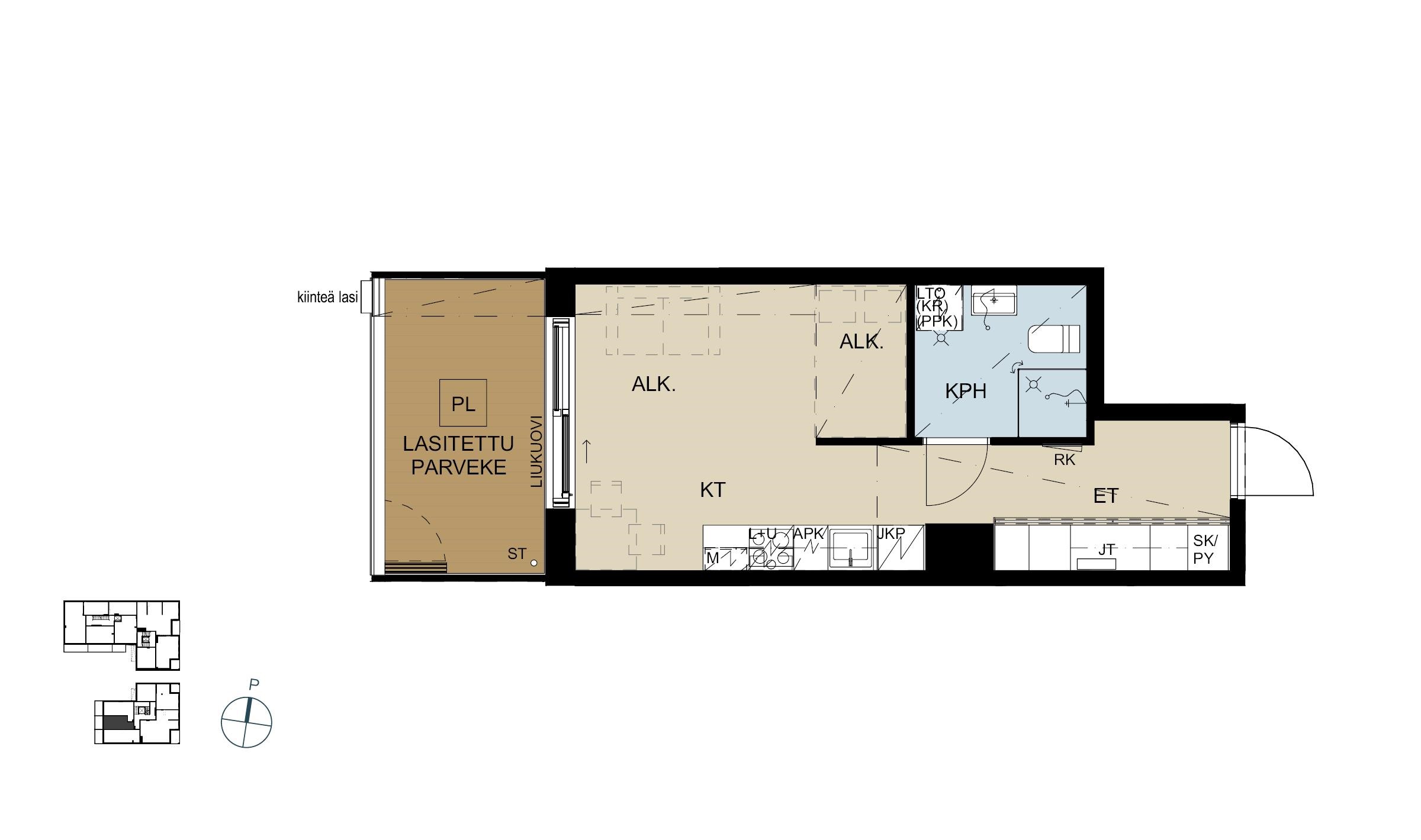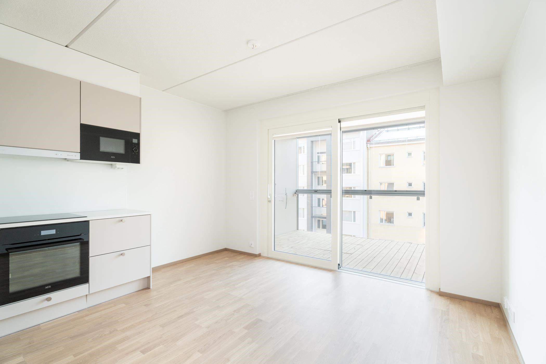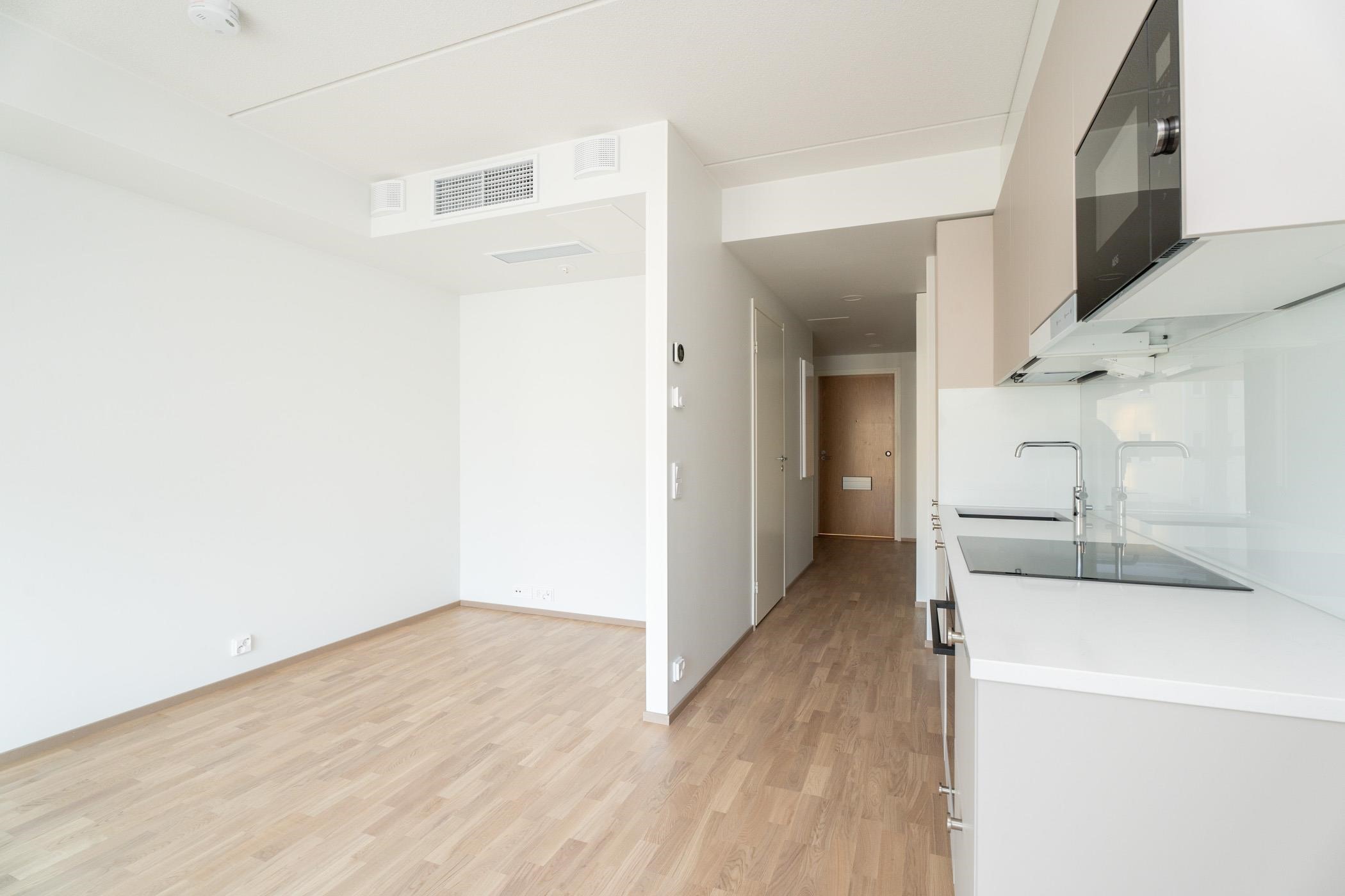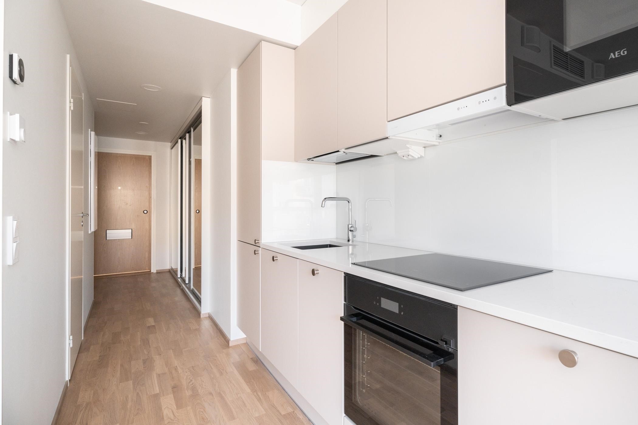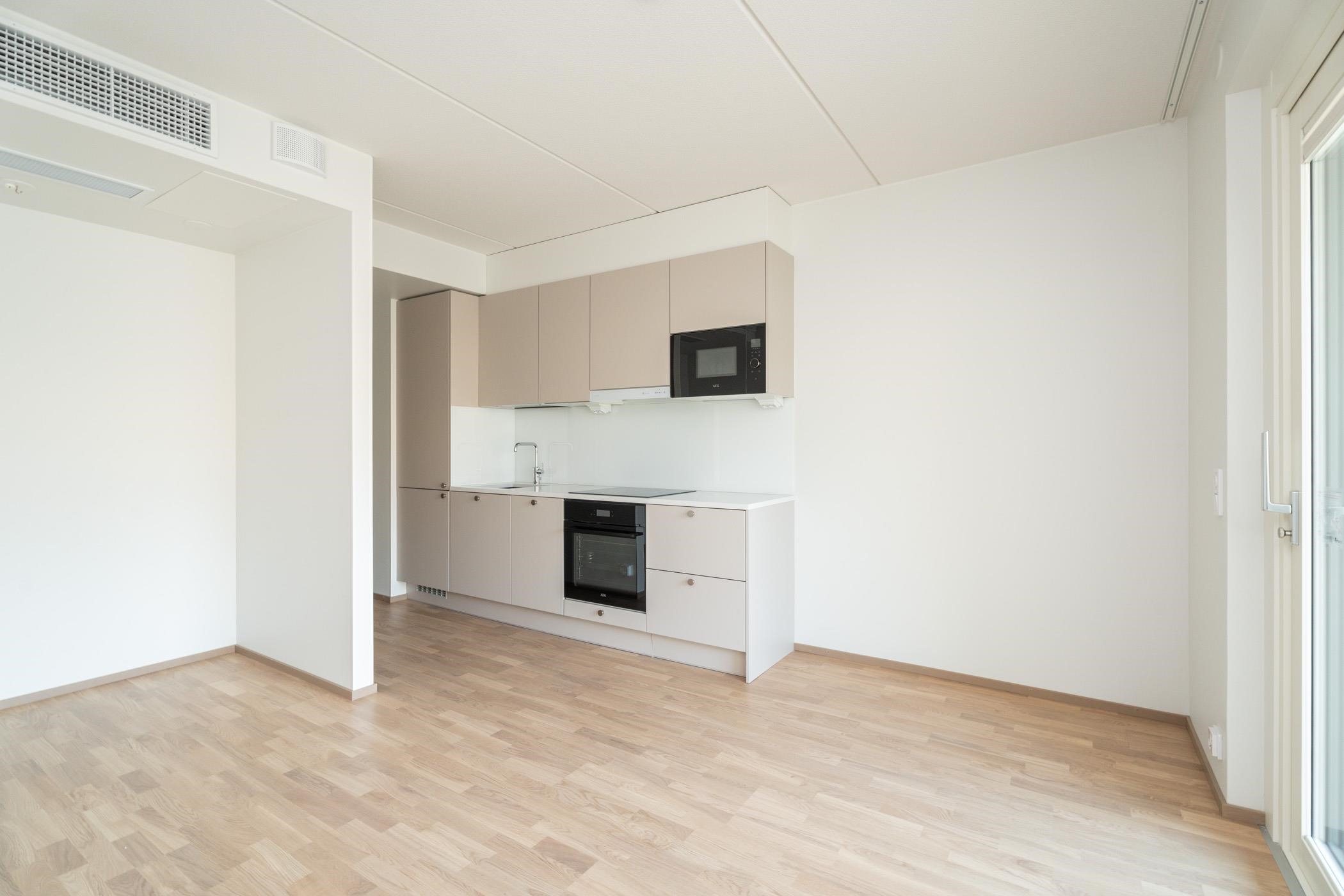 - Keittiökalusteiden ovet ovat maalattua tai lakattua mdf-levyä tai viilupintaisia kalusteovia. Keittiön työpöytätasot ovat kiveä tai kvartsisekoitetta. Keittiön pesuallas on terästä tai komposiittimateriaalia. Ylä- ja alakaappien välissä on välitilalasi. Keittiöissä on induktiotaso, erillisuuni ja mikroaaltouuni. Astianpesukoneet ja kylmäkalusteet ovat kalusteovipeitteisiä. Asunnoissa on pohjapiirustusten mukaisesti joko jääkaappipakastin tai erilliset jääkaappi ja kaappipakastin.