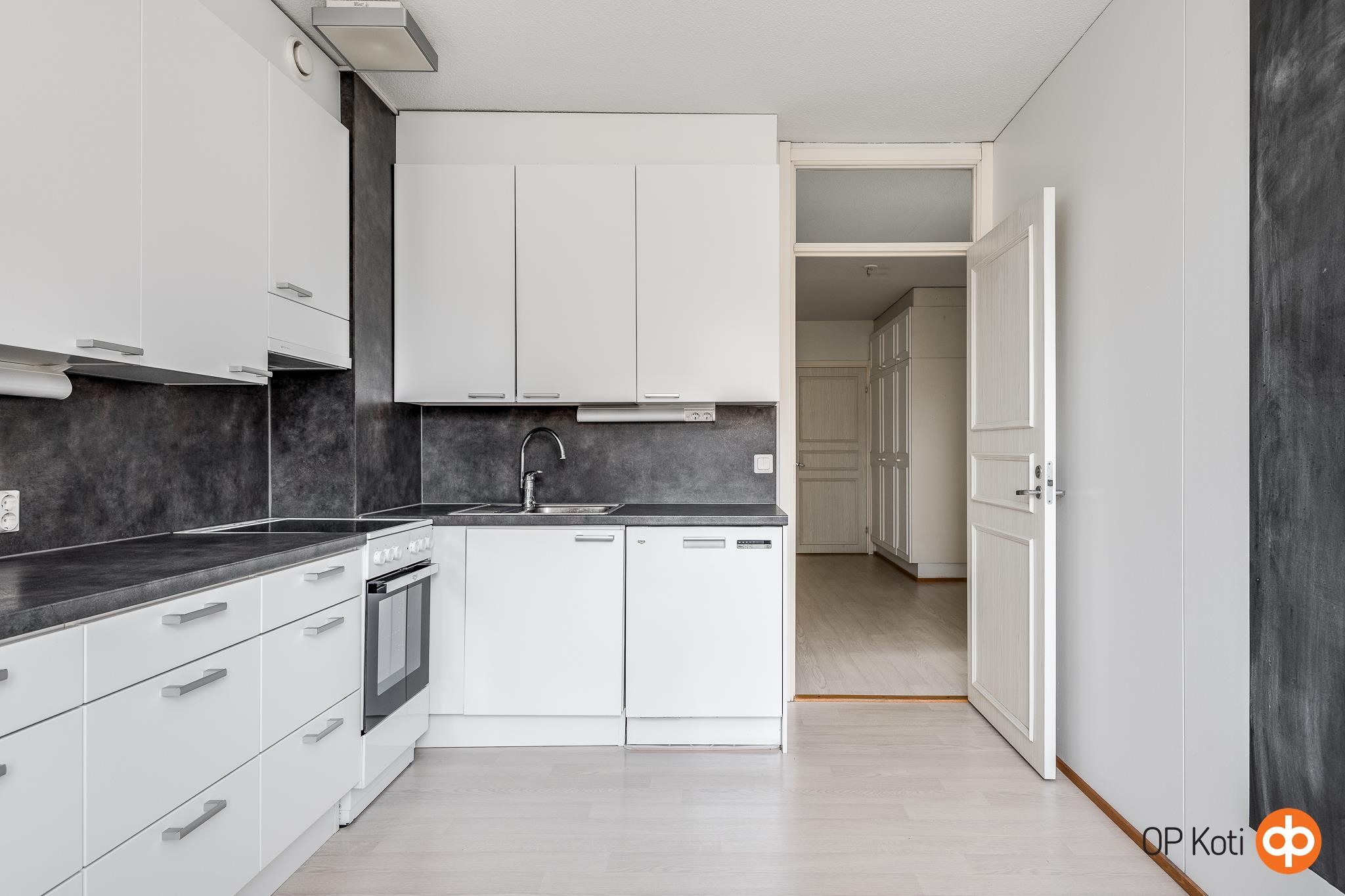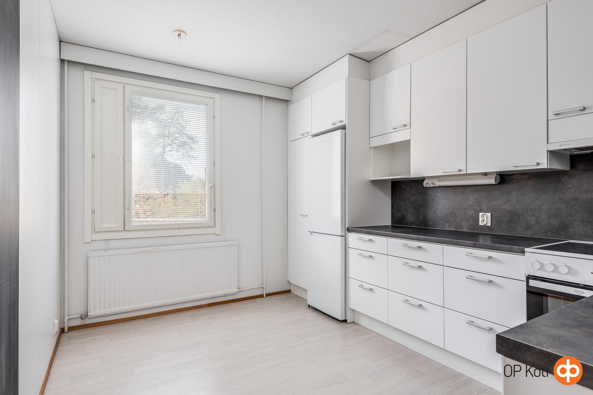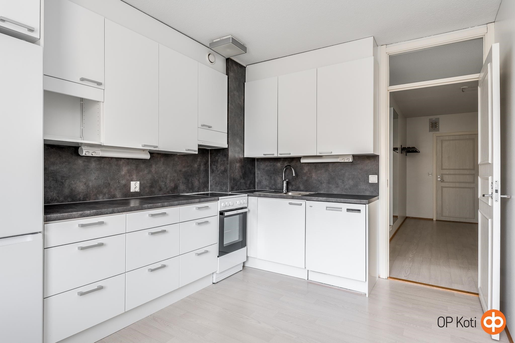 - Jääkaappipakastin (uusittu 2025), keraaminen liesi (uusittu 2025), liesituuletin (uusittu 2014), astianpesukone (uusittu 2014), kaapistot, kiinteät valaisimet. Keittiön kaapistot on uusittu vuonna 2014. Kaapistoissa valkeat ja sileät mdf-pintaiset ovet.
