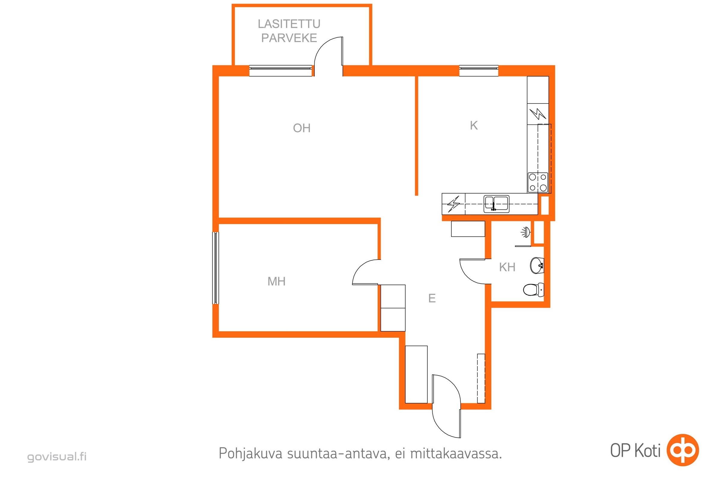 - Kulmahuoneisto, olohuoneen ja keittiön ikkunat etelän suuntaan ja makuuhuoneen ikkunat idän suuntaan.
