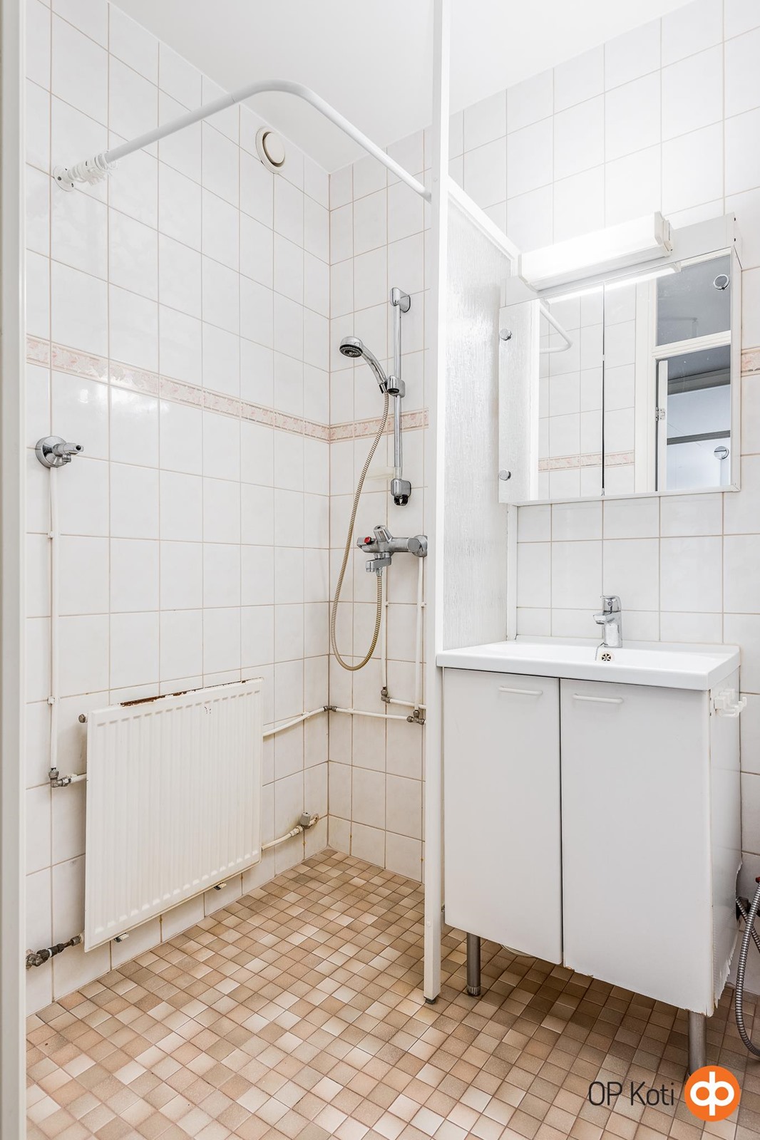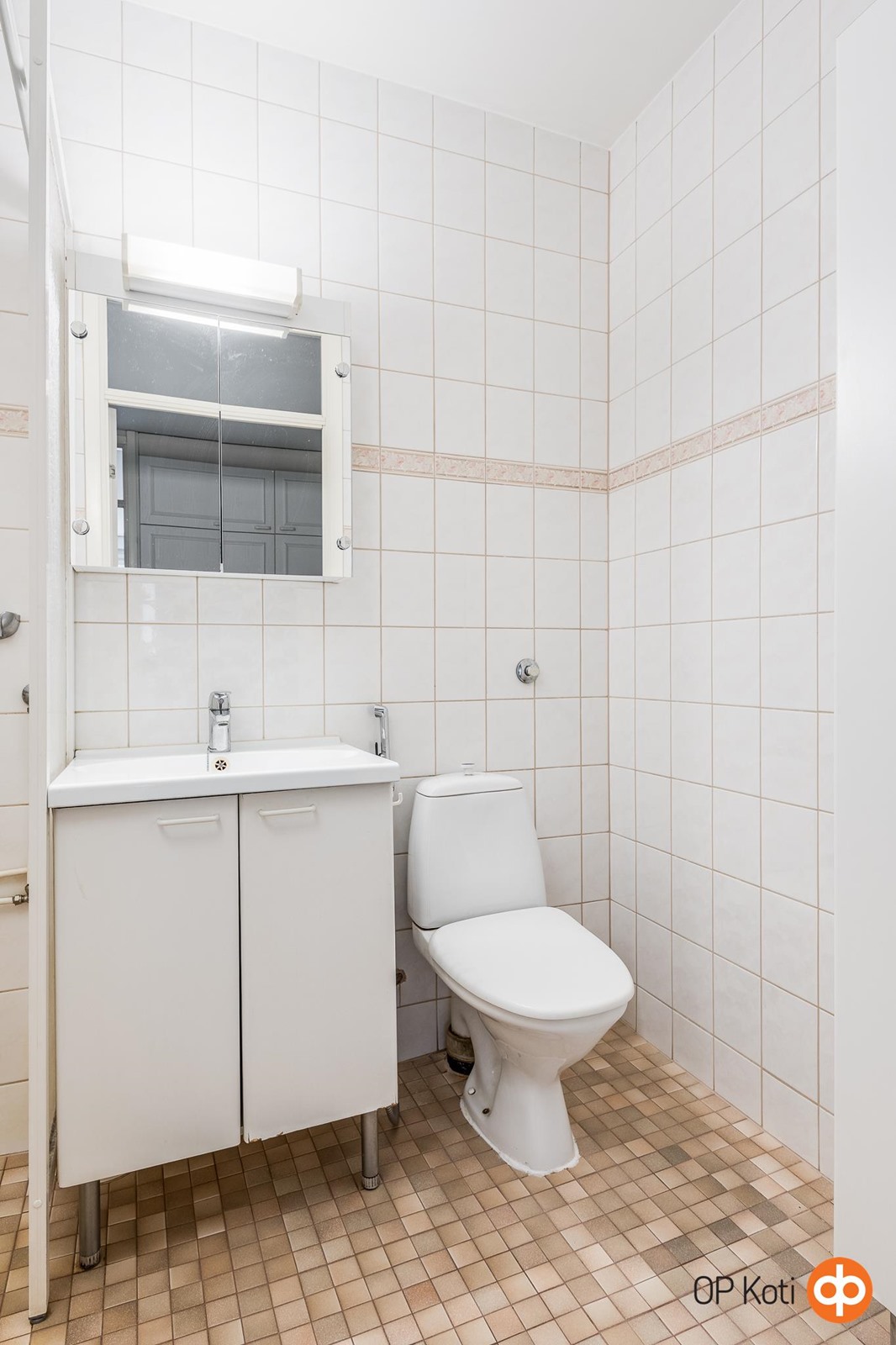 - Sähkökiuas, suihku, suihkuseinä, peilikaappi, allaskaappi, pesukoneliitäntä, kiinteät valaisimet.