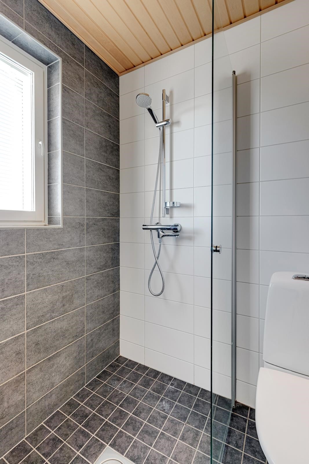 - Kylpyhuone, suihku, suihkuseinä, peilit, allaskaappi, pesukoneliitäntä, lattialämmitys, kiinteät valaisimet.