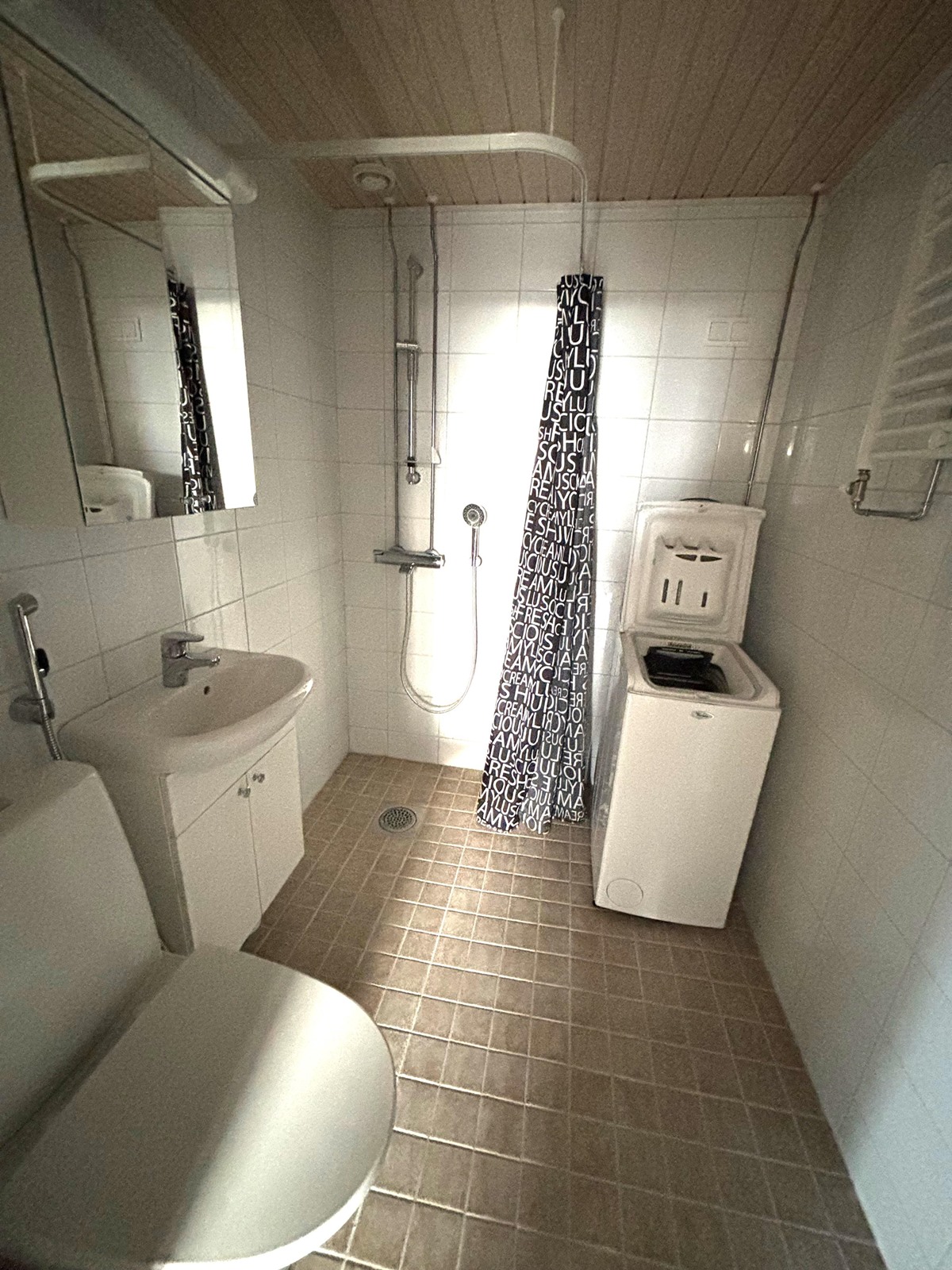 - Suihku, peilit, pesukoneliitäntä.