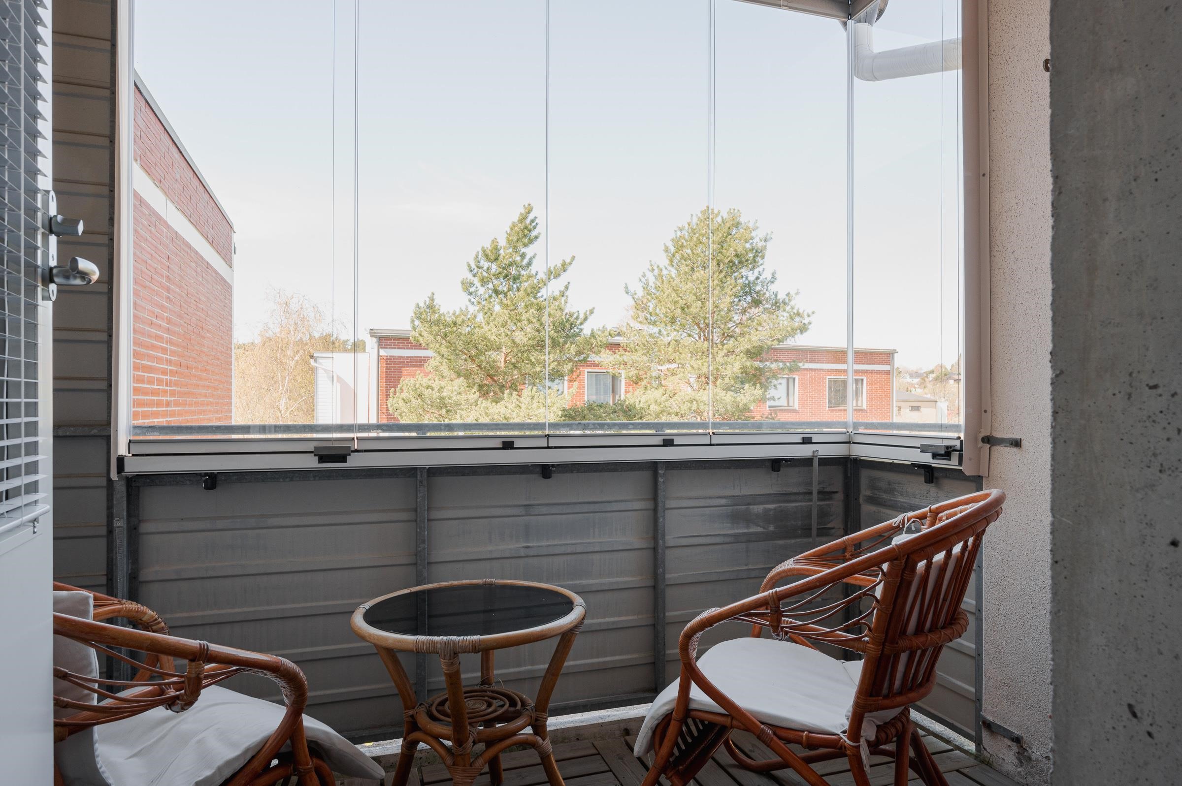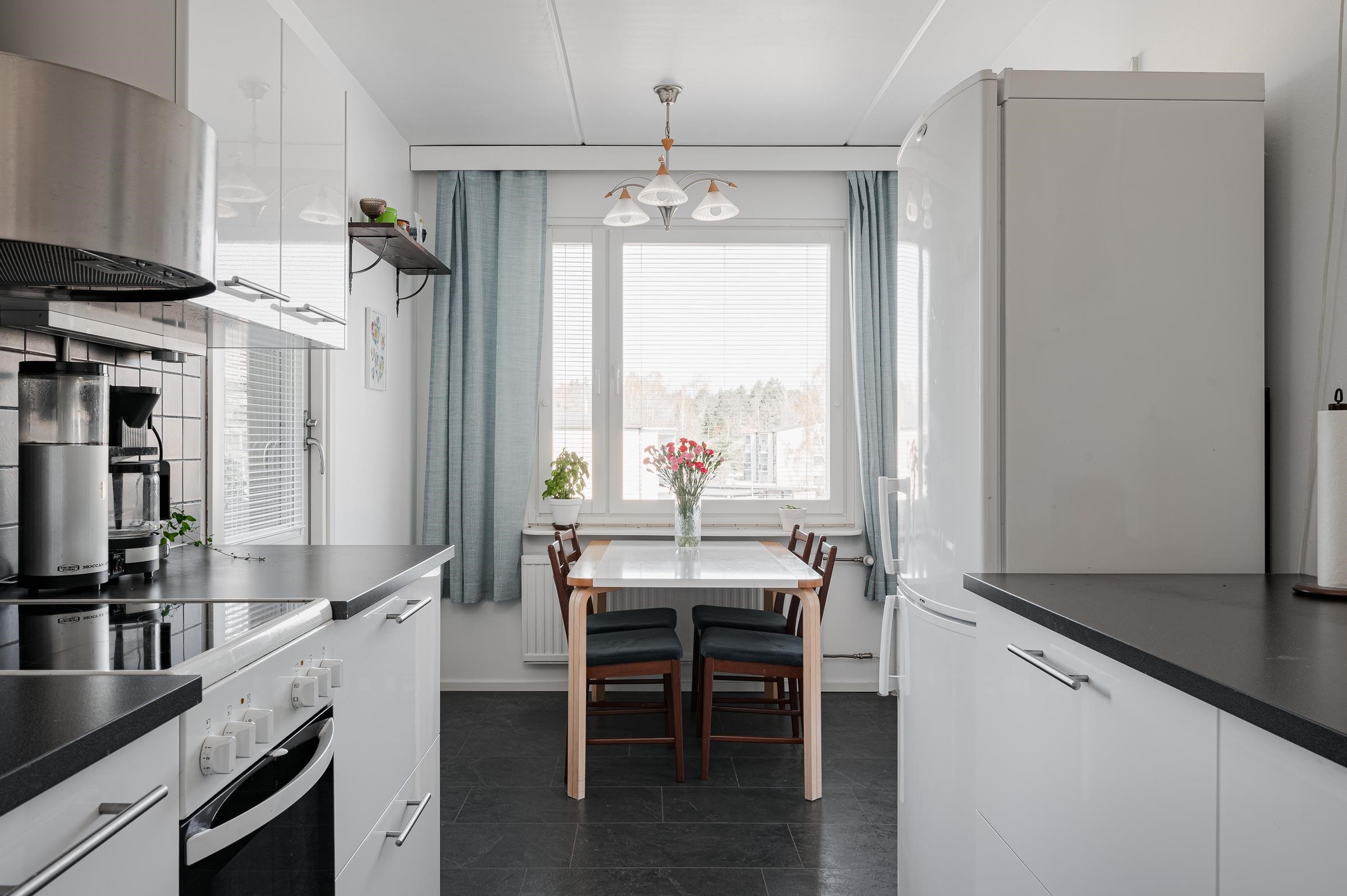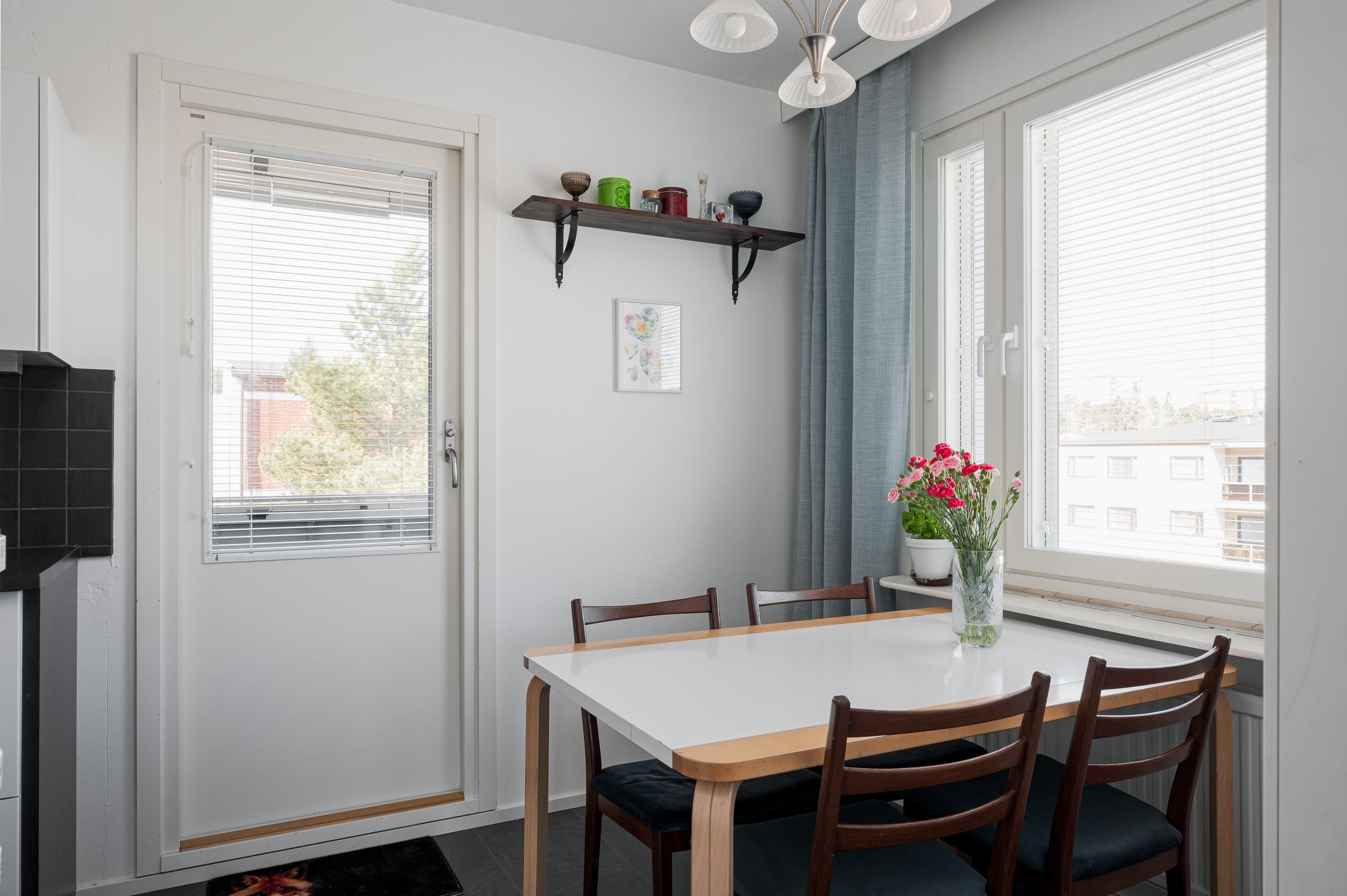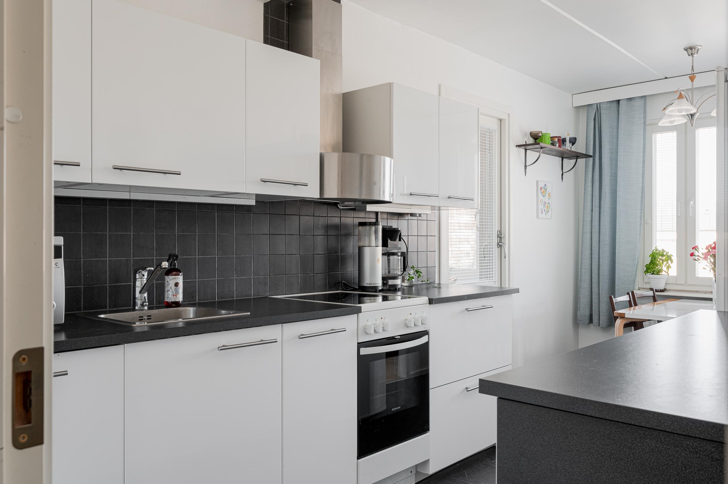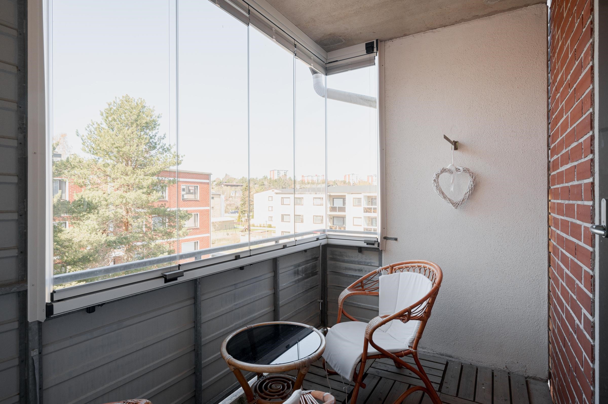 Huoneiston pinnat ovat siistit ja kolmeen eri suuntaan sijoittuvat ikkunat tuovat ihanasti luonnonvaloa asuntoon. Keittiöstä kulku käy lasitetulle parvekkeelle, jossa voi nauttia ilta-auringosta. Parvekkeelle on asennettu myös ns. aurinkoverhot.