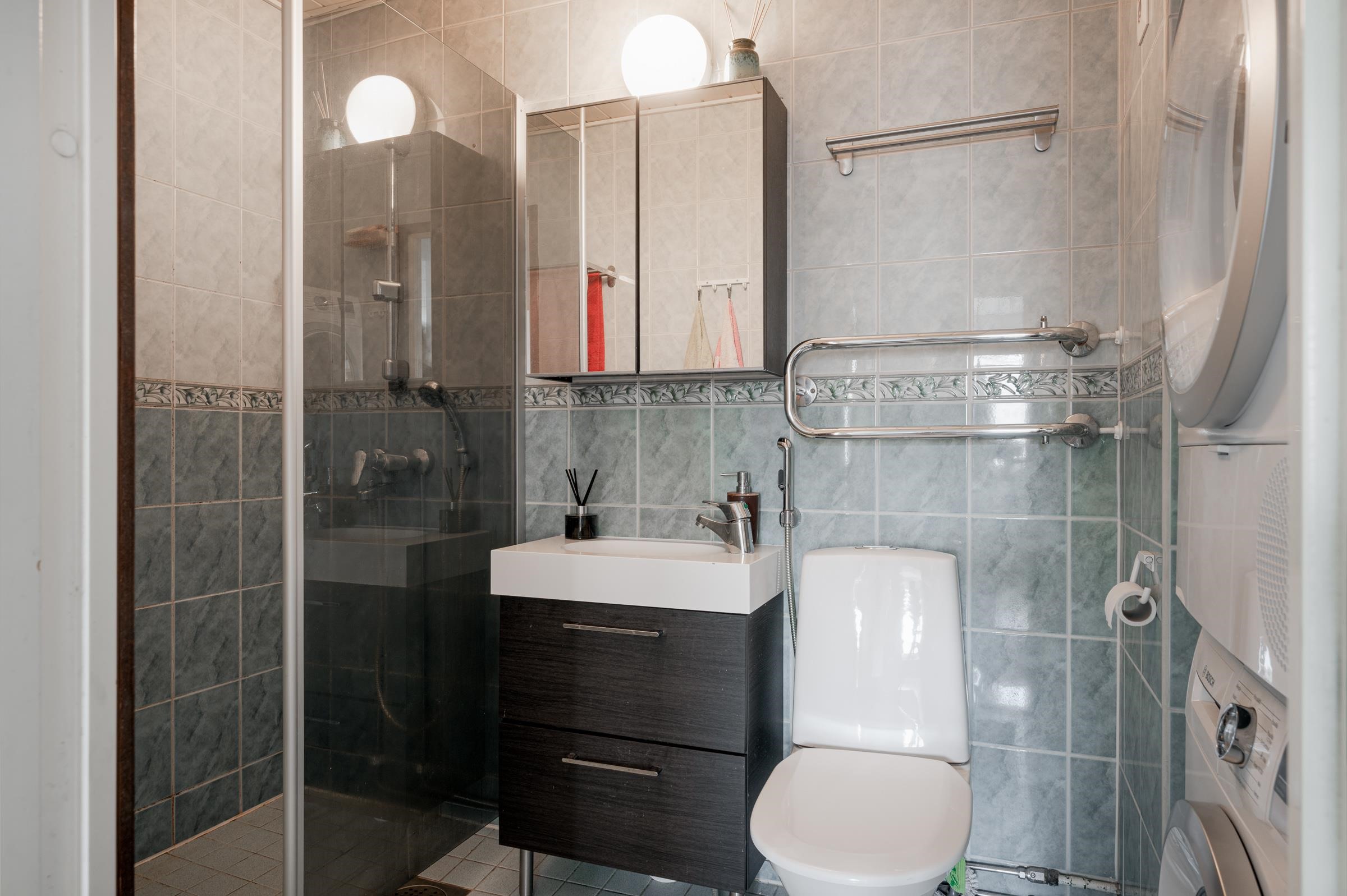 - Kylpyhuone, suihku, suihkuseinä, peilikaappi, allaskaappi, pesukoneliitäntä, kiinteät valaisimet.
