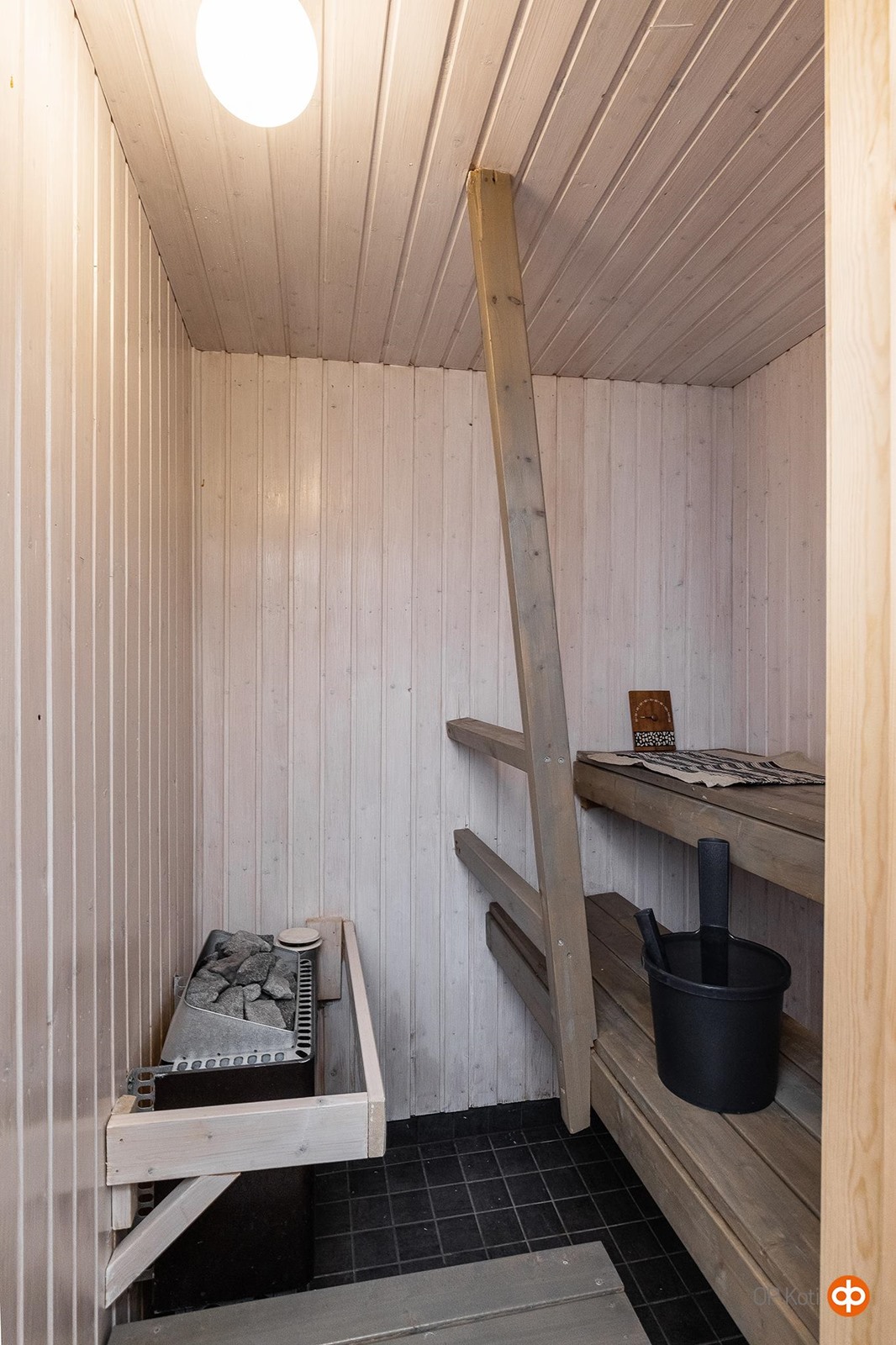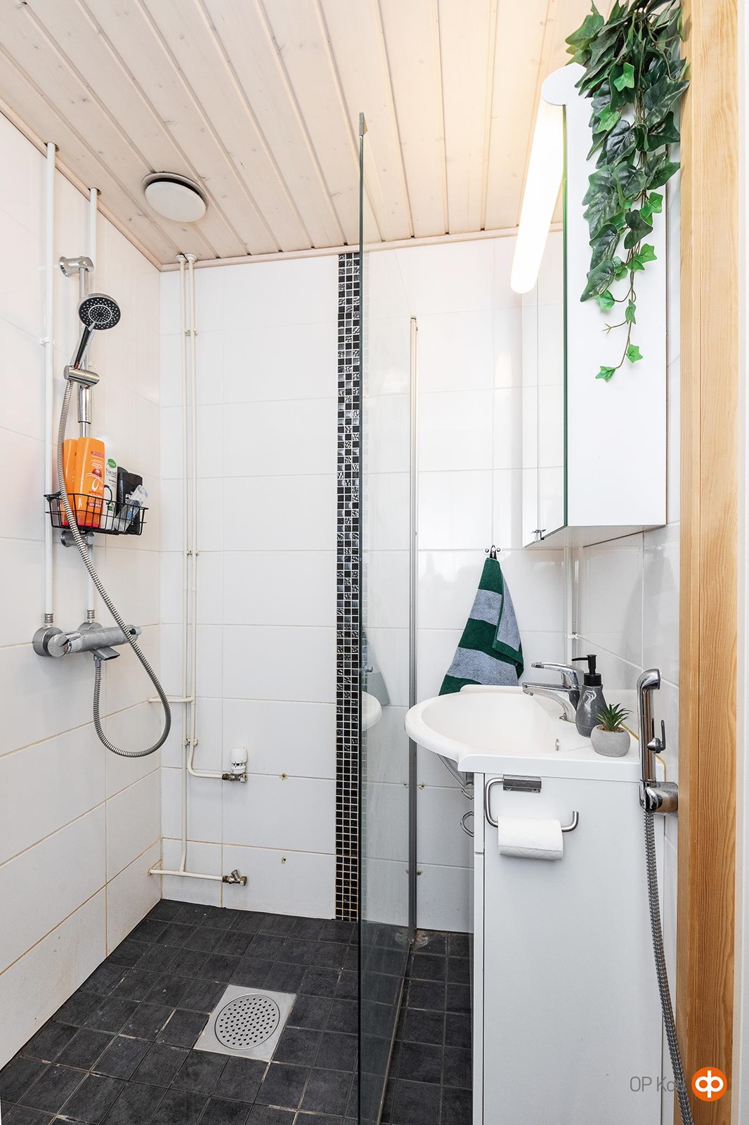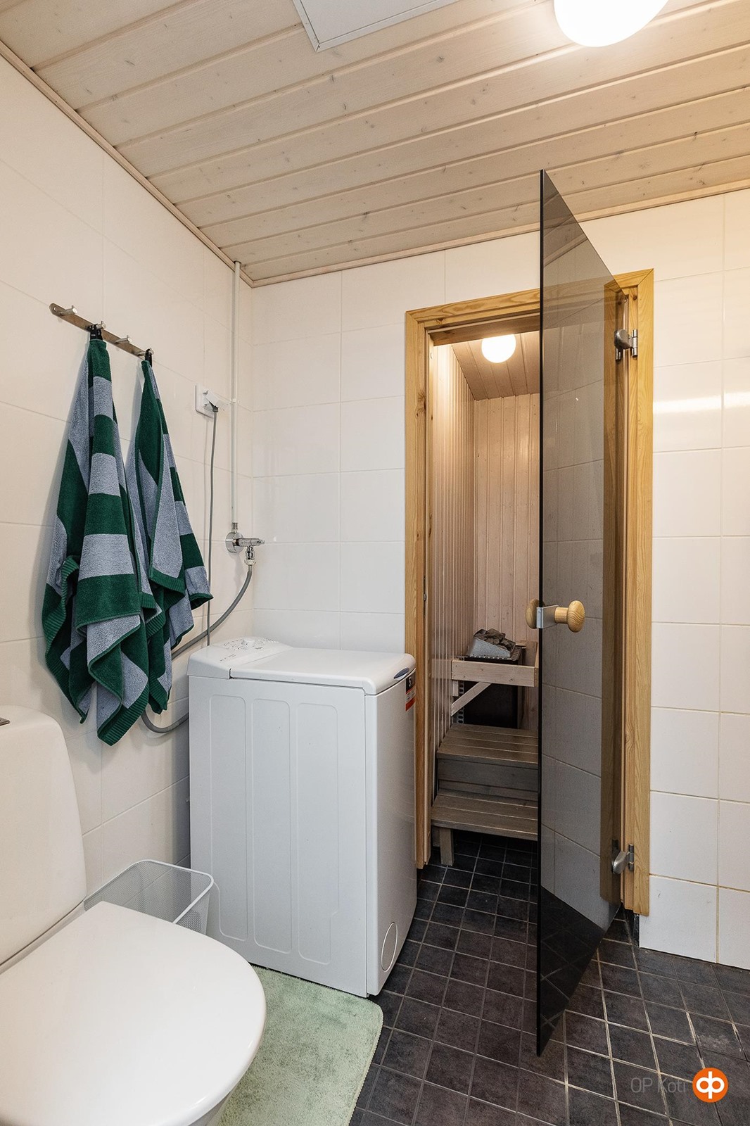 - Sauna, sähkökiuas, kylpyhuone, suihku, suihkuseinä taitettava, peilikaappi, allaskaappi, pesukoneliitäntä, lattialämmitys kylpyhuoneessa, kiinteät valaisimet. Toiminnallinen tilavahko kylpyhuone, joka remontoitu yhtiön valvonnassa vuonna 2016. Neutraalit aikaa kestävät kaakeloinnit sähkötoimisella lattialämmityksellä. Hyvä paikka pesukoneelle ja kuivausrummulle. Tilava sauna, jonka lauteet ja paneelit pintakäsitelty muutama vuosi sitten.