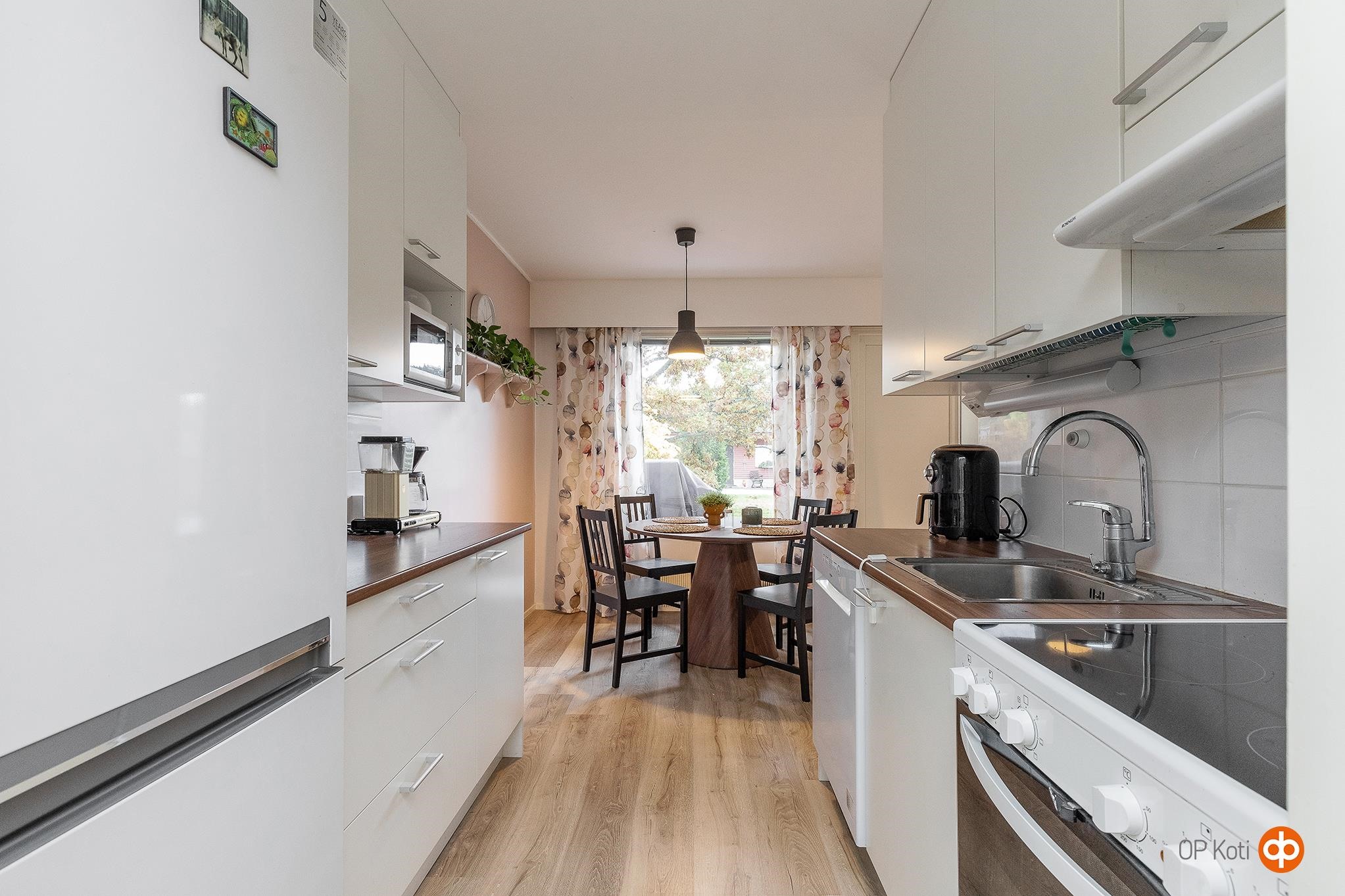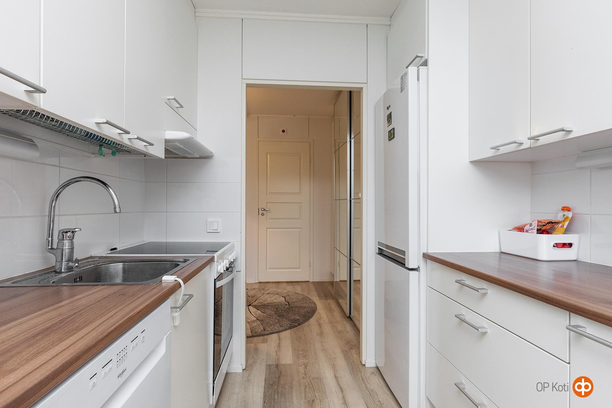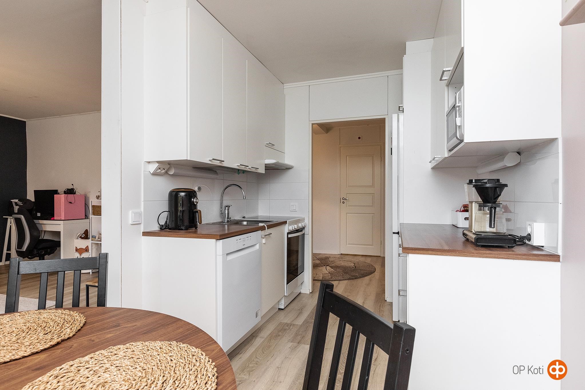 - Jääkaappipakastin, keraaminen liesi, liesituuletin, astianpesukone, kaapistot, kiinteät valaisimet. Tilava osittain olohuoneen yhteydessä oleva vaalea keittiö. Mukavasti kaapistoja ja laskutilaa kahdella seinustalla. Keittiön ruokailutilaa aukeaa onnistuneesti olohuoneeseen. Hyvä tila suuremmalekin ruokapöydälle. Keittiö remontoitu 2016.