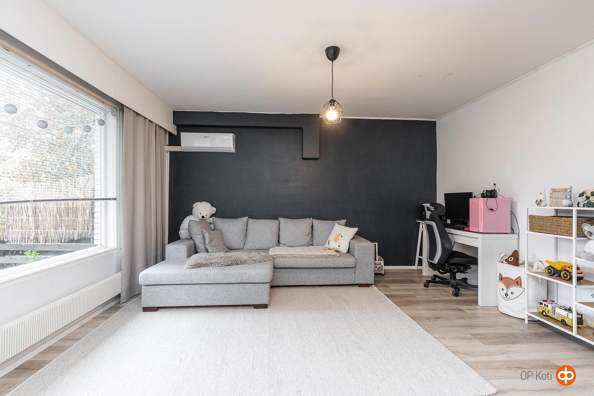 Asunnon reilut neliöt näkyvät huonetilojen avaruutena. Keittiön tilava ruokailutila aukeaa onnistuneesti asunnon poikkeuksellisen suureen olohuoneeseen, yhtenäinen valoisa tilakokonaisuusuus suurilla ikkunoilla. Makuuhuoneen yhteydessä vaatehuone ja tarvittaessa tilaa suuremmallekin työpisteelle. Keittiön ja kylpyhuoneen välissä aulatila, johon saatu tarvittavia kaapistoja. Kodissa toiminnallinen tilavahko kylpyhuone ja mukavan kokoinen sauna. Asunnossa yhtenäiset laminaattilattiat ja maalatut seinäpinnat. Vaalea neutraali keittiö ja pesutiloissa aikaa kestävät kaakeloinnit sähkötoimisella lattialämmityksellä. Hyväkuntoinen ja tasapainoinen kokonaisuus.